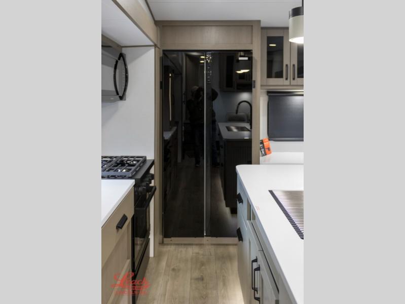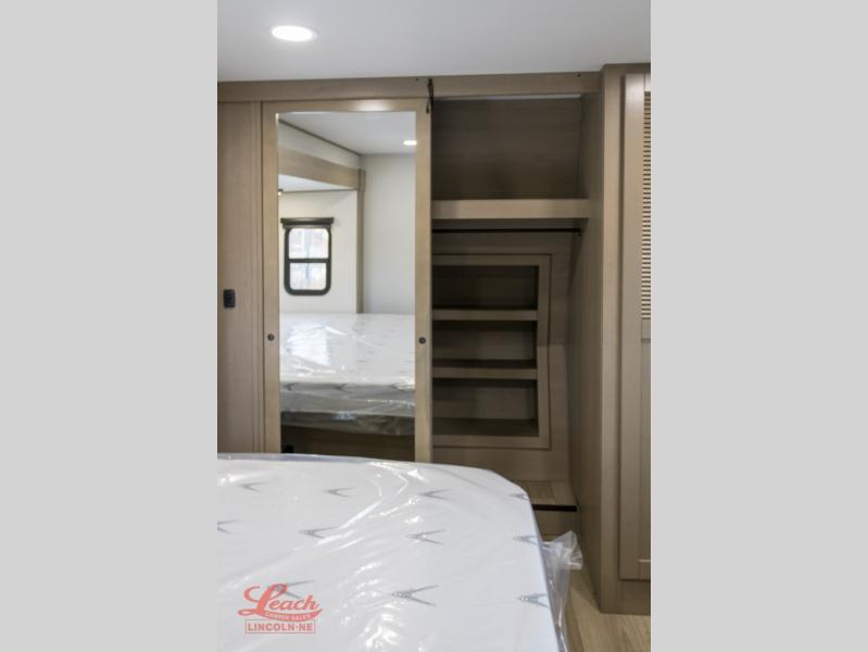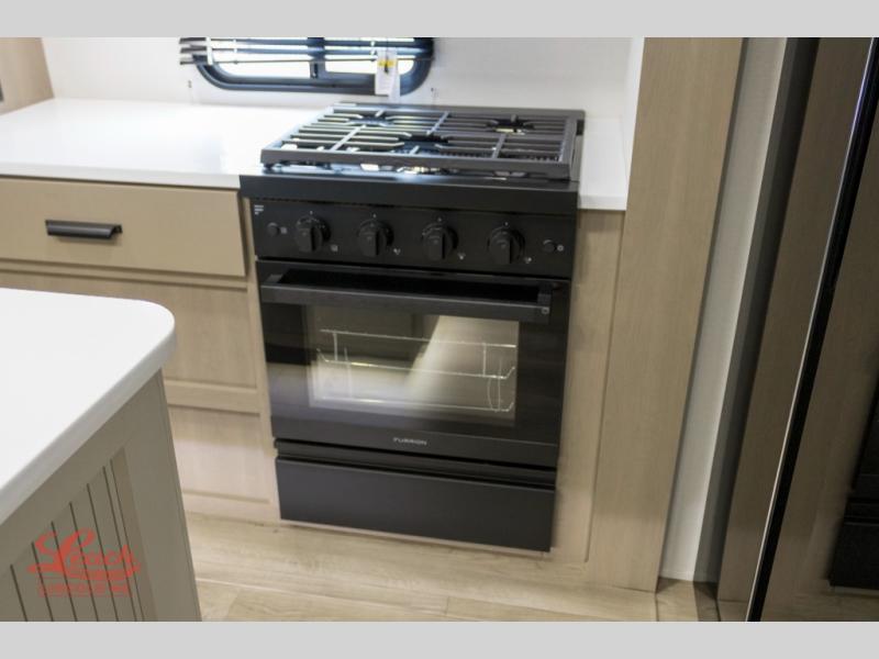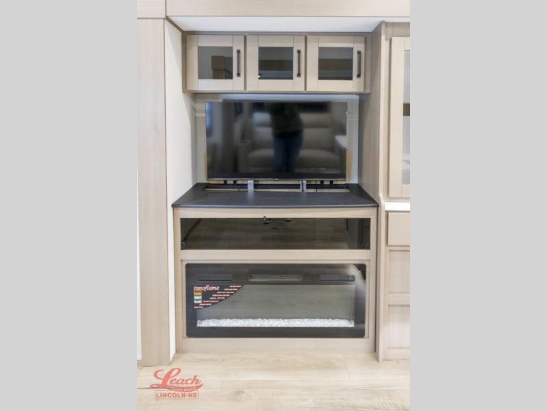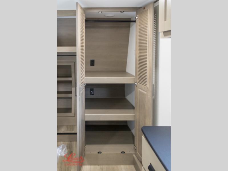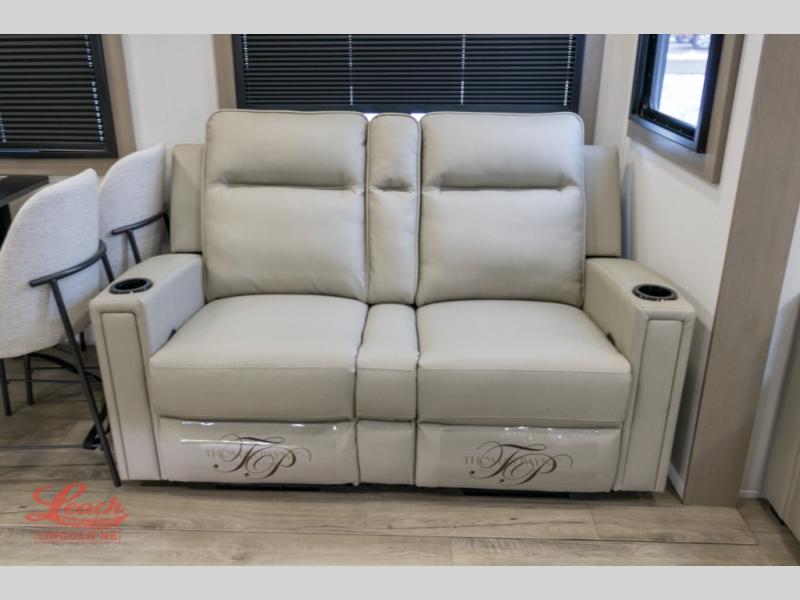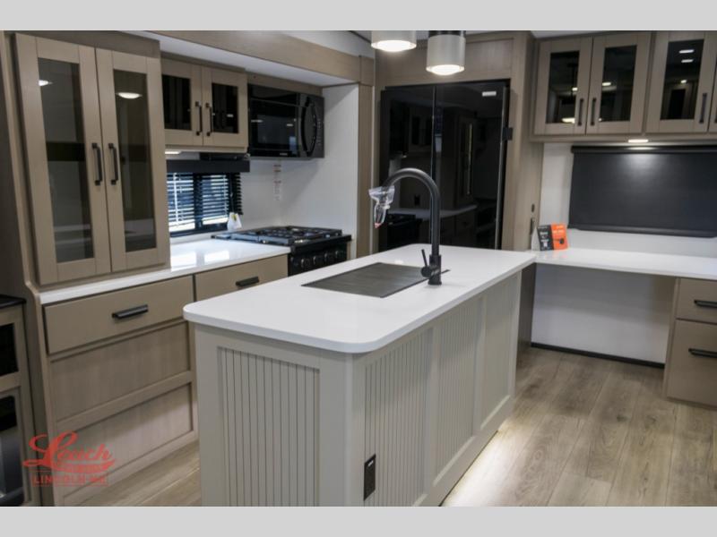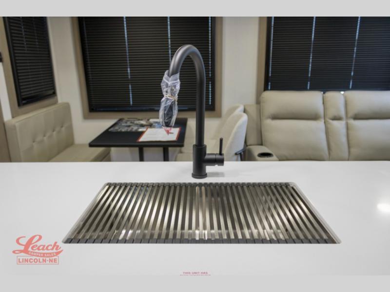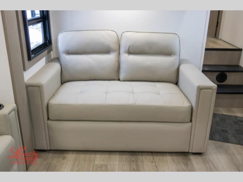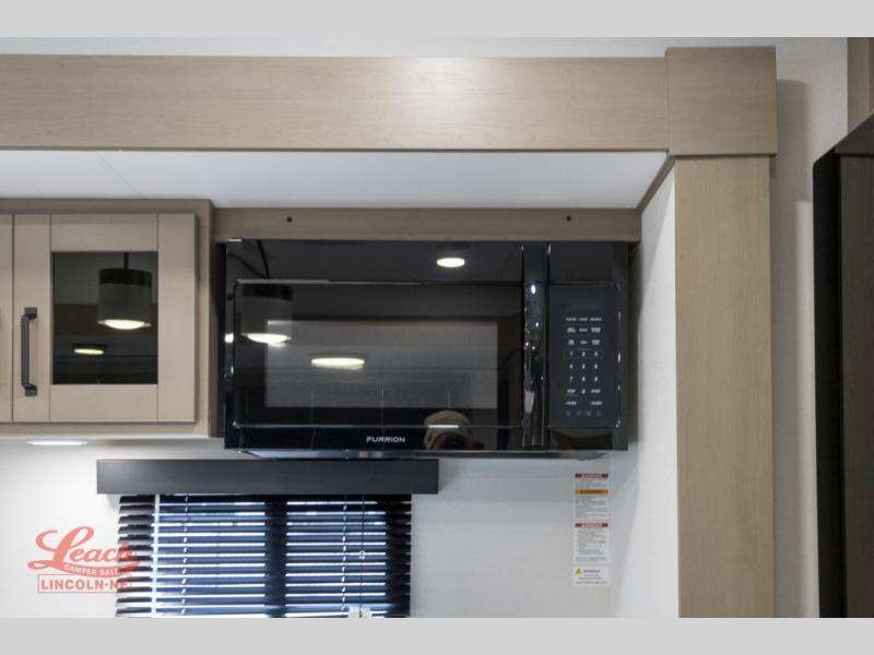 Comfortable accommodations are found throughout this fifth wheel so you can relax, unwind and enjoy your vacation be it for a weekend or a month and even when you have to work! Thanks to the rear desk with a chair and the bedroom with washer and dryer prep, you could stay in this RV as long as you like and keep all your clothes and linens clean. The front bedroom also provides a front wall wardrobe, a slide out queen bed and a dresser. The spacious shower has a glass door and there is linen storage in the full bathroom. The spacious main living and kitchen area has two slide outs with full kitchen amenities and seating with theater seats including cupholders, a booth dinette, and a tri-fold sofa. And the exterior offers an outside kitchen with a griddle, a 1.6 cu ft. refrigerator, and two power awnings!