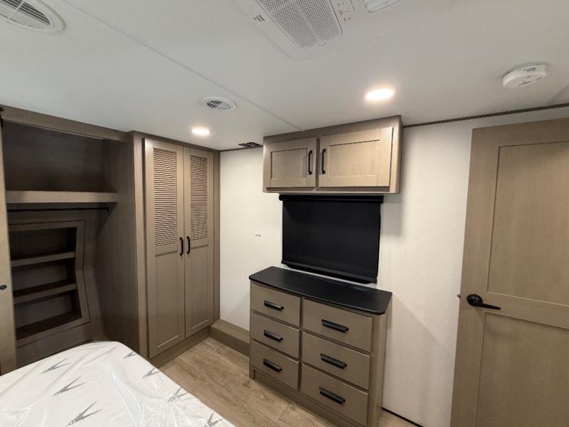 Comfortable accommodations are found throughout this fifth wheel so you can relax, unwind and enjoy your vacation be it for a weekend or a month and even when you have to work! Thanks to the rear desk with a chair and the bedroom with washer and dryer prep, you could stay in this RV as long as you like and keep all your clothes and linens clean. The front bedroom also provides a front wall wardrobe, a slide out queen bed and a dresser. The spacious shower has a glass door and there is linen storage in the full bathroom. The spacious main living and kitchen area has two slide outs with full kitchen amenities and seating with theater seats including cupholders, a booth dinette, and a tri-fold sofa. And the exterior offers an outside kitchen with a griddle, a 1.6 cu ft. refrigerator, and two power awnings!