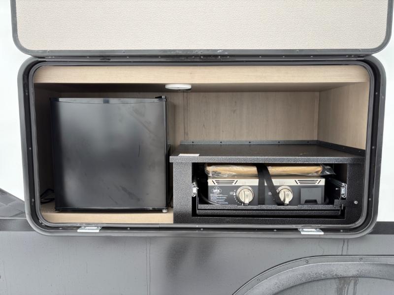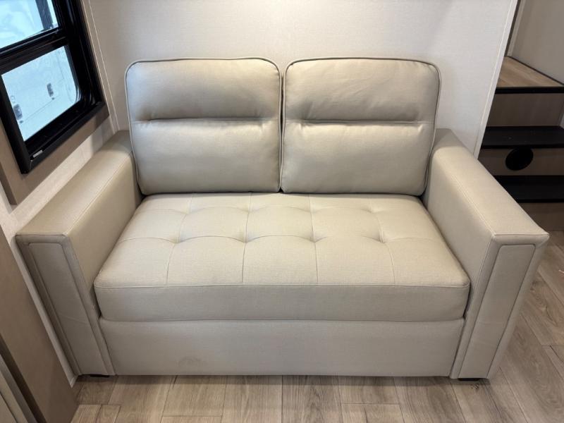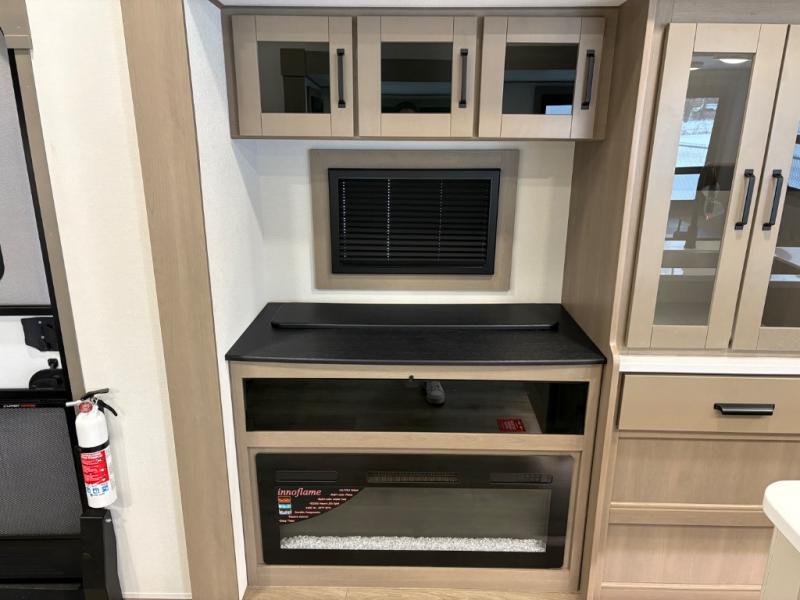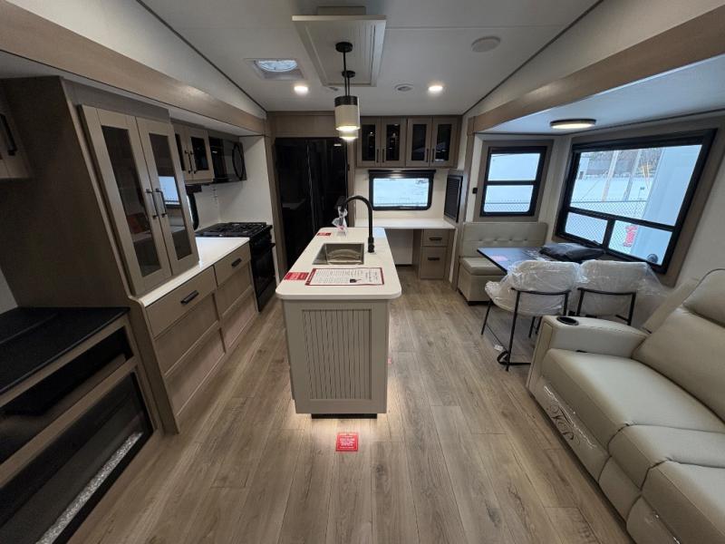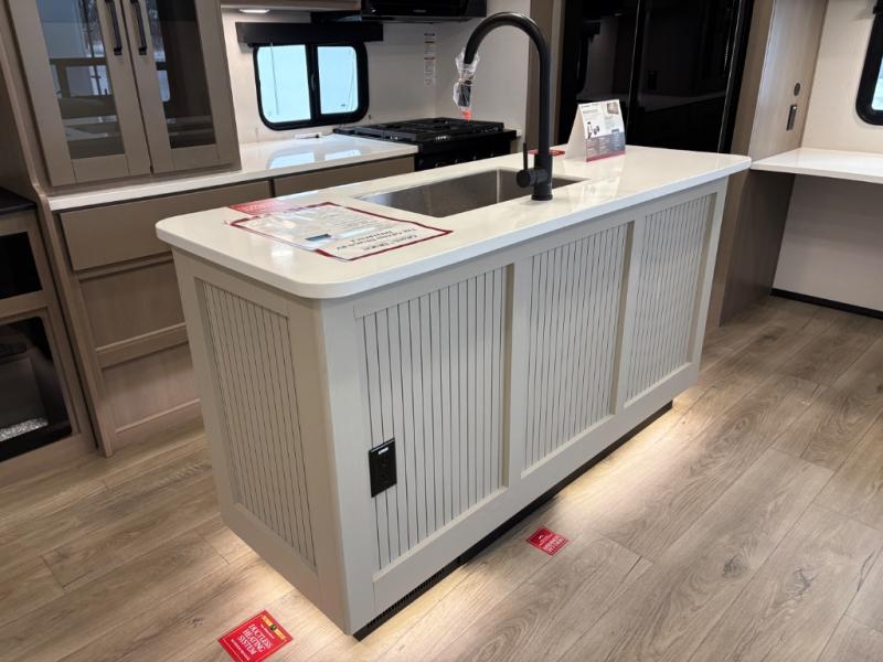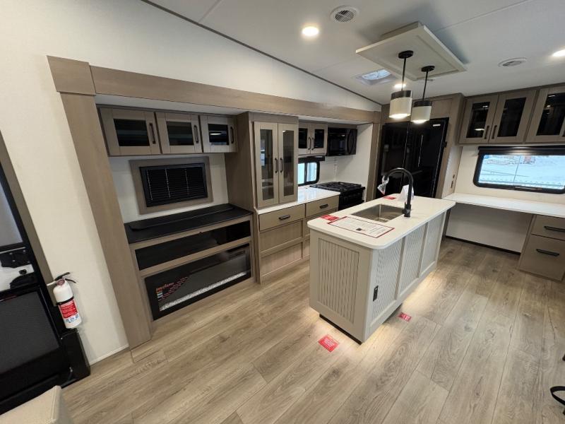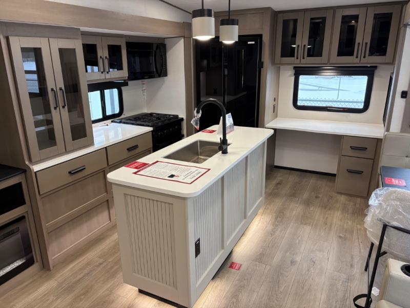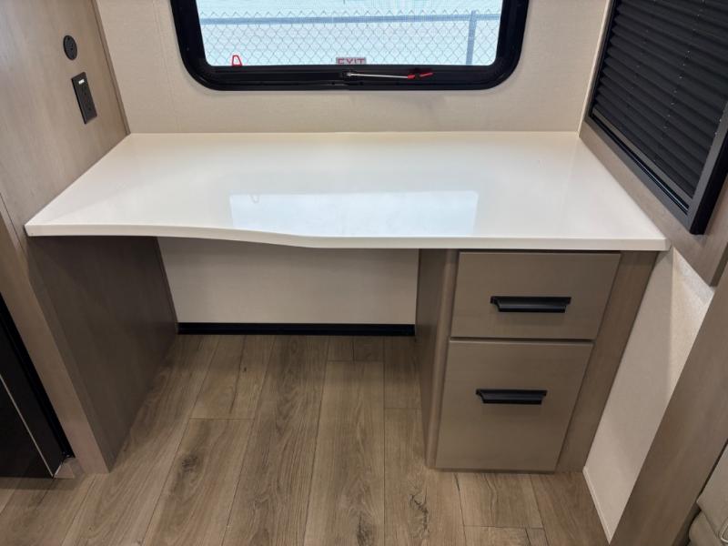 Comfortable accommodations are found throughout this fifth wheel so you can relax, unwind and enjoy your vacation be it for a weekend or a month and even when you have to work! Thanks to the rear desk with a chair and the bedroom with washer and dryer prep, you could stay in this RV as long as you like and keep all your clothes and linens clean. The front bedroom also provides a front wall wardrobe, a slide out queen bed and a dresser. The spacious shower has a glass door and there is linen storage in the full bathroom. The spacious main living and kitchen area has two slide outs with full kitchen amenities and seating with theater seats including cupholders, a booth dinette, and a tri-fold sofa. And the exterior offers an outside kitchen with a griddle, a 1.6 cu ft. refrigerator, and two power awnings!