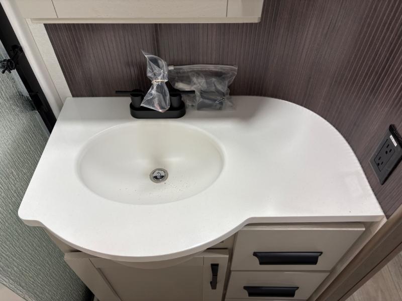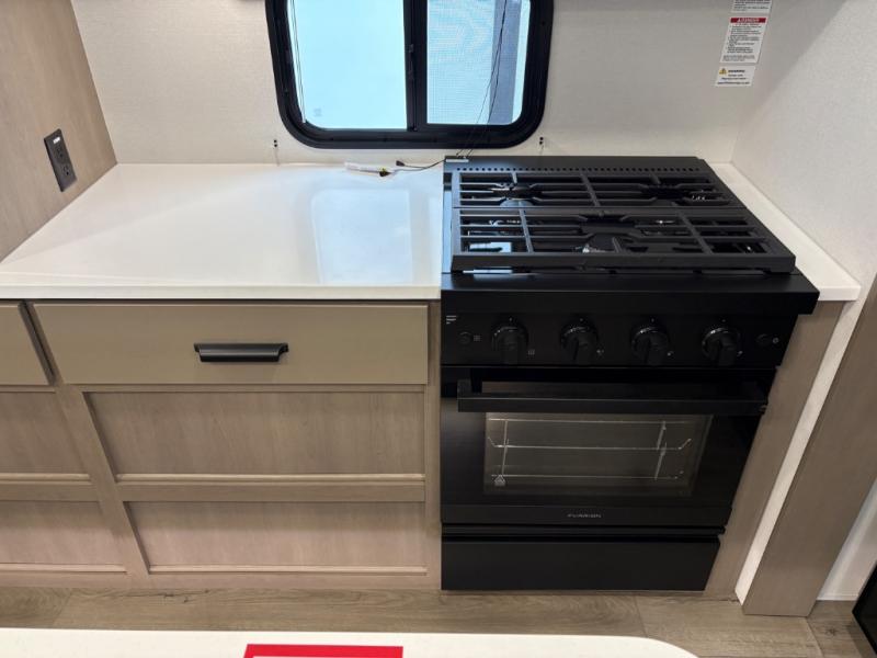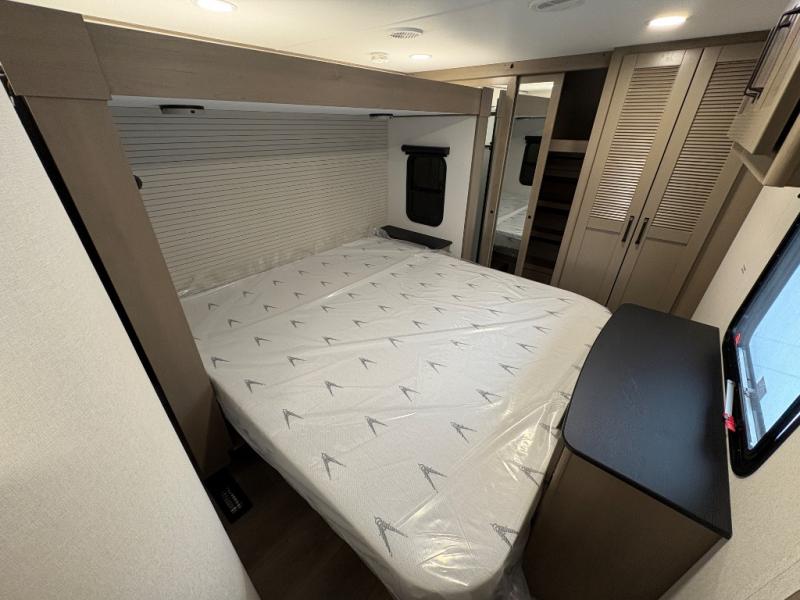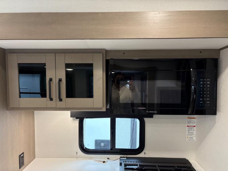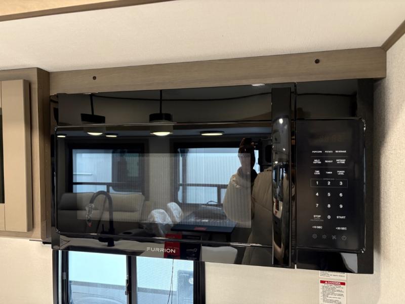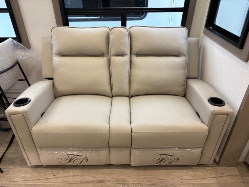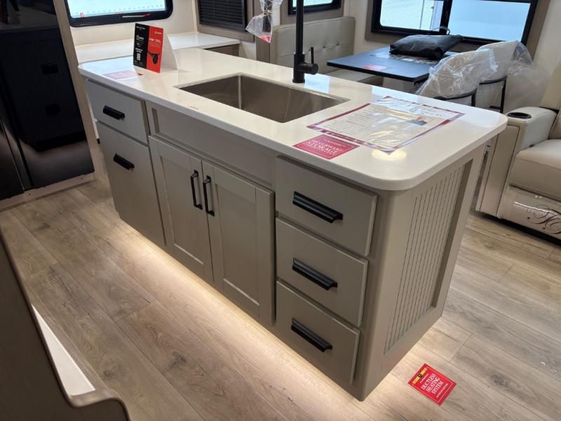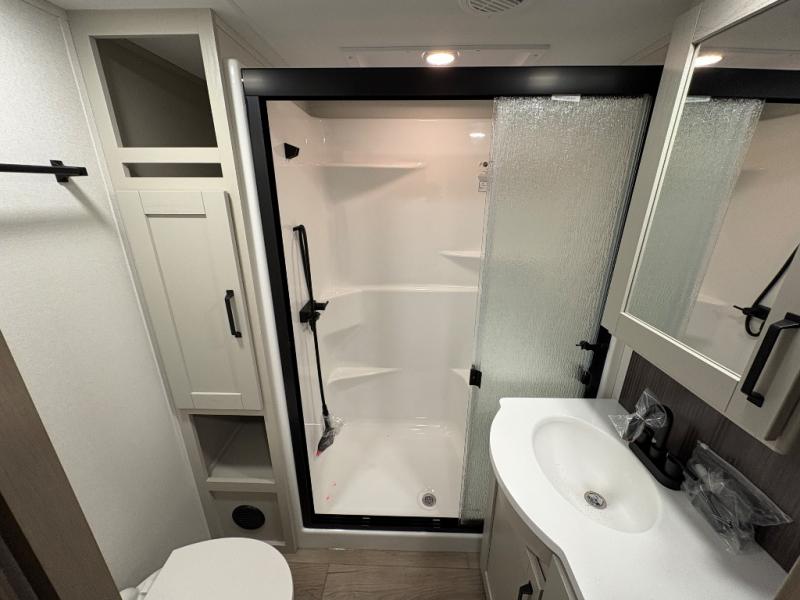 Comfortable accommodations are found throughout this fifth wheel so you can relax, unwind and enjoy your vacation be it for a weekend or a month and even when you have to work! Thanks to the rear desk with a chair and the bedroom with washer and dryer prep, you could stay in this RV as long as you like and keep all your clothes and linens clean. The front bedroom also provides a front wall wardrobe, a slide out queen bed and a dresser. The spacious shower has a glass door and there is linen storage in the full bathroom. The spacious main living and kitchen area has two slide outs with full kitchen amenities and seating with theater seats including cupholders, a booth dinette, and a tri-fold sofa. And the exterior offers an outside kitchen with a griddle, a 1.6 cu ft. refrigerator, and two power awnings!