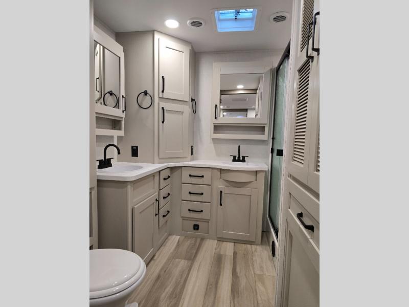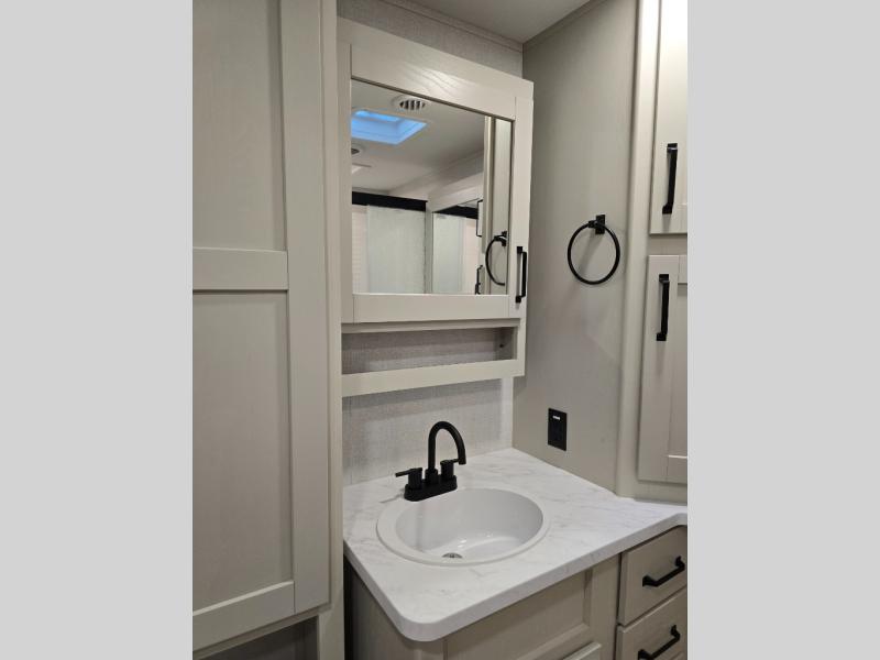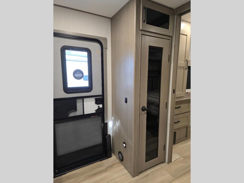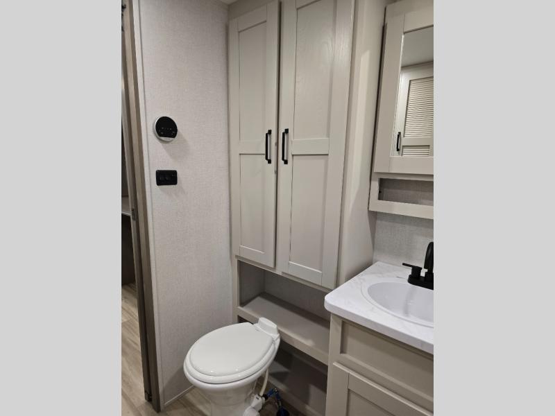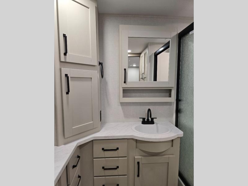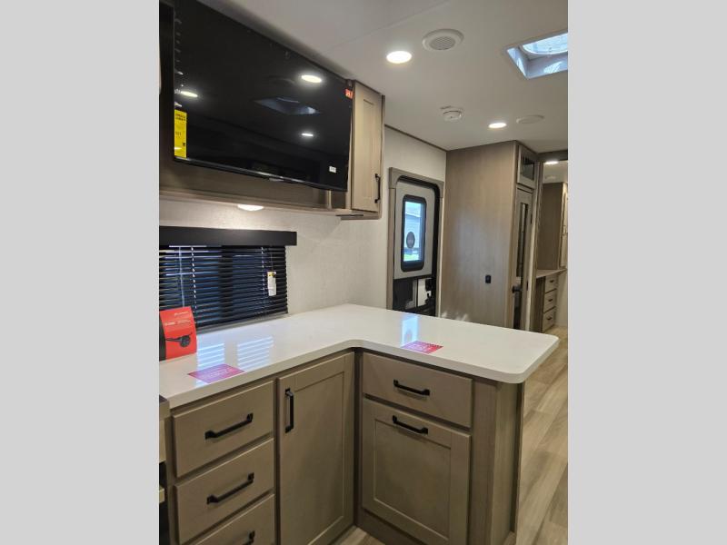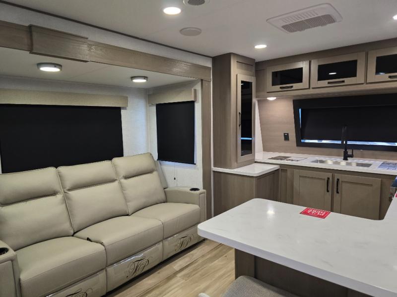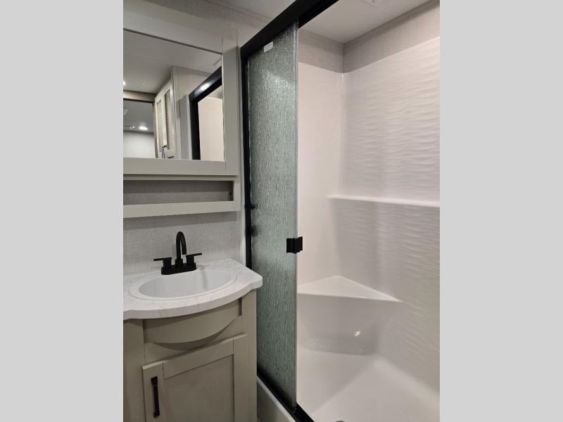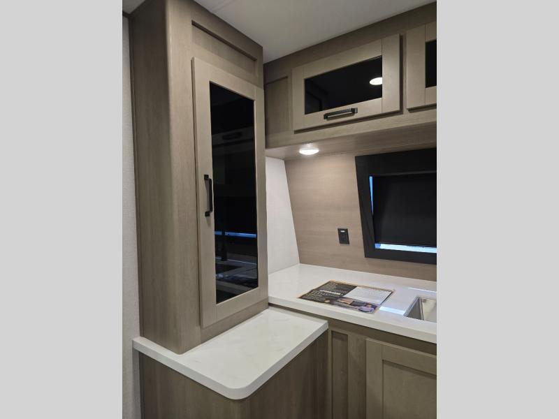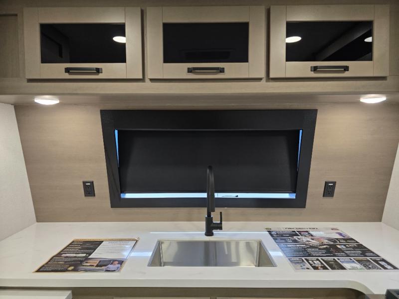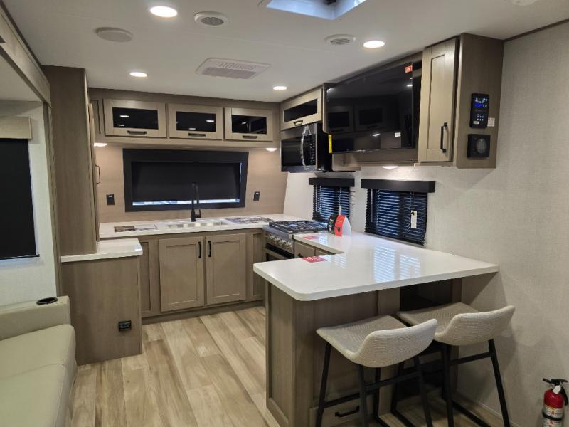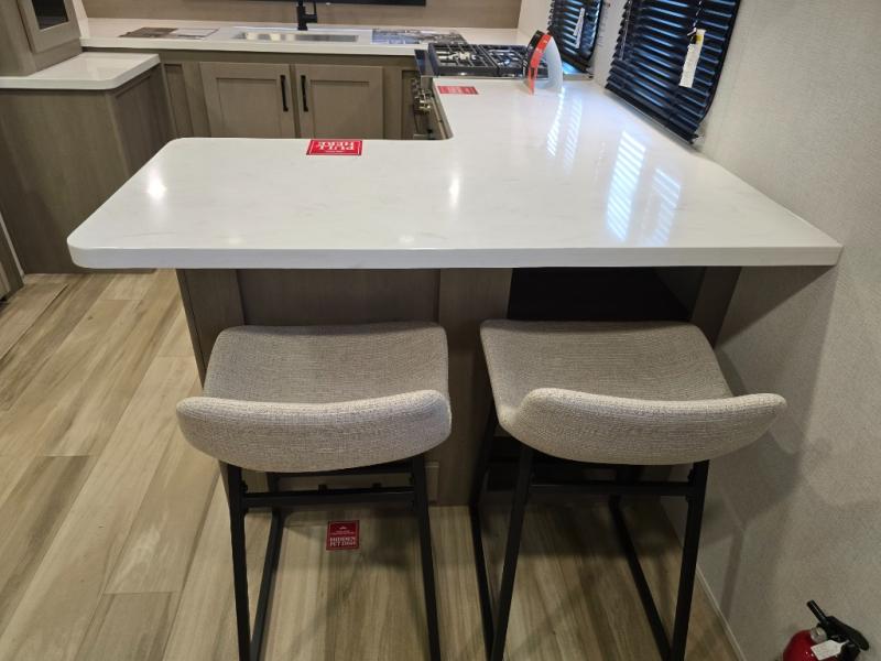 This front kitchen travel trailer will be perfect for camping trips to the lake or woods! There is ample counter space to prep your best meals, including an L-shaped kitchen counter with a bar stool to enjoy your coffee at. The theater seating is inviting, and you can choose the optional tri-fold sofa and end table or optional U-shaped dinette if you need more sleeping space for guests. This unit features a massive master bedroom with a queen bed slide and optional king bed, two closets, and a spacious rear bath. There are two bath sinks here, a 30" x 48" shower, plus washer and dryer prep if you choose to add these appliances!