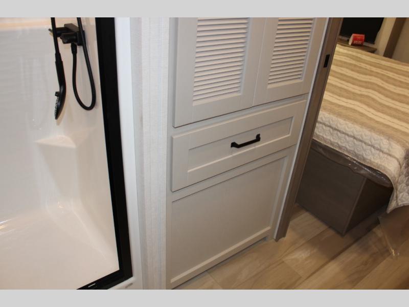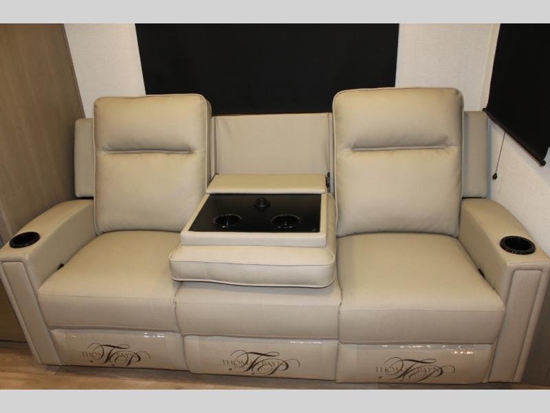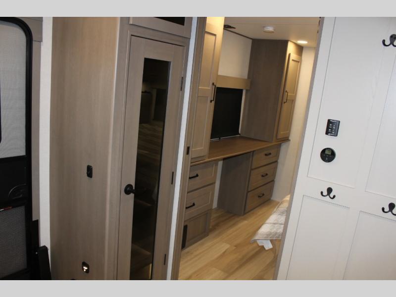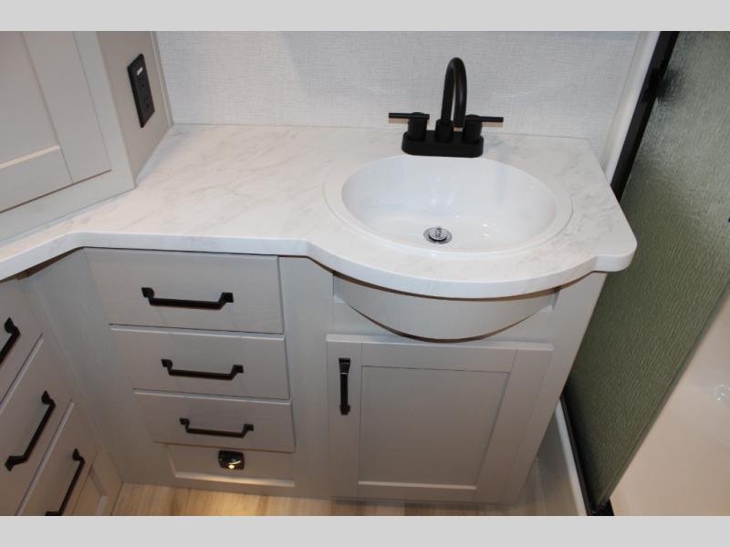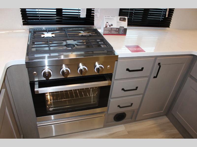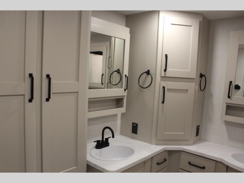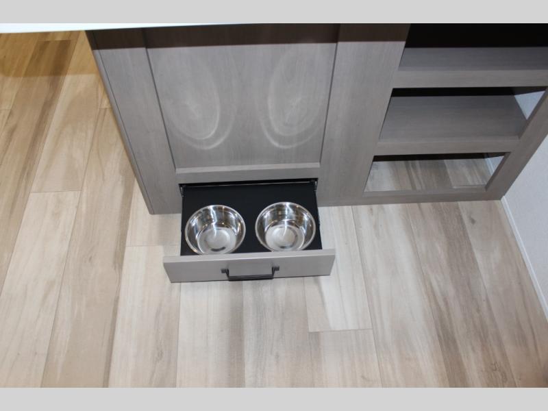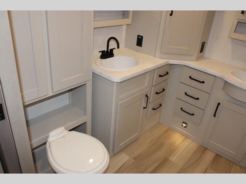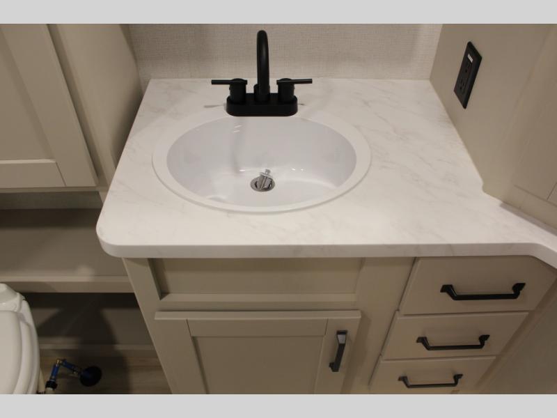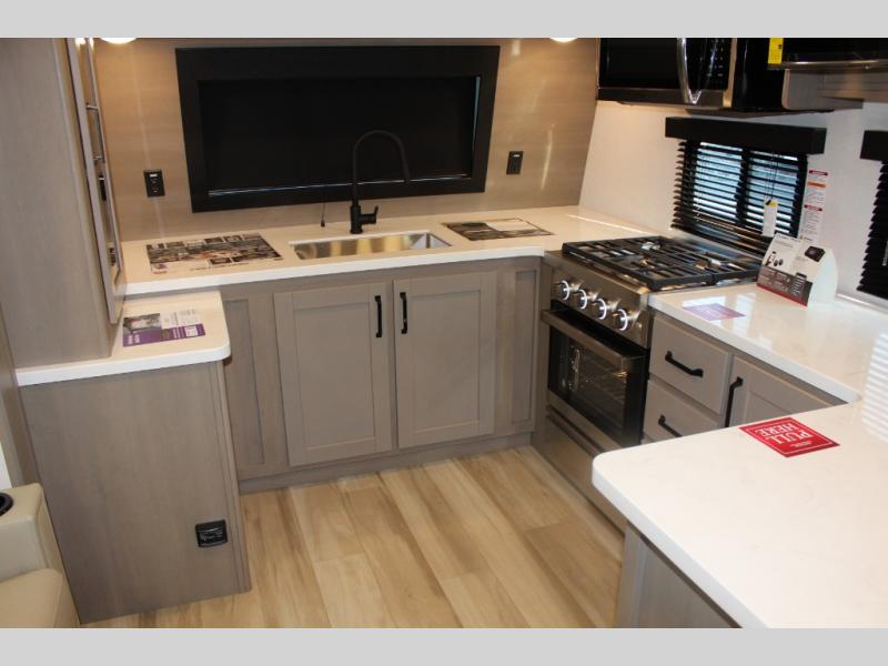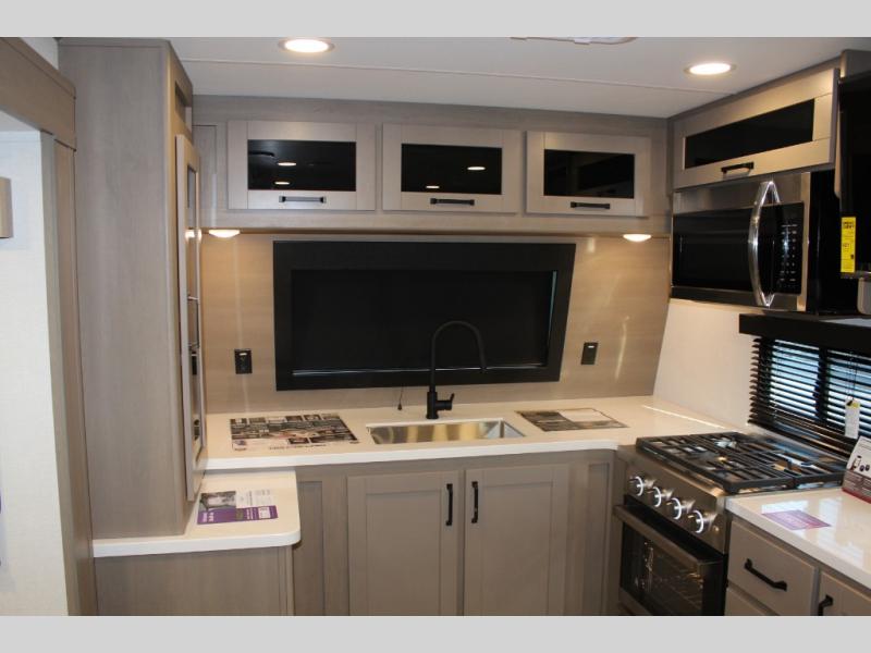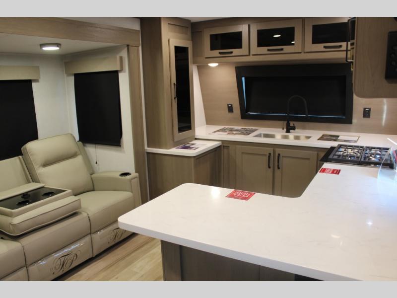 This front kitchen travel trailer will be perfect for camping trips to the lake or woods! There is ample counter space to prep your best meals, including an L-shaped kitchen counter with a bar stool to enjoy your coffee at. The theater seating is inviting, and you can choose the optional tri-fold sofa and end table or optional U-shaped dinette if you need more sleeping space for guests. This unit features a massive master bedroom with a queen bed slide and optional king bed, two closets, and a spacious rear bath. There are two bath sinks here, a 30" x 48" shower, plus washer and dryer prep if you choose to add these appliances!