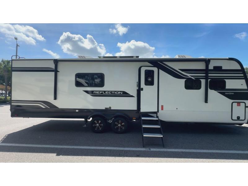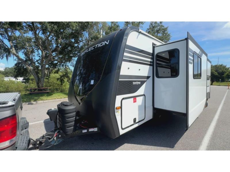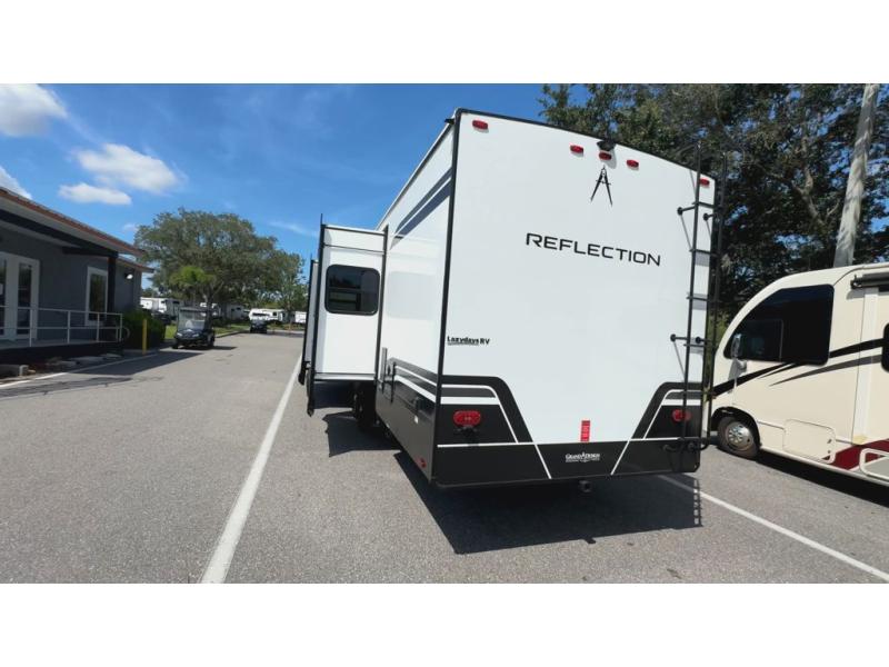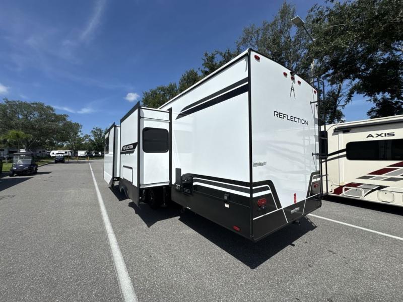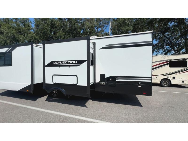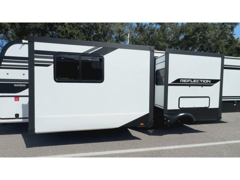 With any Reflection travel trailer by Grand Design, you will have a solar panel for off-grid camping and a 60 amp charge controller and inverter prep, a Universal All-In-One docking station, unobstructed pass-through storage, and Goodyear Endurance tires. Each is constructed of gel coat exterior sidewalls, residential 5" truss rafters, walk-on roof decking, a fiberglass and radiant foil roof and front cap insulation plus laminated aluminum framed side walls, roof and end walls in slide rooms. Head inside to enjoy residential hardwood cabinet doors, premium Congoleum flooring, a spacious shower with a glass door, and many more comforts!