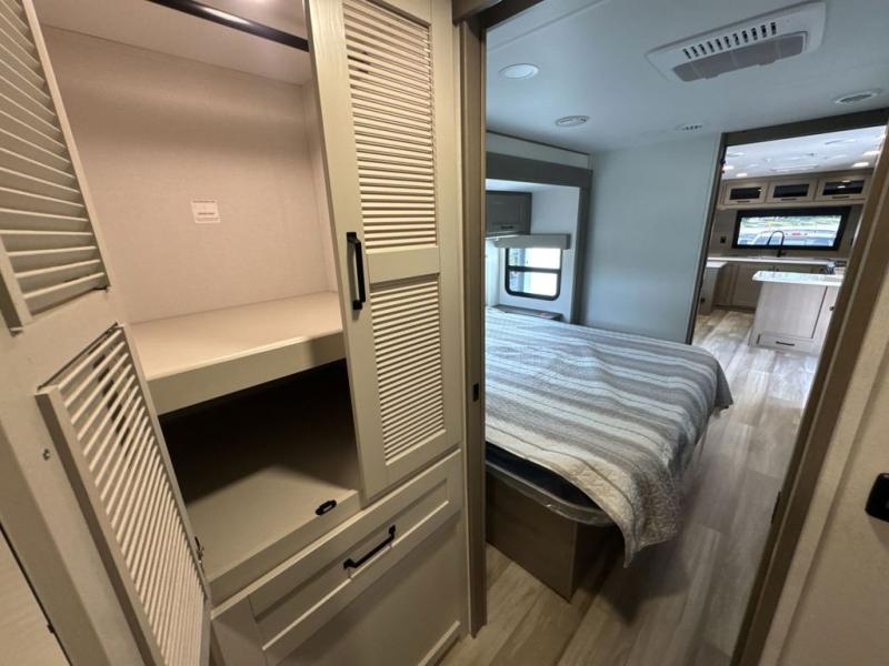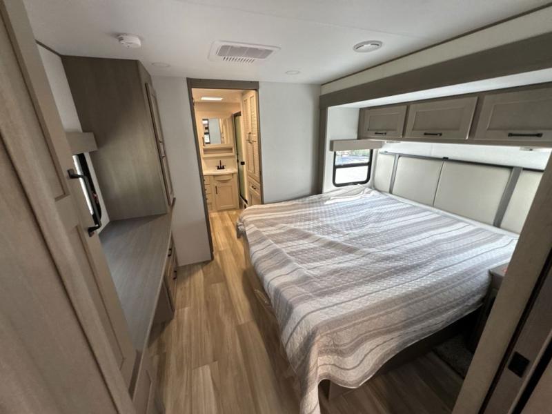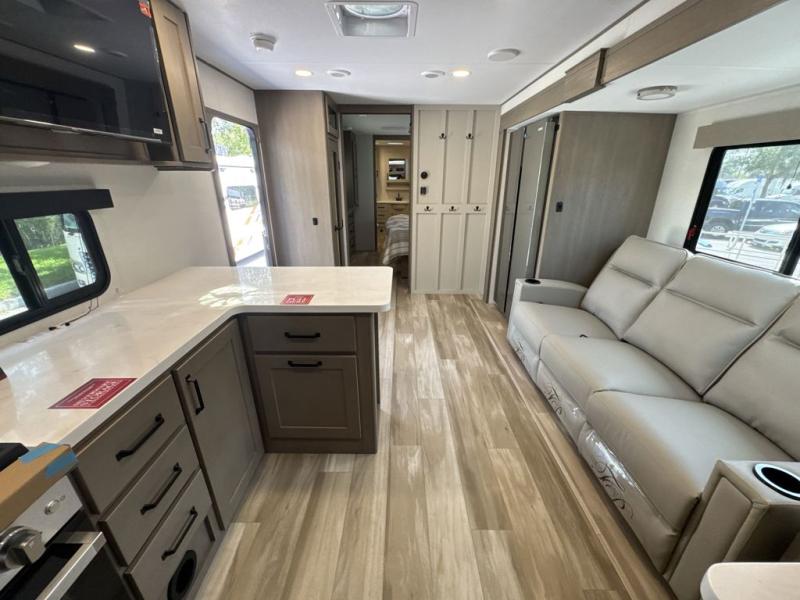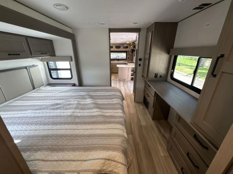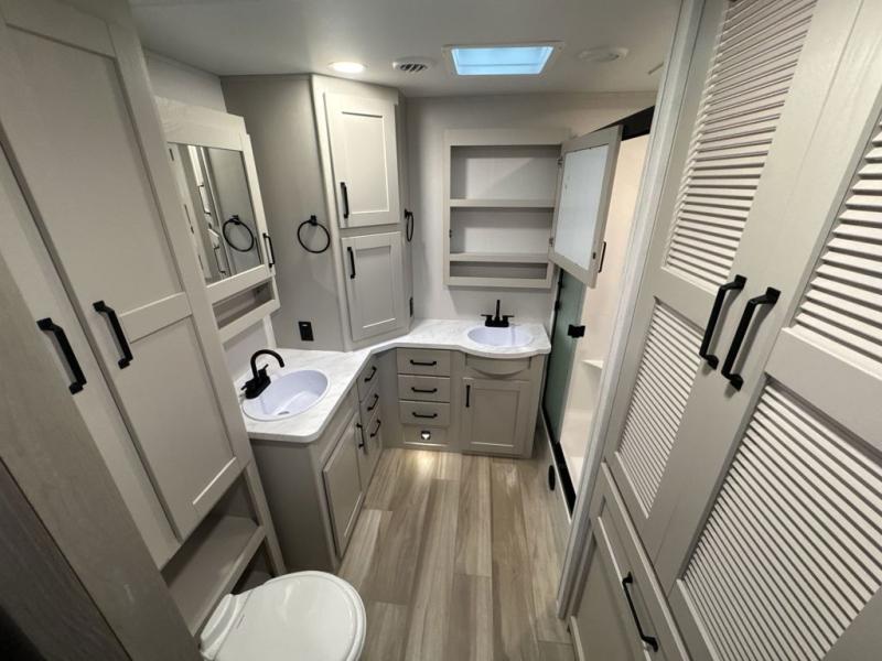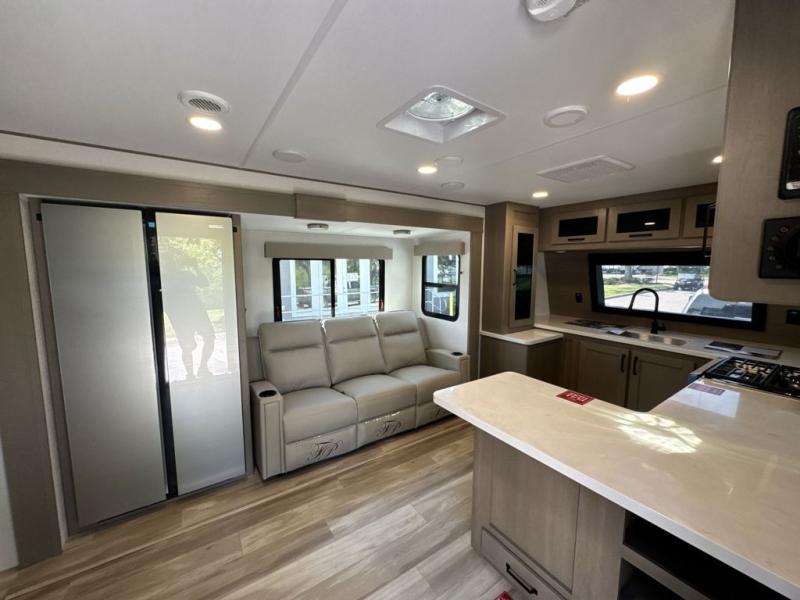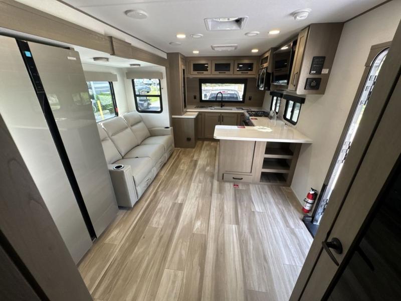 This front kitchen travel trailer will be perfect for camping trips to the lake or woods! There is ample counter space to prep your best meals, including an L-shaped kitchen counter with a bar stool to enjoy your coffee at. The theater seating is inviting, and you can choose the optional tri-fold sofa and end table or optional U-shaped dinette if you need more sleeping space for guests. This unit features a massive master bedroom with a queen bed slide and optional king bed, two closets, and a spacious rear bath. There are two bath sinks here, a 30" x 48" shower, plus washer and dryer prep if you choose to add these appliances!