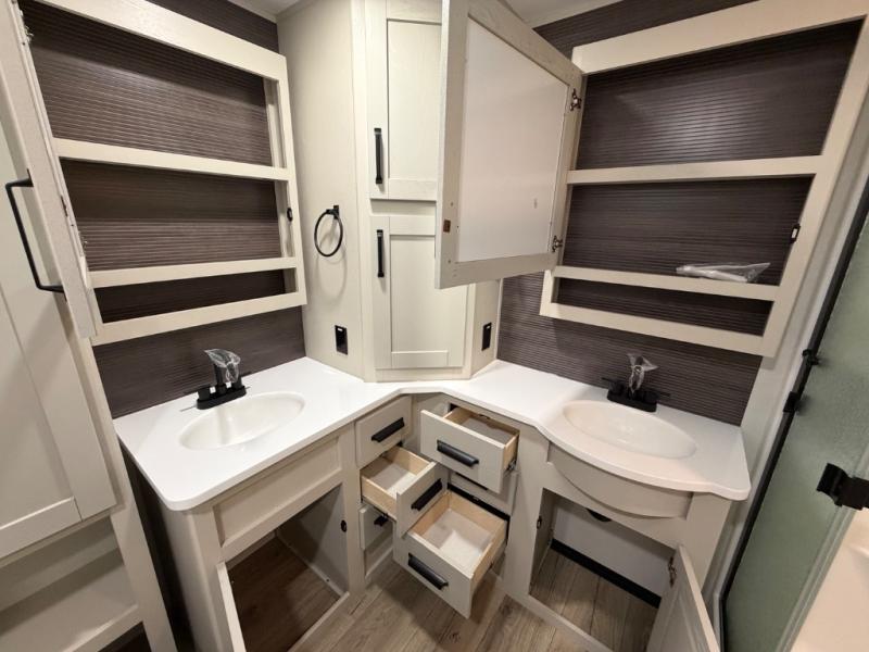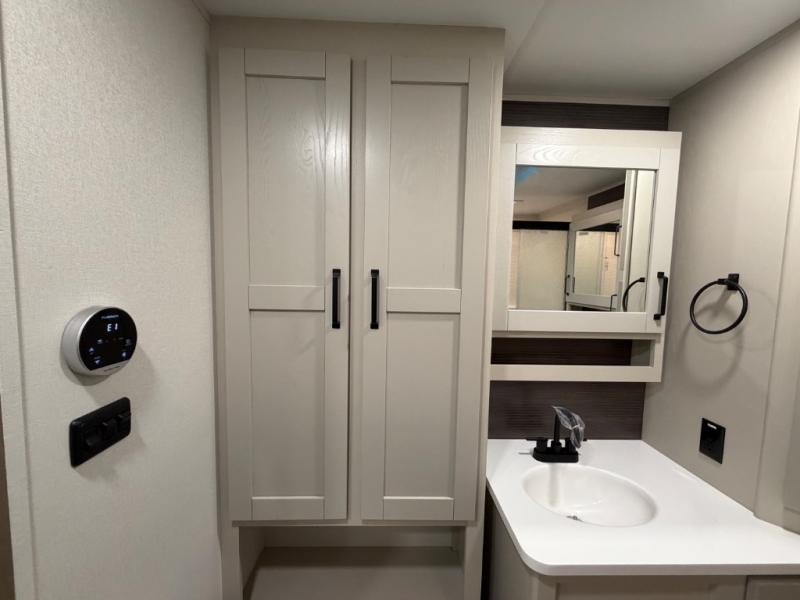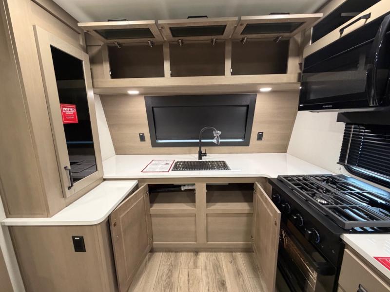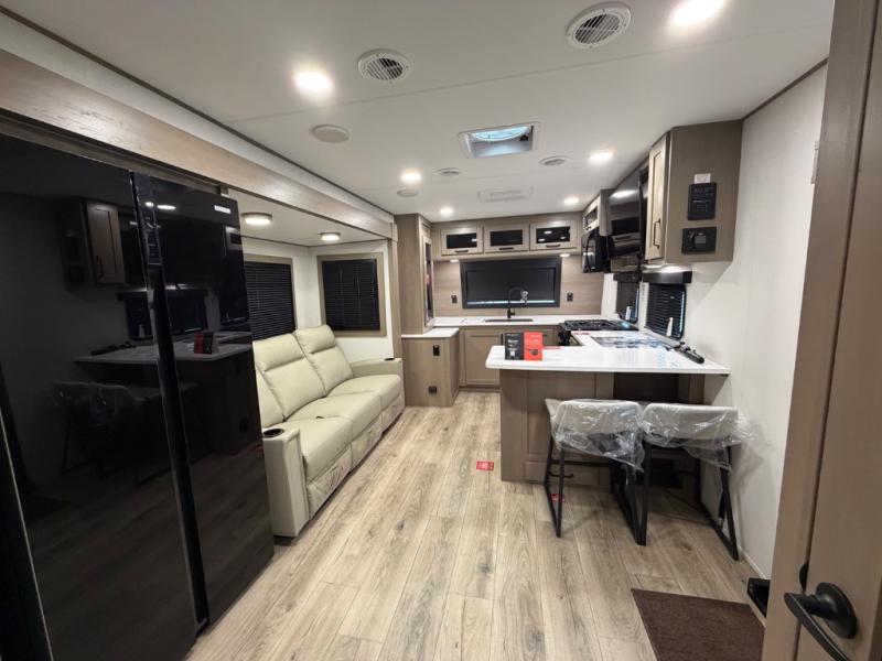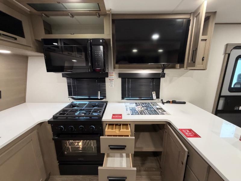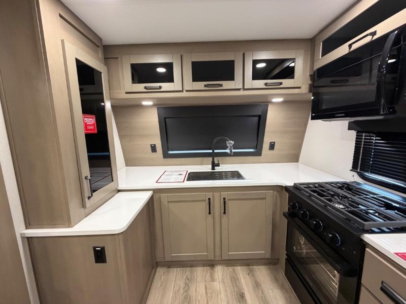 This front kitchen travel trailer will be perfect for camping trips to the lake or woods! There is ample counter space to prep your best meals, including an L-shaped kitchen counter with a bar stool to enjoy your coffee at. The theater seating is inviting, and you can choose the optional U-shaped dinette if you need more sleeping space for guests. This unit features a massive master bedroom with a queen bed slide and optional king bed, two closets, and a spacious rear bath. There are two bath sinks here, a 30" x 48" shower, plus washer and dryer prep if you choose to add these appliances!