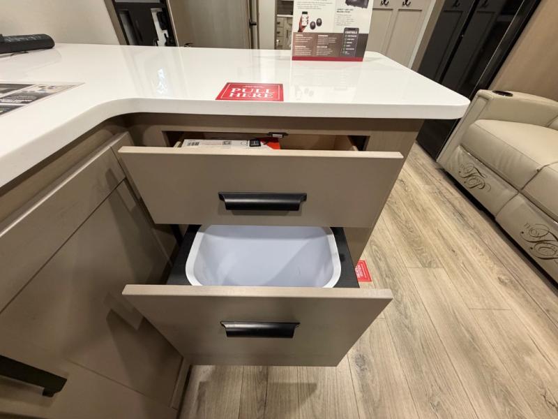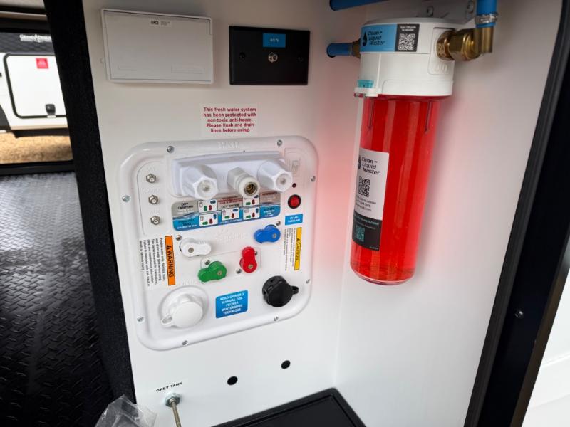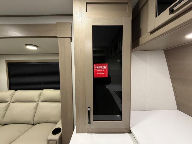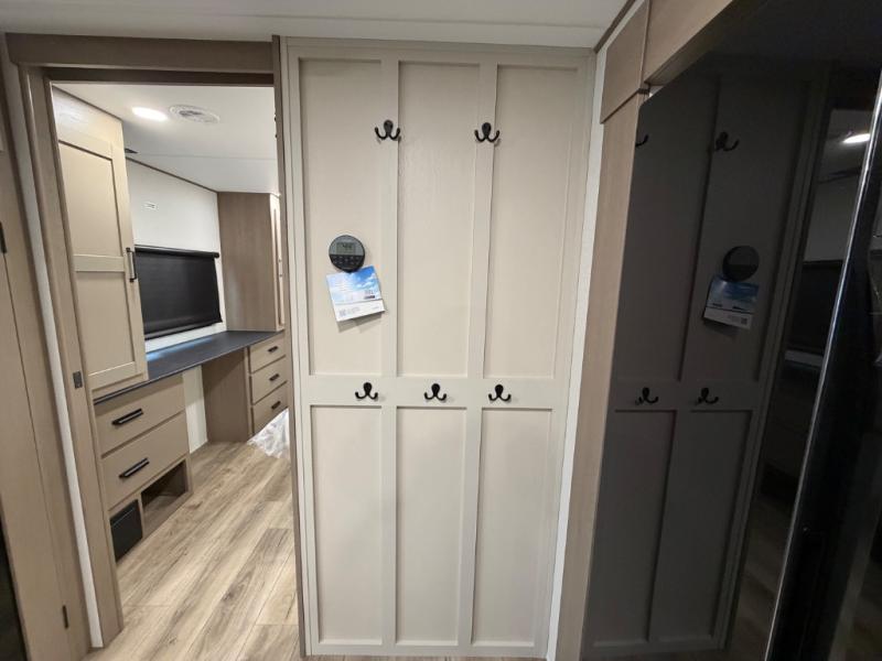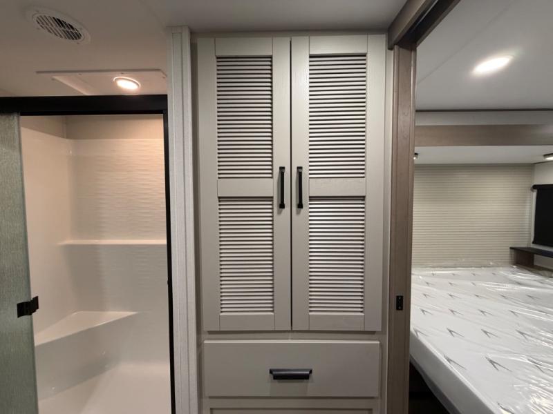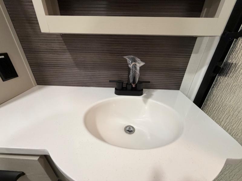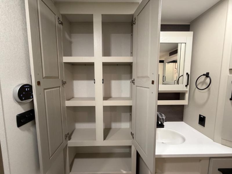 This front kitchen travel trailer will be perfect for camping trips to the lake or woods! There is ample counter space to prep your best meals, including an L-shaped kitchen counter with a bar stool to enjoy your coffee at. The theater seating is inviting, and you can choose the optional U-shaped dinette if you need more sleeping space for guests. This unit features a massive master bedroom with a queen bed slide and optional king bed, two closets, and a spacious rear bath. There are two bath sinks here, a 30" x 48" shower, plus washer and dryer prep if you choose to add these appliances!