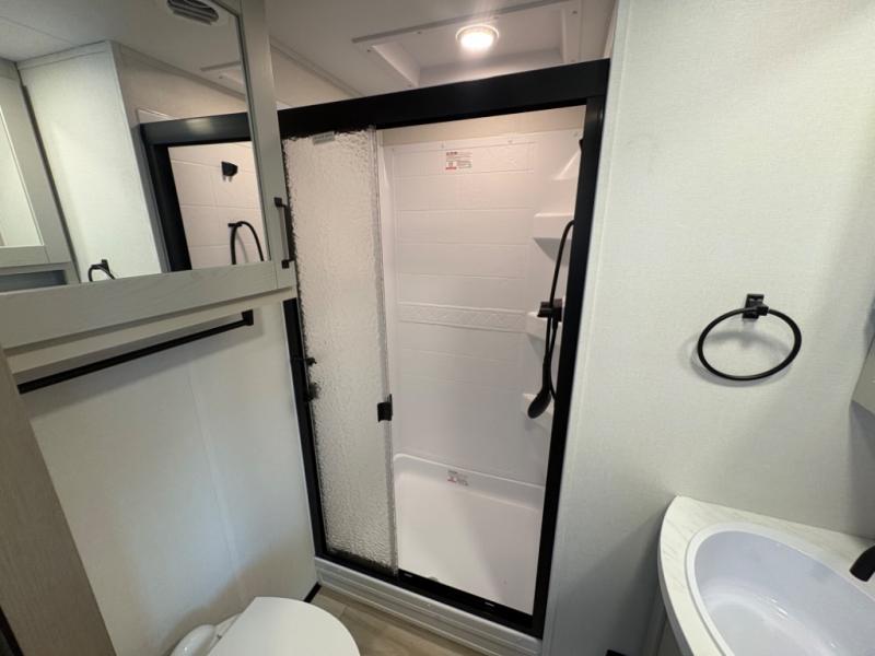 When you are looking for a versatile extra room for either a second bedroom or living area as well as an office, this middle bunkhouse might just work! There is a slide out with two bunks and drawers plus a dresser. You can sleep like a queen on the walk-around bed in the front private bedroom that offers more clothing storage and windows for views. The rear main living and kitchen area provides plenty of seating on the a 78" triple person theater seats, and on the 92" U-shaped lounge with table with windows within the slide for natural lighting and great views. The kitchen island gives the cook more space to make and serve meals, and the gourmet kitchen includes a 16 cu. ft. refrigerator, plus a pantry for dry goods. There is an exterior outside kitchen with a griddle and a 1.6 cu. ft. refrigerator for beverages and such, plus you will find an LP quick connect, Coax TV hookup, and a spray port to wash off your dirty shoes.