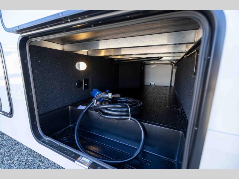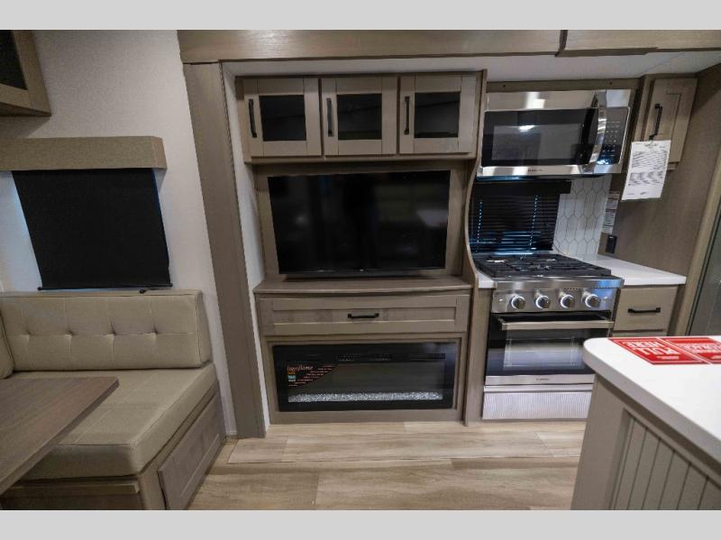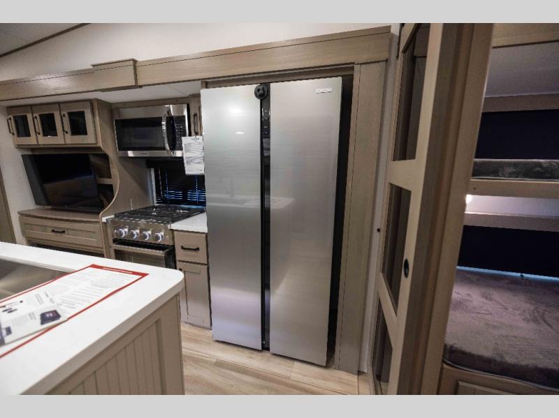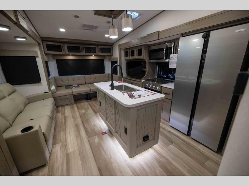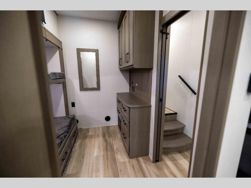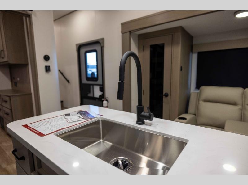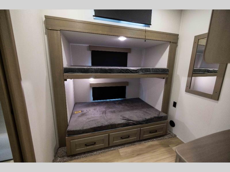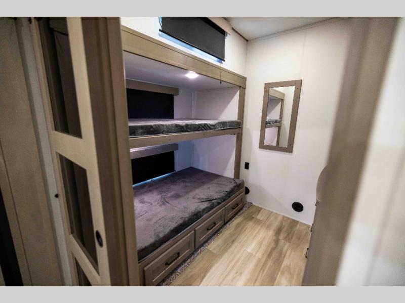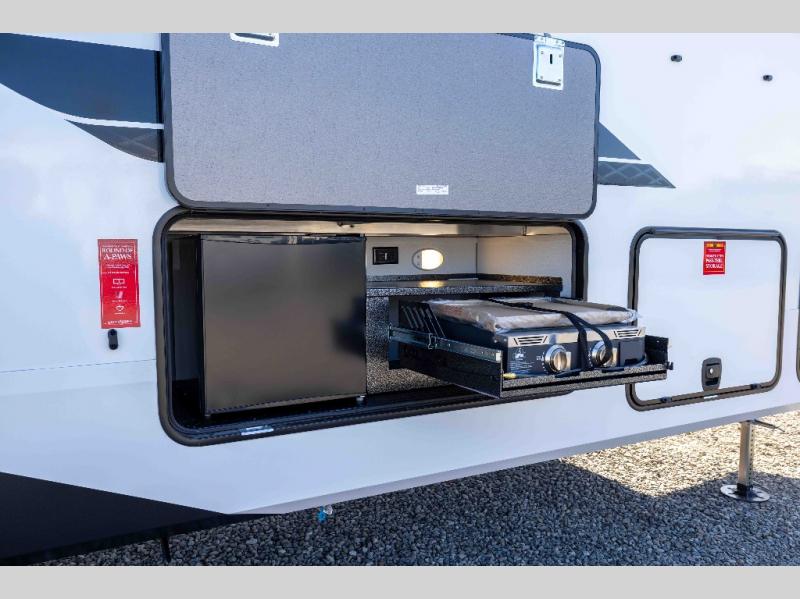 When you are looking for a versatile extra room for either a second bedroom or living area as well as an office, this middle bunkhouse might just work! There is a slide out with two bunks and drawers plus a dresser. You can sleep like a queen on the walk-around bed in the front private bedroom that offers more clothing storage and windows for views. The rear main living and kitchen area provides plenty of seating on the a 78" triple person theater seats, and on the 92" U-shaped lounge with table with windows within the slide for natural lighting and great views. The kitchen island gives the cook more space to make and serve meals, and the gourmet kitchen includes a 16 cu. ft. refrigerator, plus a pantry for dry goods. There is an exterior outside kitchen with a griddle and a 1.6 cu. ft. refrigerator for beverages and such, plus you will find an LP quick connect, Coax TV hookup, and a spray port to wash off your dirty shoes.