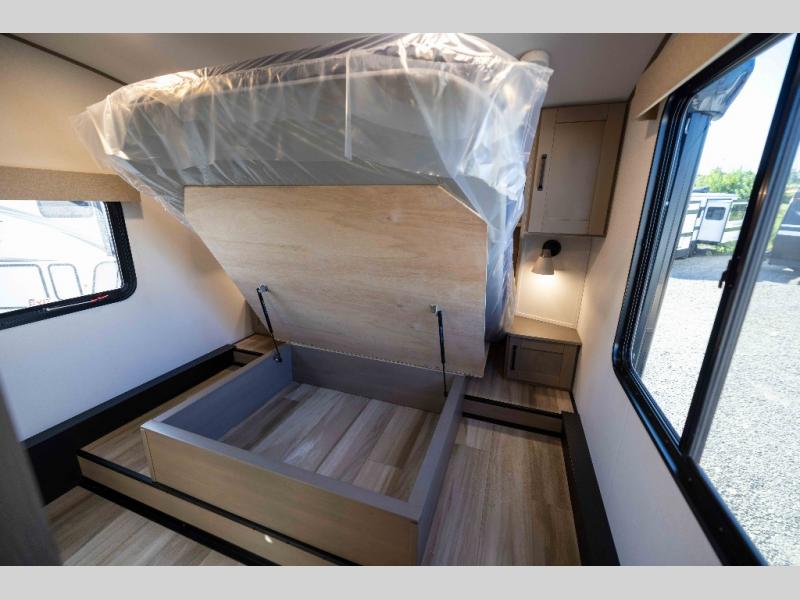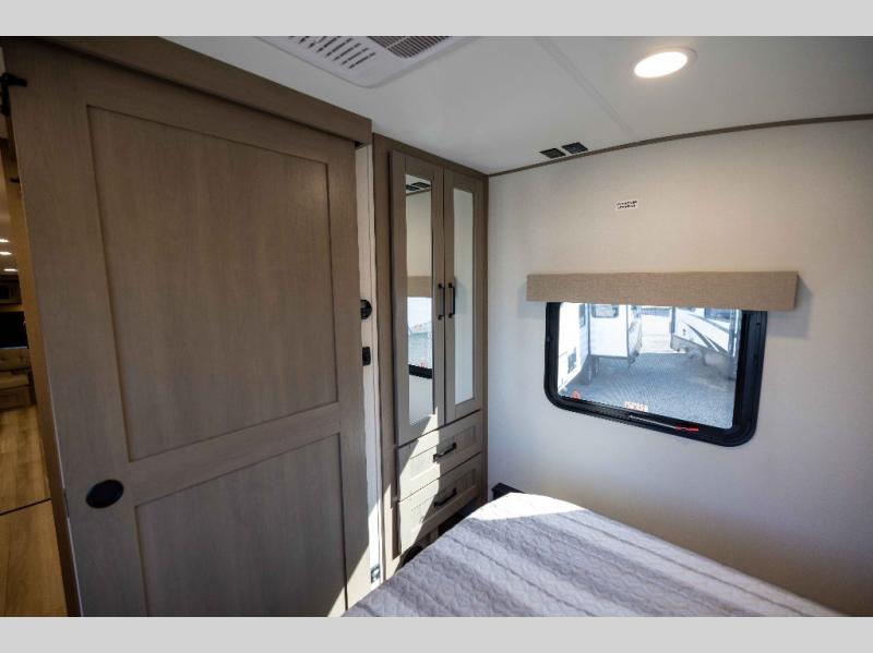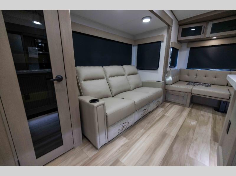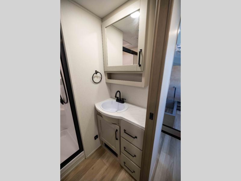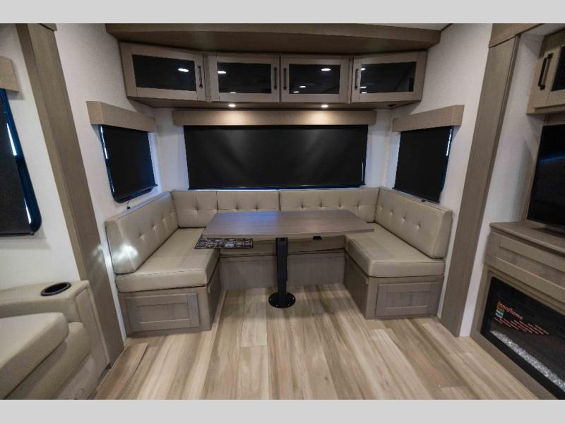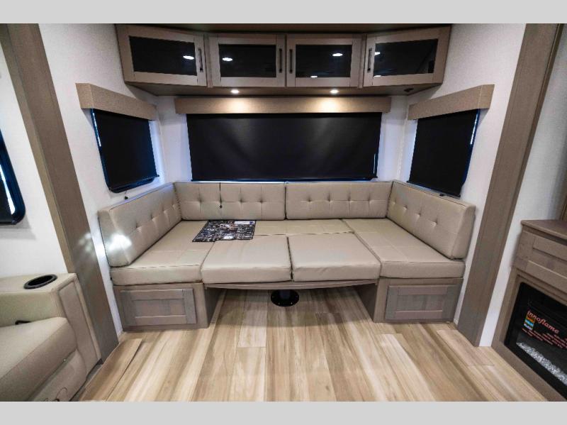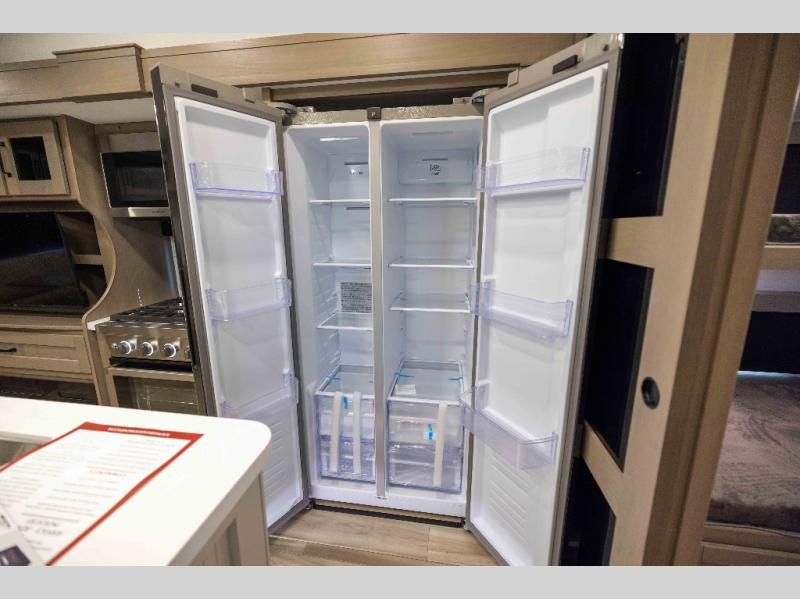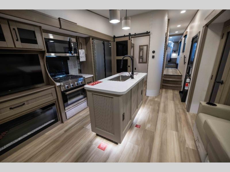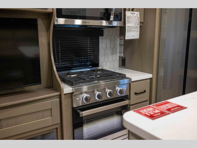 When you are looking for a versatile extra room for either a second bedroom or living area as well as an office, this middle bunkhouse might just work! There is a slide out with two bunks and drawers plus a dresser. You can sleep like a queen on the walk-around bed in the front private bedroom that offers more clothing storage and windows for views. The rear main living and kitchen area provides plenty of seating on the a 78" triple person theater seats, and on the 92" U-shaped lounge with table with windows within the slide for natural lighting and great views. The kitchen island gives the cook more space to make and serve meals, and the gourmet kitchen includes a 16 cu. ft. refrigerator, plus a pantry for dry goods. There is an exterior outside kitchen with a griddle and a 1.6 cu. ft. refrigerator for beverages and such, plus you will find an LP quick connect, Coax TV hookup, and a spray port to wash off your dirty shoes.