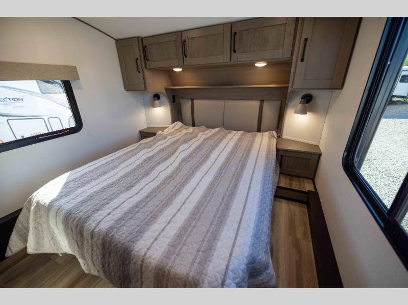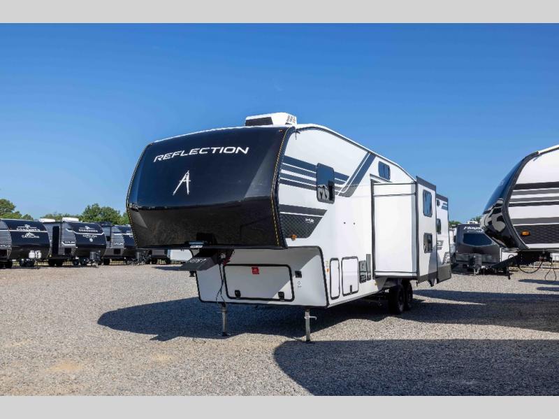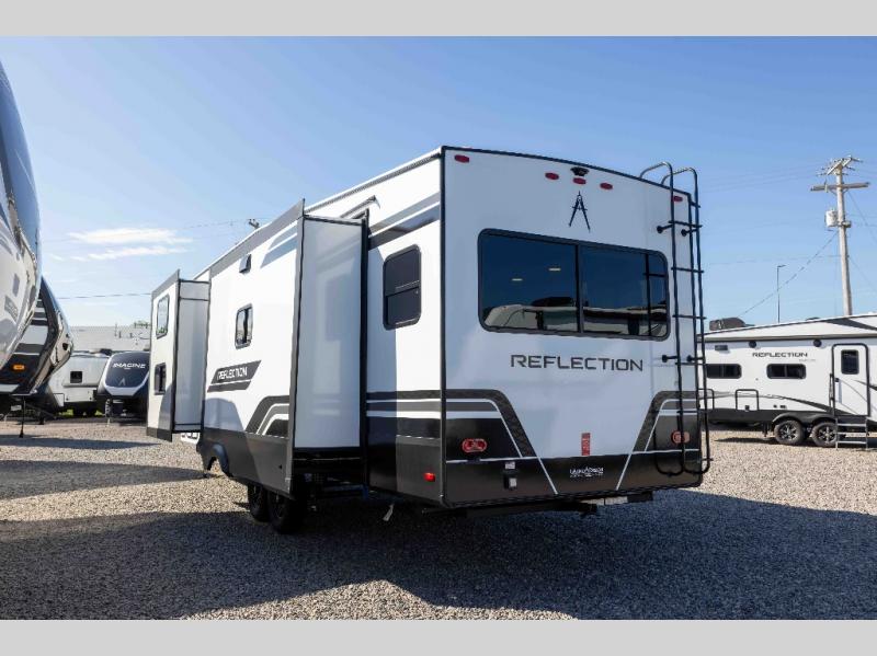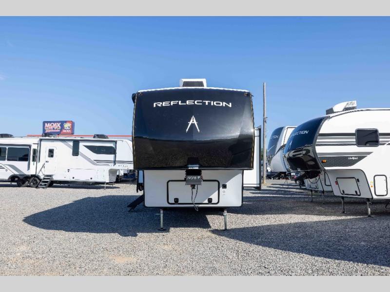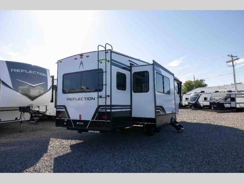 With any Reflection fifth wheel by Grand Design, you will have a solar panel for off-grid camping and a 60 amp charge controller and inverter prep, a Universal All-In-One docking station, unobstructed pass-through storage, and Goodyear Endurance tires. Each is constructed of gel coat exterior sidewalls, residential 5" truss rafters, walk-on roof decking, a fiberglass and radiant foil roof and front cap insulation plus laminated aluminum framed side walls, roof and end walls in slide rooms. Head inside to enjoy residential hardwood cabinet doors, premium Congoleum flooring, a spacious shower with a glass door, and many more comforts!