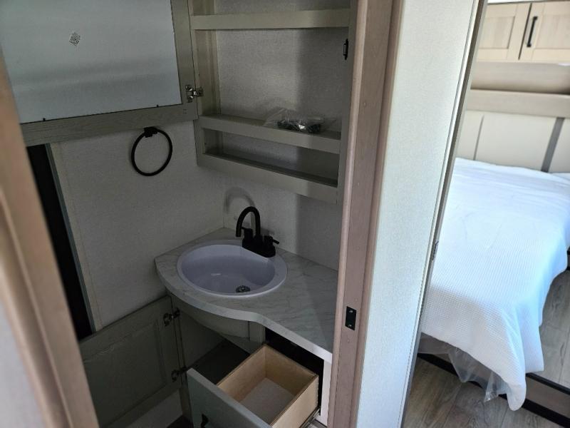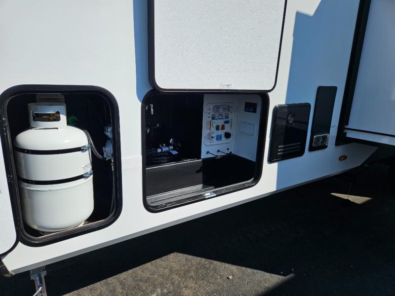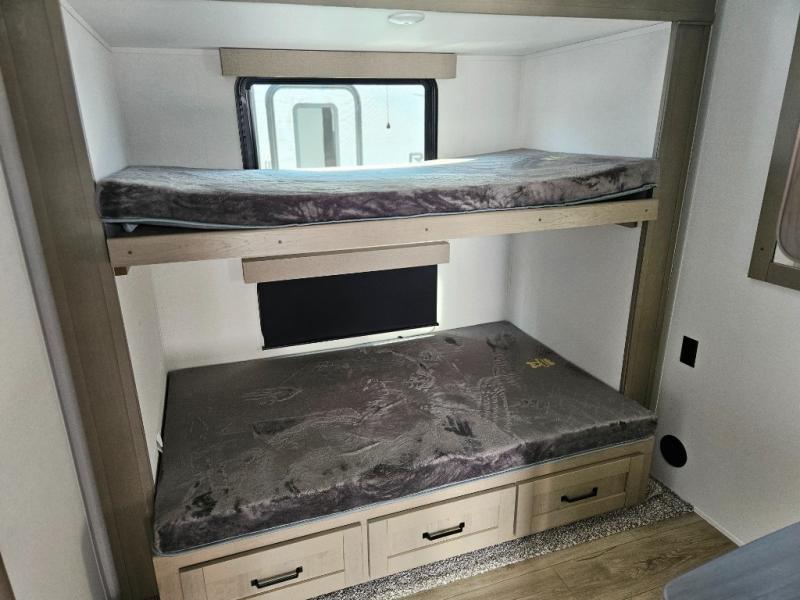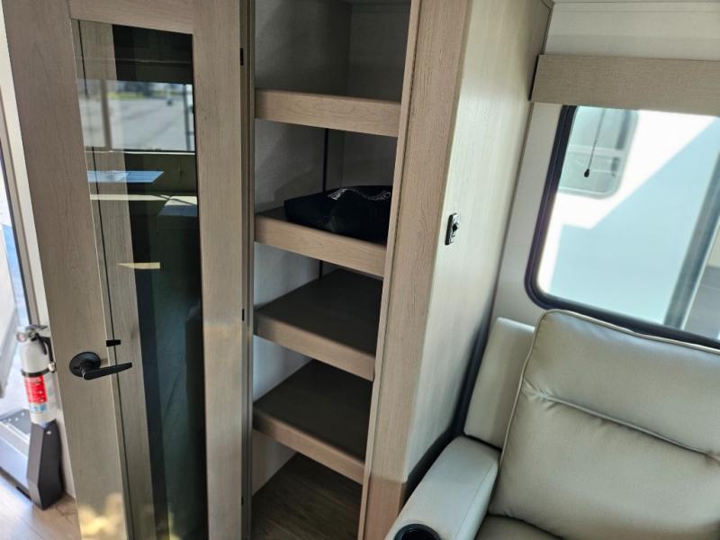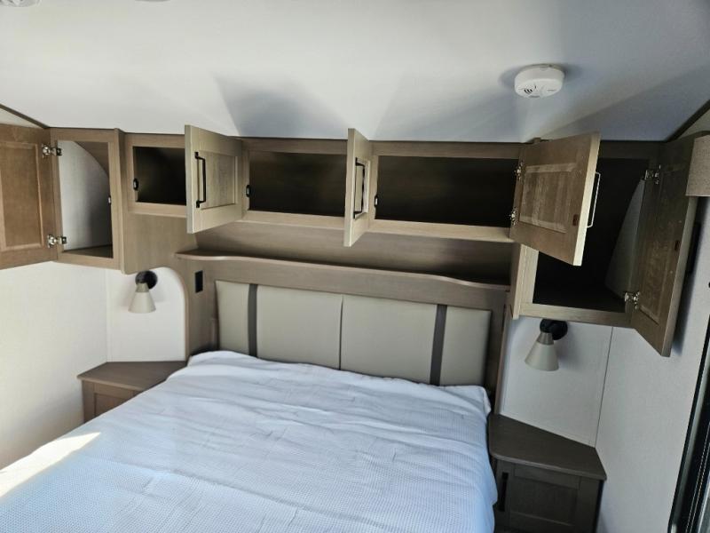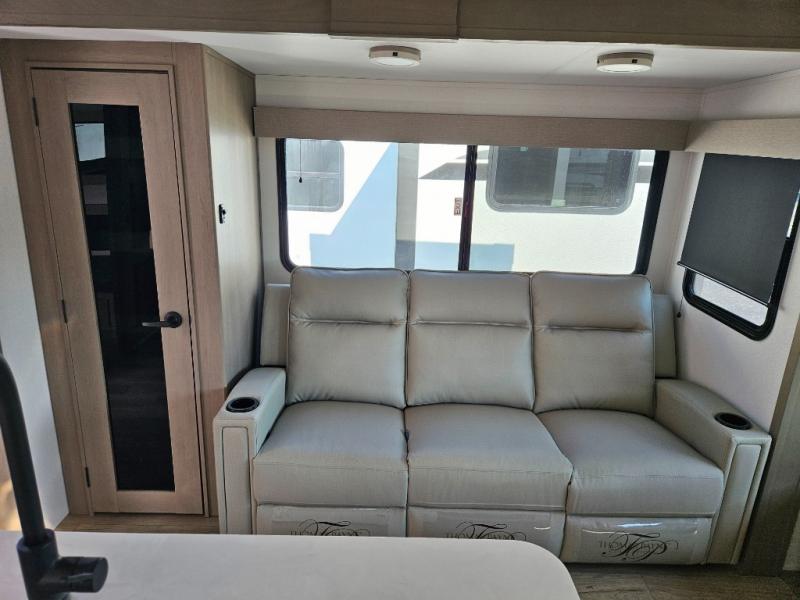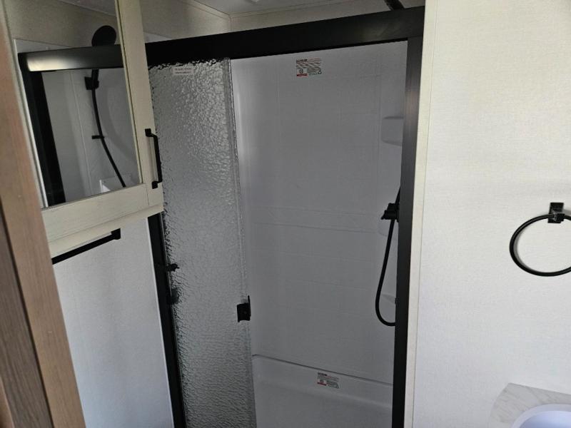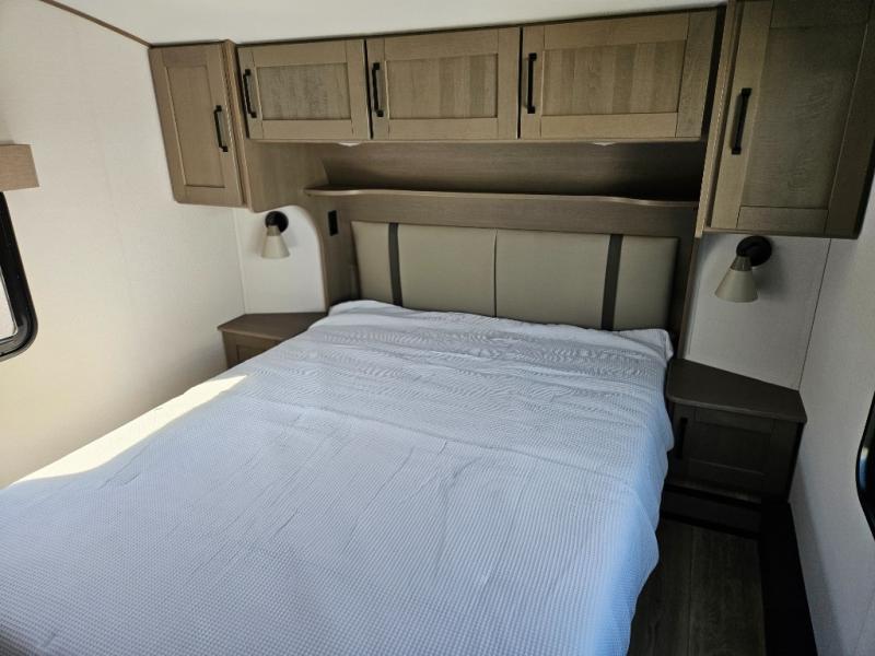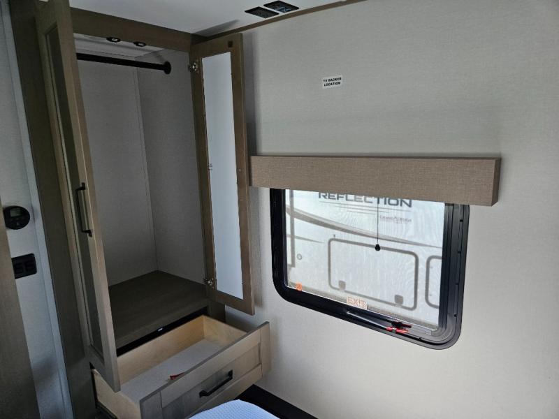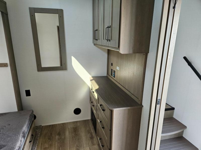 What truly sets the Reflection 324MBS apart is its versatile mid-bunk room—an adaptable space that can serve as a second bedroom, office, or guest room. It includes a tri-fold sofa, storage cabinets, and a desk area, making it ideal for families or anyone who wants extra space for work or play. The private front master suite offers a walk-around queen bed, abundant closet space, and washer/dryer prep for extended stays. A spacious bathroom with a large shower and premium fixtures completes the layout, giving you all the amenities of home on the road.