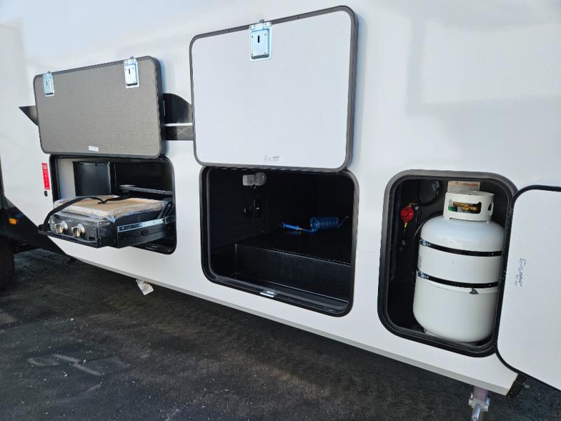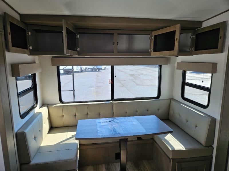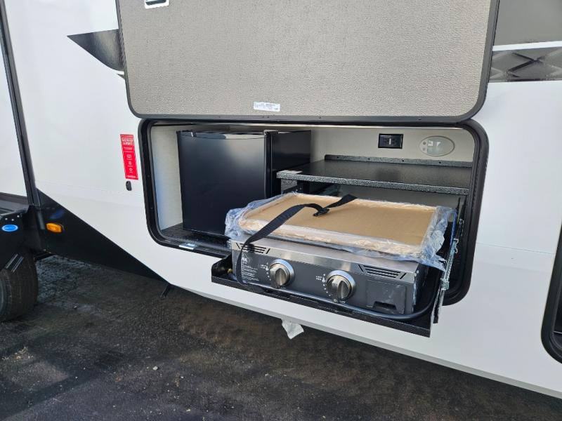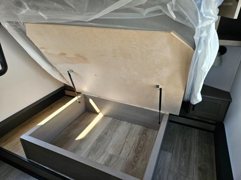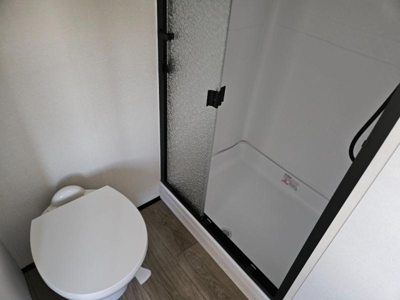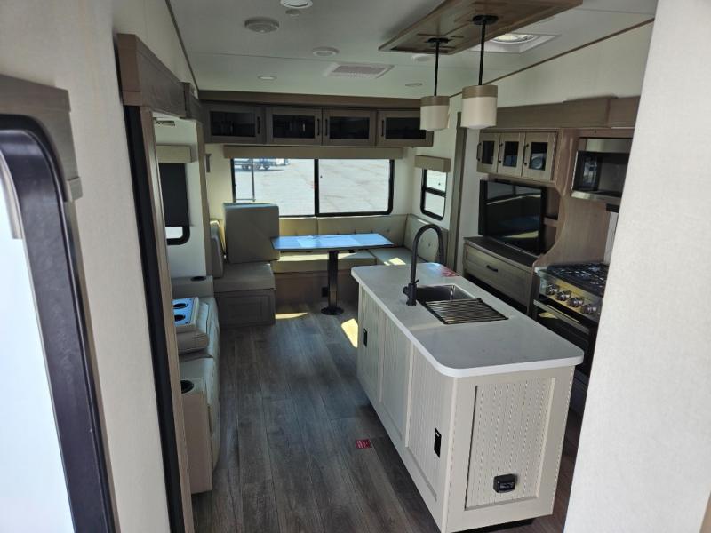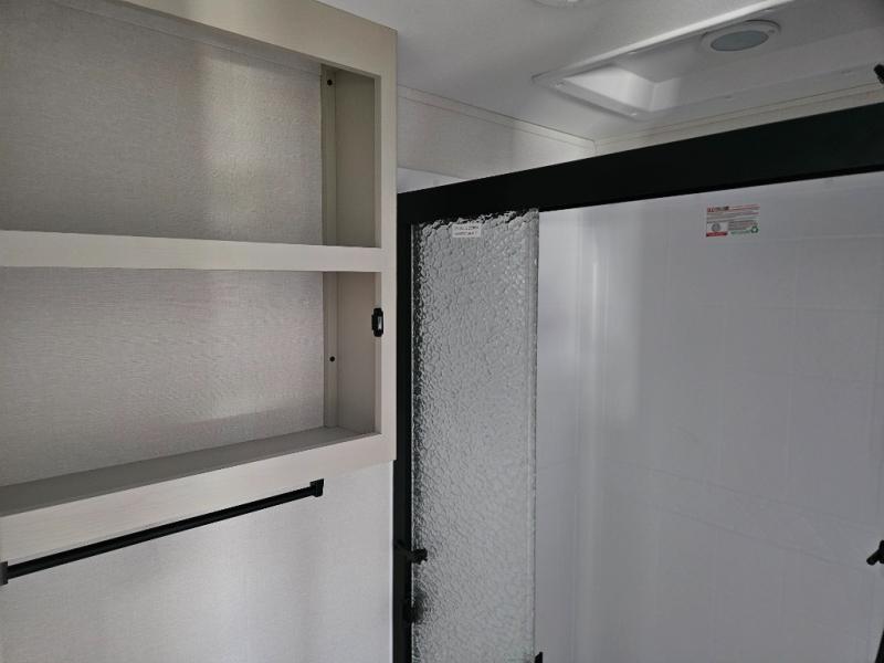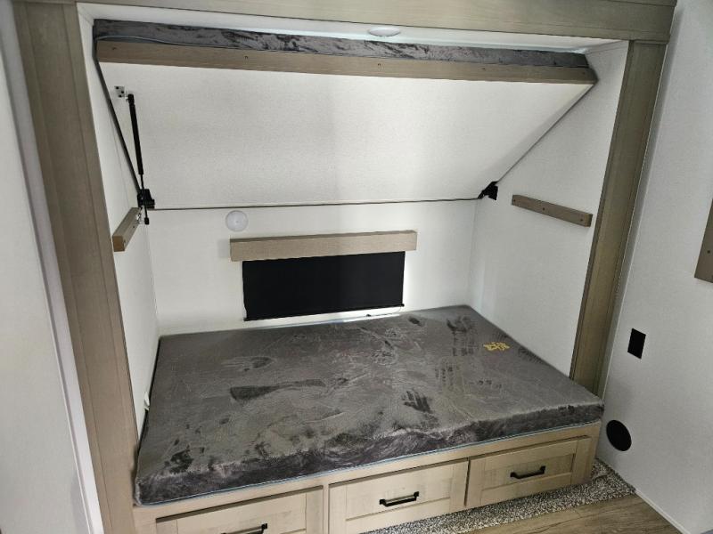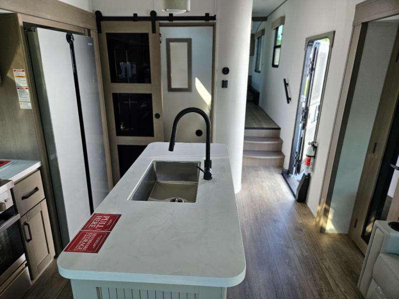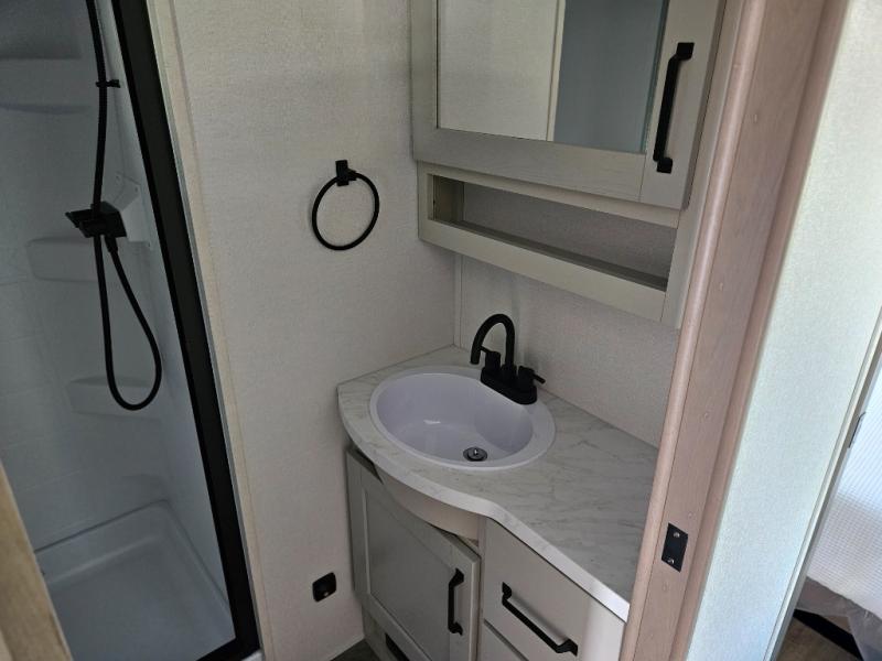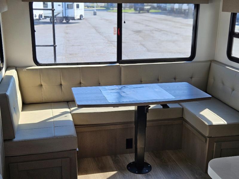 What truly sets the Reflection 324MBS apart is its versatile mid-bunk room—an adaptable space that can serve as a second bedroom, office, or guest room. It includes a tri-fold sofa, storage cabinets, and a desk area, making it ideal for families or anyone who wants extra space for work or play. The private front master suite offers a walk-around queen bed, abundant closet space, and washer/dryer prep for extended stays. A spacious bathroom with a large shower and premium fixtures completes the layout, giving you all the amenities of home on the road.