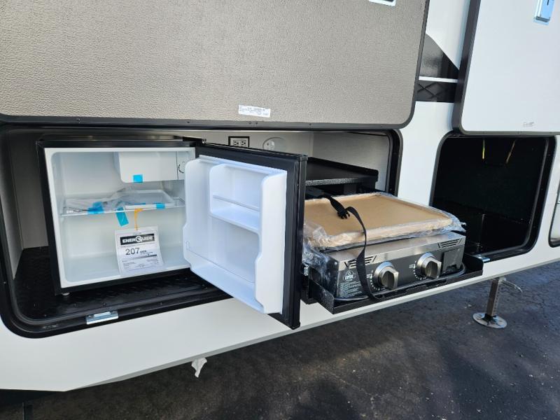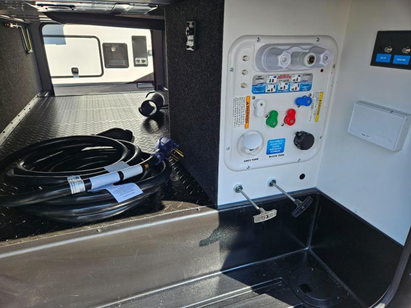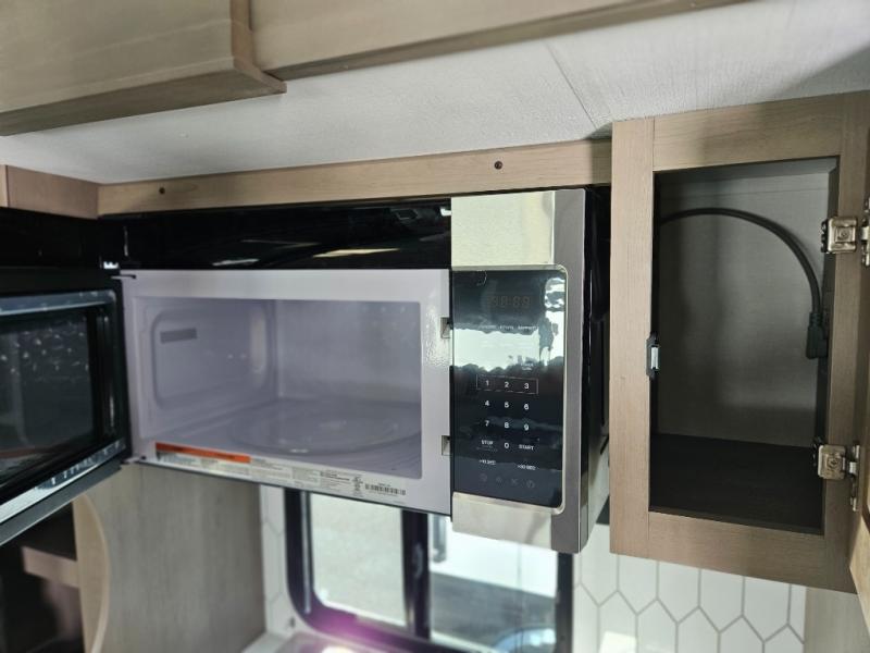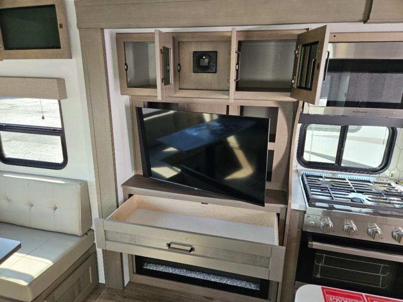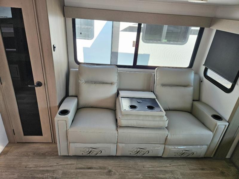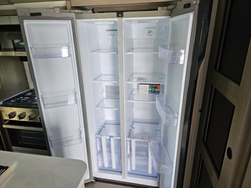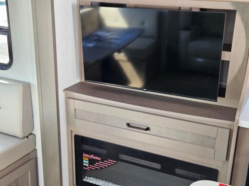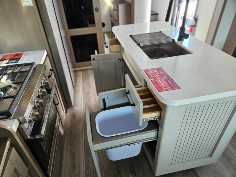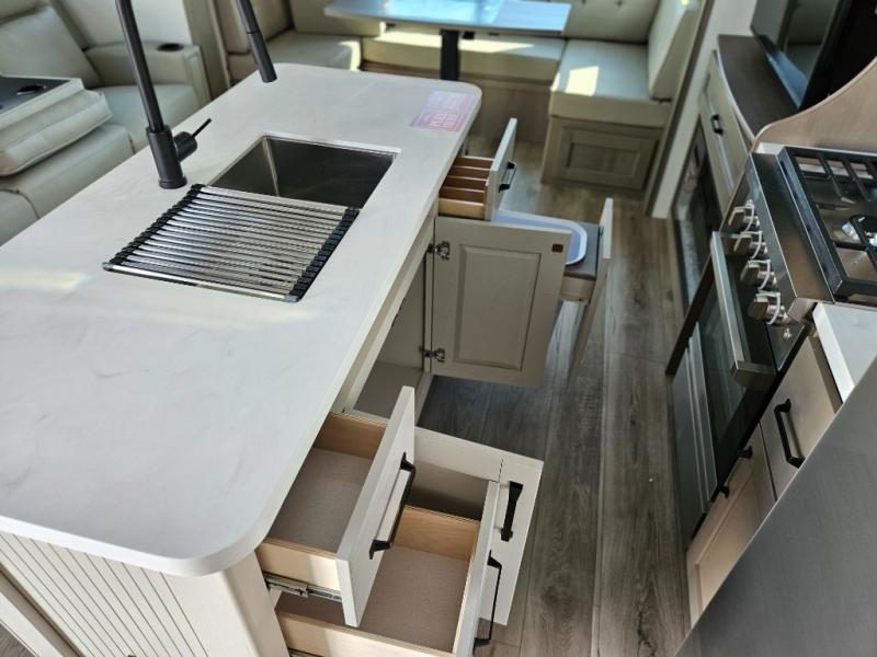 Step inside and be welcomed by a bright, open living area that feels both modern and inviting. The rear lounge features plush theater seating, a tri-fold sofa for extra guests, and a full entertainment center with a large LED TV and cozy fireplace. It’s the perfect place to relax after a day of exploring. The chef-inspired kitchen offers residential-grade appliances, solid-surface countertops, an island with deep storage, and an oversized pantry. Whether you’re preparing a quick breakfast or a full dinner, this kitchen is designed for convenience and comfort.