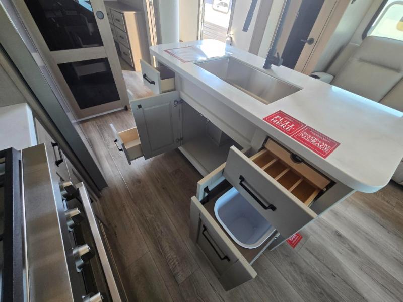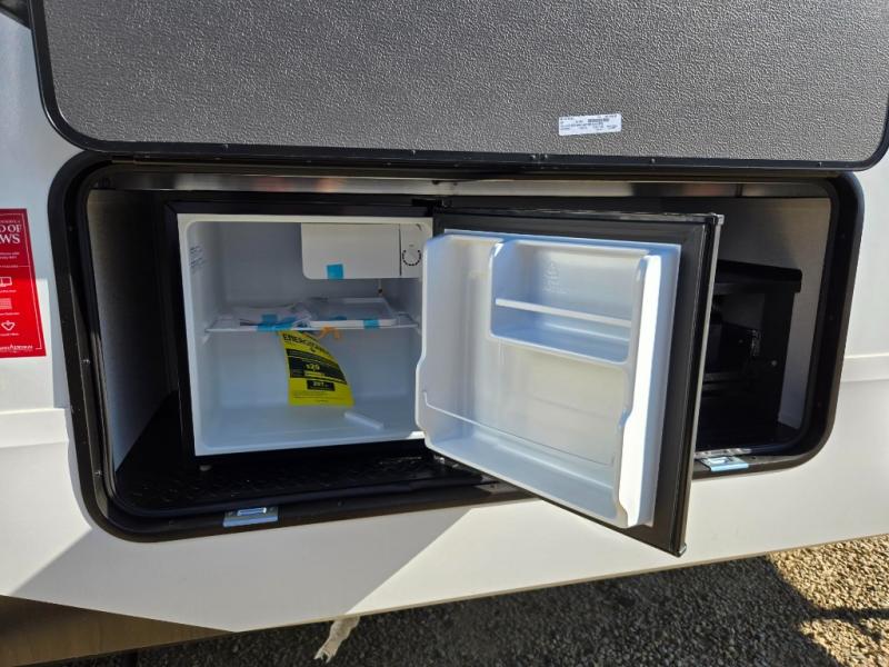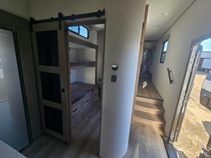 When you are looking for a versatile extra room for either a second bedroom or living area as well as an office, this middle bunkhouse might just work! There is a slide out with two bunks and drawers plus a dresser. You can sleep like a queen on the walk-around bed in the front private bedroom that offers more clothing storage and windows for views. The rear main living and kitchen area provides plenty of seating on the a 78" triple person theater seats, and on the 92" U-shaped lounge with table with windows within the slide for natural lighting and great views. The kitchen island gives the cook more space to make and serve meals, and the gourmet kitchen includes a 16 cu. ft. refrigerator, plus a pantry for dry goods. There is an exterior outside kitchen with a griddle and a 1.6 cu. ft. refrigerator for beverages and such, plus you will find an LP quick connect, Coax TV hookup, and a spray port to wash off your dirty shoes.