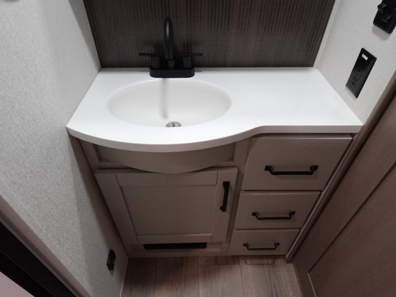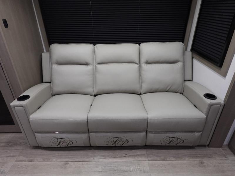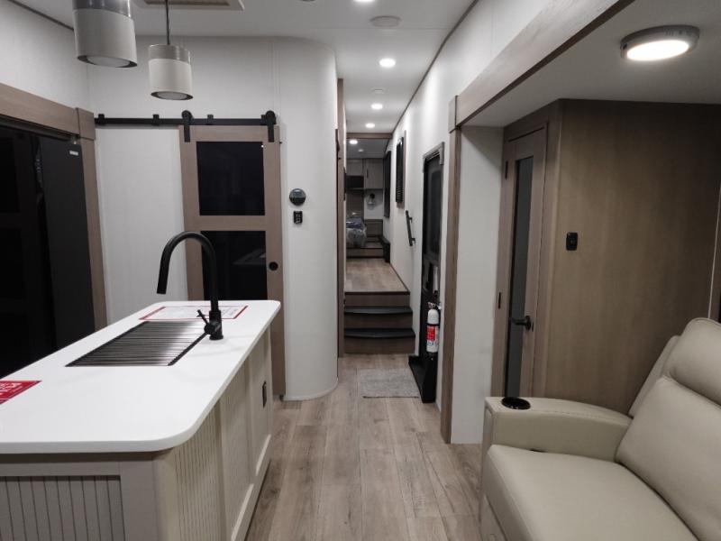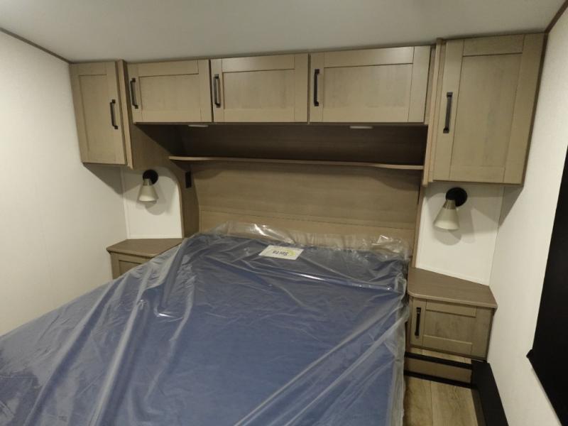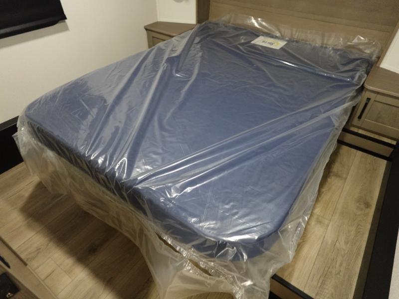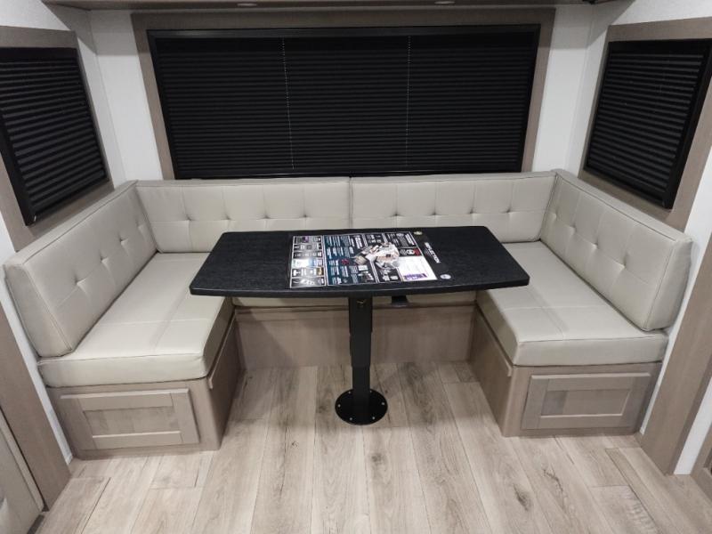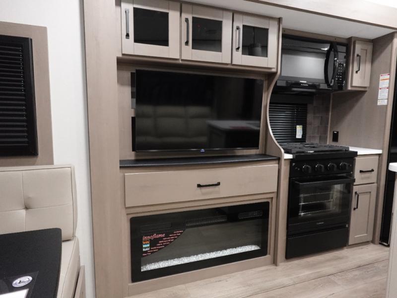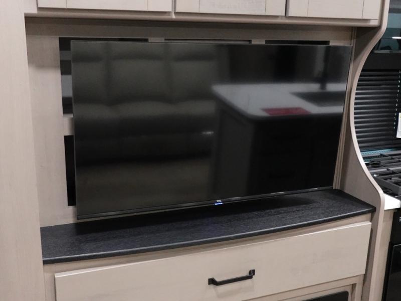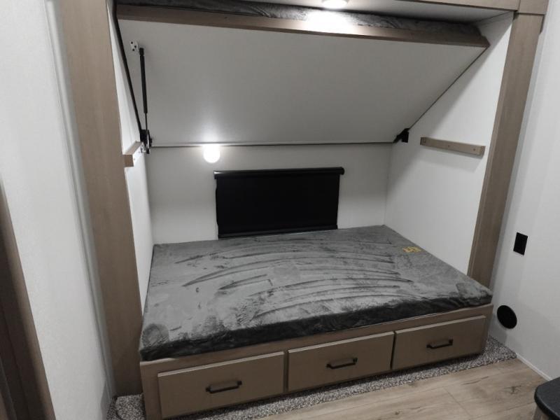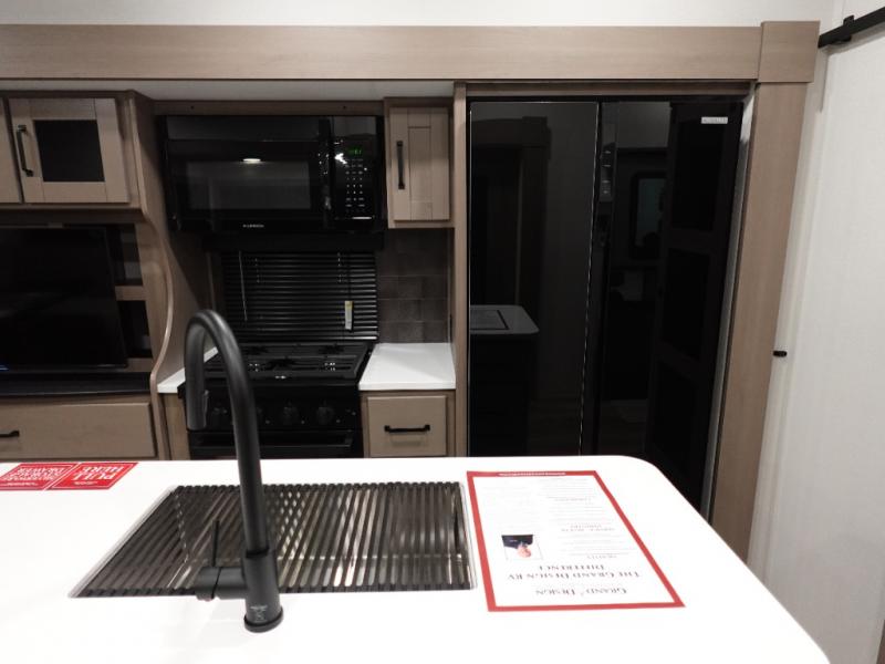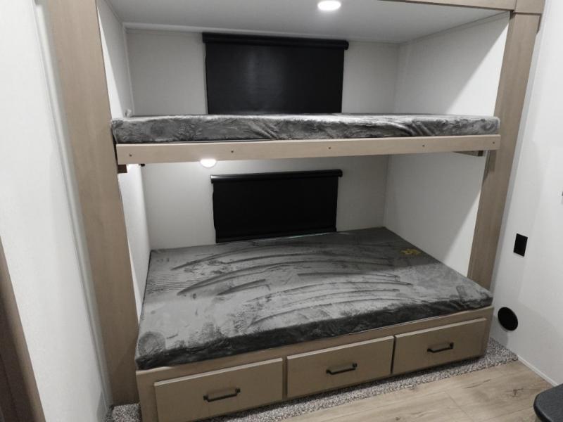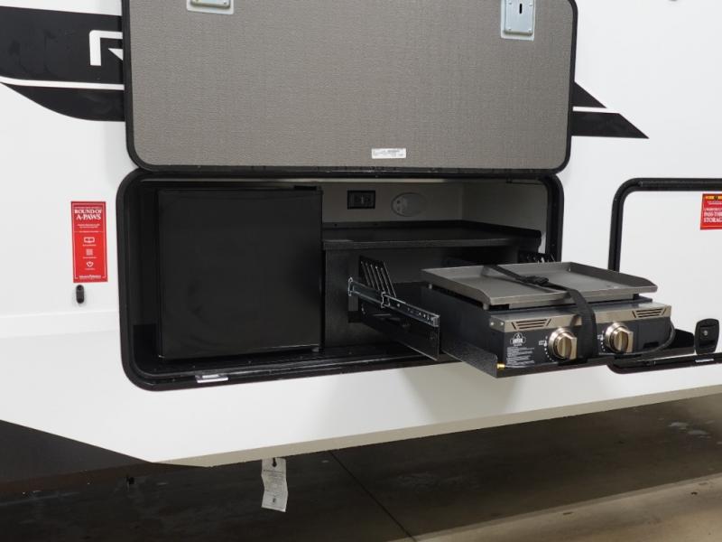 When you are looking for a versatile extra room for either a second bedroom or living area as well as an office, this middle bunkhouse might just work! There is a slide out with two bunks and drawers plus a dresser. You can sleep like a queen on the walk-around bed in the front private bedroom that offers more clothing storage and windows for views. The rear main living and kitchen area provides plenty of seating on the a 78" triple person theater seats, and on the 92" U-shaped lounge with table with windows within the slide for natural lighting and great views. The kitchen island gives the cook more space to make and serve meals, and the gourmet kitchen includes a 16 cu. ft. refrigerator, plus a pantry for dry goods. There is an exterior outside kitchen with a griddle and a 1.6 cu. ft. refrigerator for beverages and such, plus you will find an LP quick connect, Coax TV hookup, and a spray port to wash off your dirty shoes.