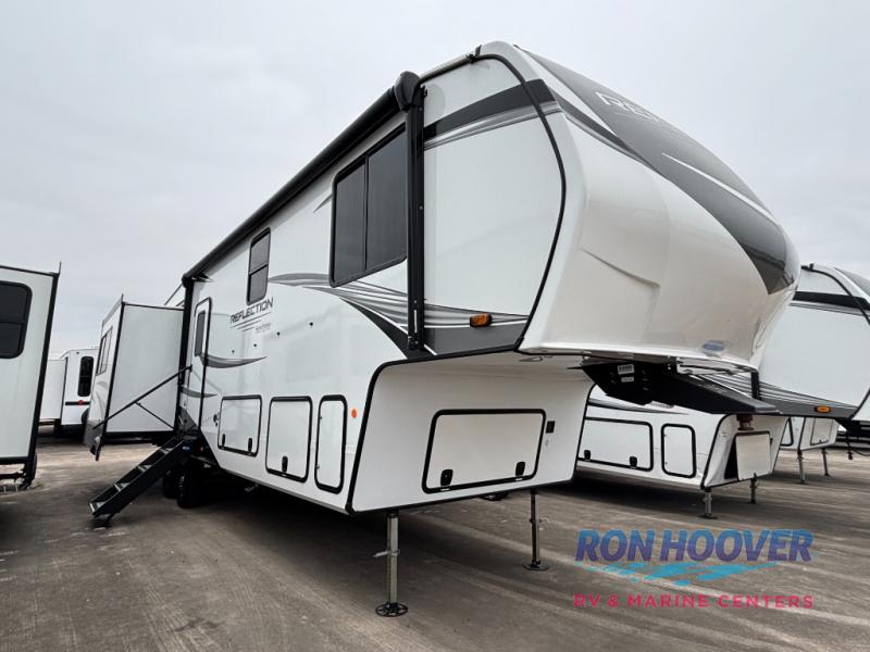 With any Reflection fifth wheel by Grand Design, you will have a solar panel for off-grid camping and a 60 amp charge controller and inverter prep, a Universal All-In-One docking station, unobstructed pass-through storage, and Goodyear Endurance tires. Each is constructed of gel coat exterior sidewalls, residential 5" truss rafters, walk-on roof decking, a fiberglass and radiant foil roof and front cap insulation plus laminated aluminum framed side walls, roof and end walls in slide rooms. Head inside to enjoy residential hardwood cabinet doors, premium Congoleum flooring, a spacious shower with a glass door, and many more comforts!