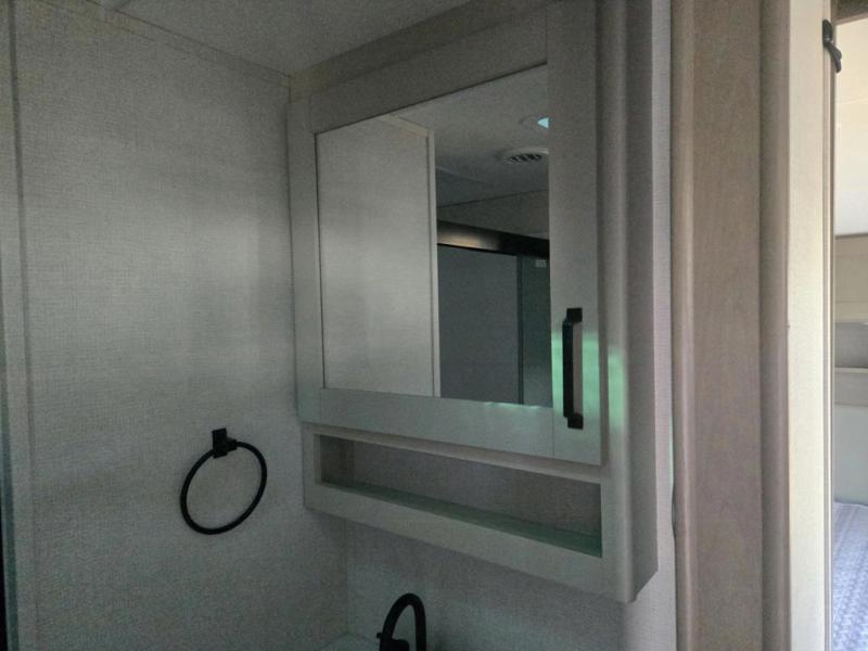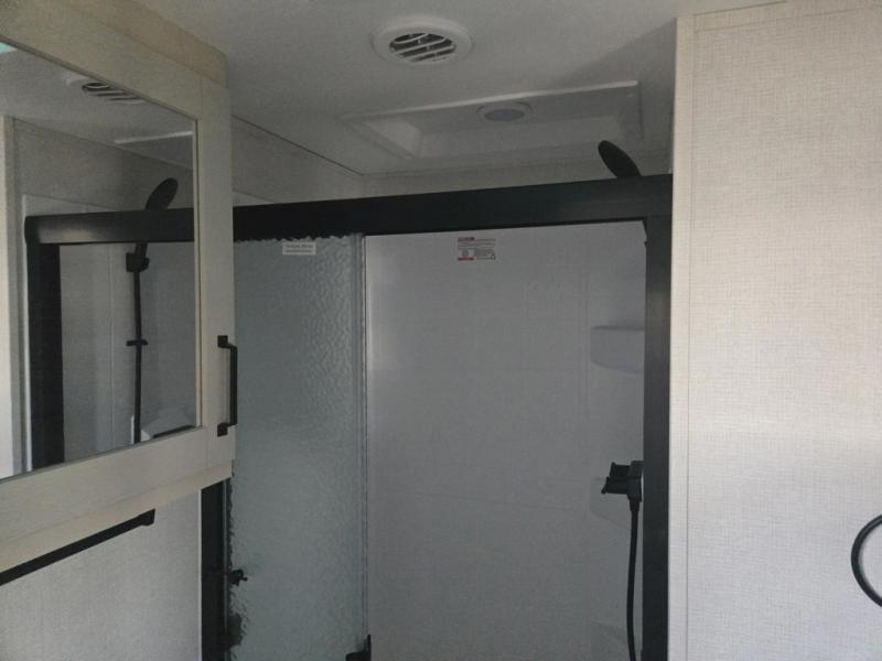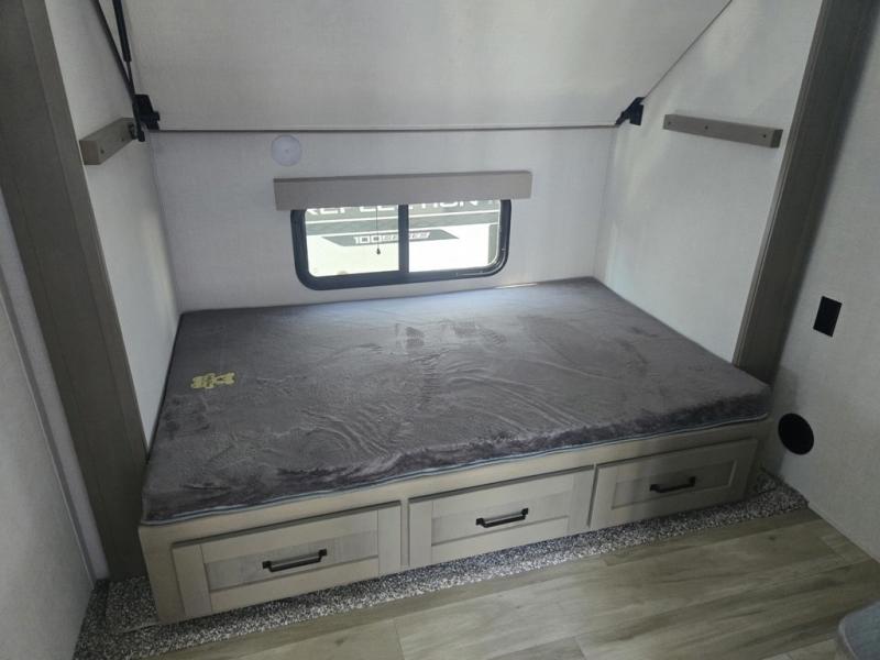 When you are looking for a versatile extra room for either a second bedroom or living area as well as an office, this middle bunkhouse might just work! There is a slide out with two bunks and drawers plus a dresser. You can sleep like a queen on the walk-around bed in the front private bedroom that offers more clothing storage and windows for views. The rear main living and kitchen area provides plenty of seating on the a 78" triple person theater seats, and on the 92" U-shaped lounge with table with windows within the slide for natural lighting and great views. The kitchen island gives the cook more space to make and serve meals, and the gourmet kitchen includes a 16 cu. ft. refrigerator, plus a pantry for dry goods. There is an exterior outside kitchen with a griddle and a 1.6 cu. ft. refrigerator for beverages and such, plus you will find an LP quick connect, Coax TV hookup, and a spray port to wash off your dirty shoes.