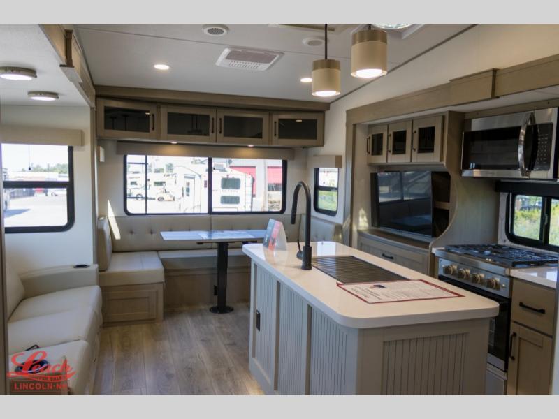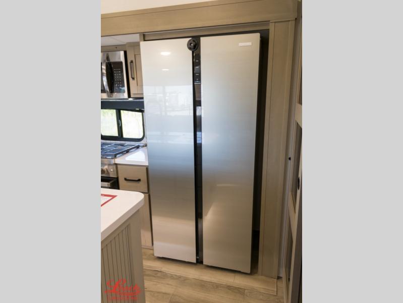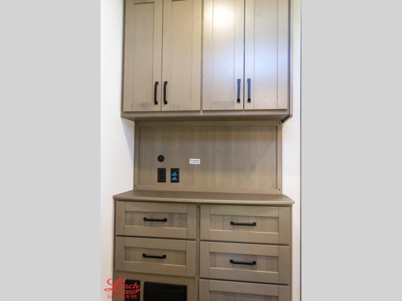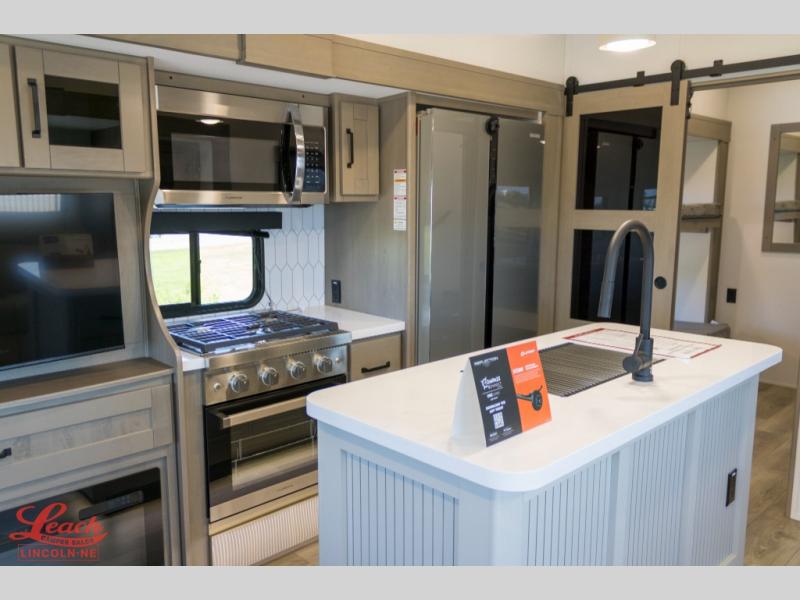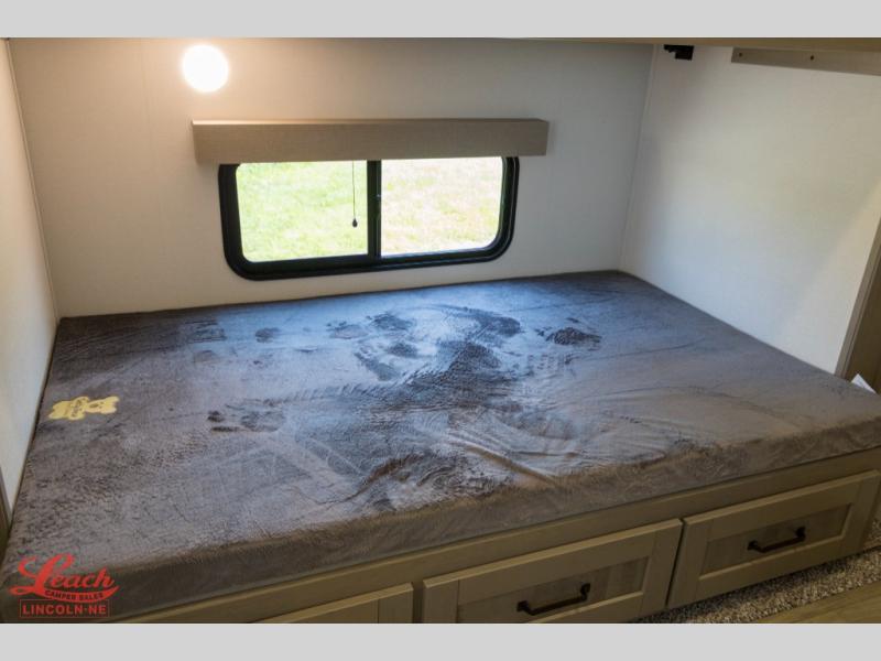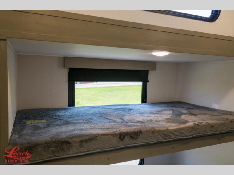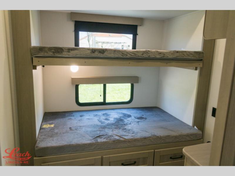 When you are looking for a versatile extra room for either a second bedroom or living area as well as an office, this middle bunkhouse might just work! There is a slide out with two bunks and drawers plus a dresser. You can sleep like a queen on the walk-around bed in the front private bedroom that offers more clothing storage and windows for views. The rear main living and kitchen area provides plenty of seating on the a 78" triple person theater seats, and on the 92" U-shaped lounge with table with windows within the slide for natural lighting and great views. The kitchen island gives the cook more space to make and serve meals, and the gourmet kitchen includes a 16 cu. ft. refrigerator, plus a pantry for dry goods. There is an exterior outside kitchen with a griddle and a 1.6 cu. ft. refrigerator for beverages and such, plus you will find an LP quick connect, Coax TV hookup, and a spray port to wash off your dirty shoes.
