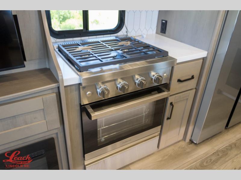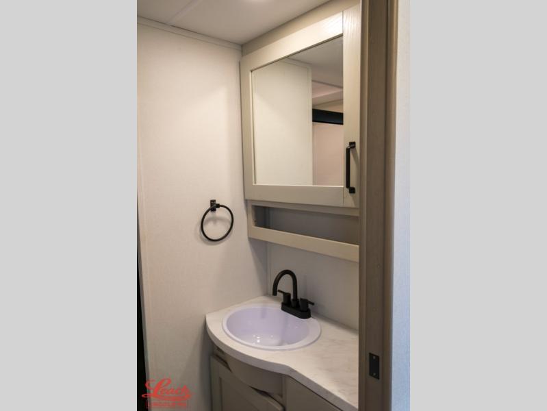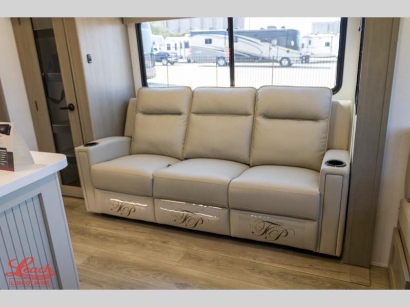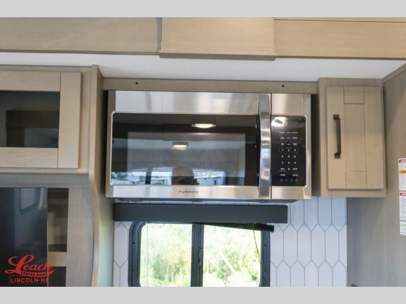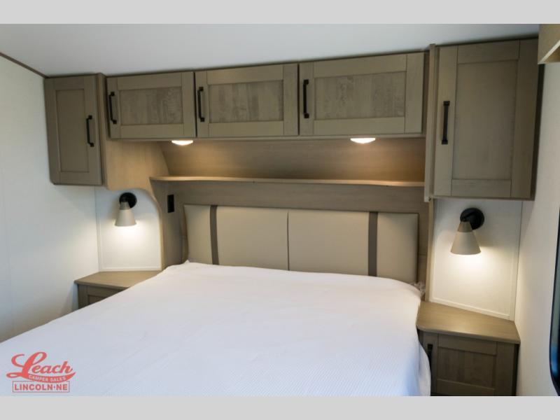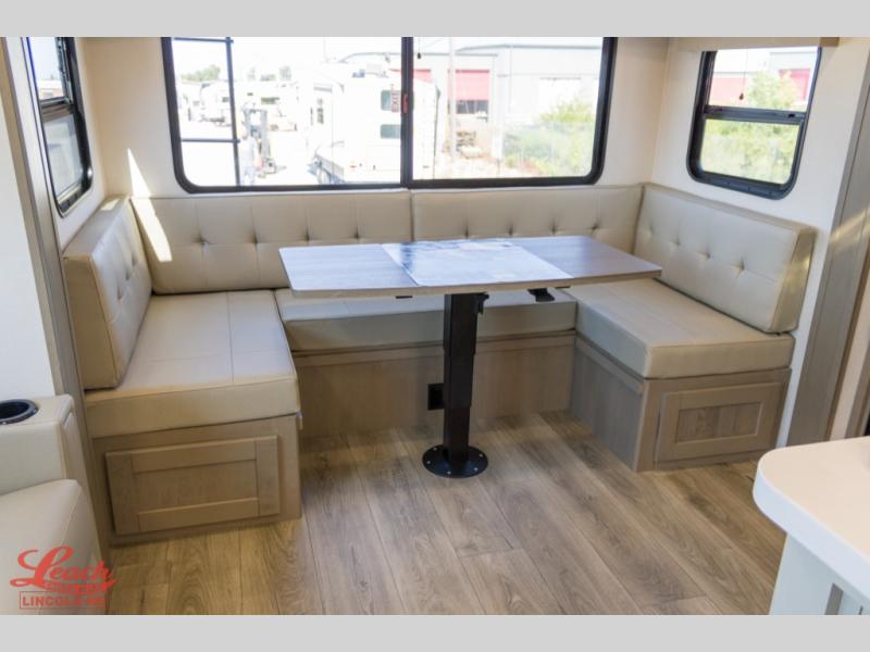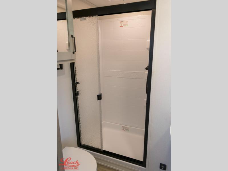 When you are looking for a versatile extra room for either a second bedroom or living area as well as an office, this middle bunkhouse might just work! There is a slide out with two bunks and drawers plus a dresser. You can sleep like a queen on the walk-around bed in the front private bedroom that offers more clothing storage and windows for views. The rear main living and kitchen area provides plenty of seating on the a 78" triple person theater seats, and on the 92" U-shaped lounge with table with windows within the slide for natural lighting and great views. The kitchen island gives the cook more space to make and serve meals, and the gourmet kitchen includes a 16 cu. ft. refrigerator, plus a pantry for dry goods. There is an exterior outside kitchen with a griddle and a 1.6 cu. ft. refrigerator for beverages and such, plus you will find an LP quick connect, Coax TV hookup, and a spray port to wash off your dirty shoes.