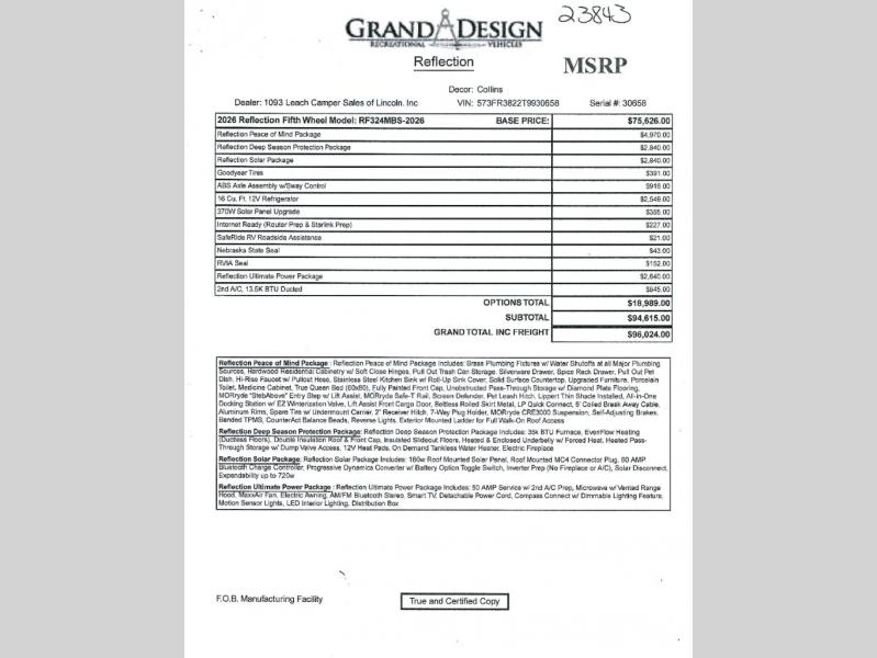 New 2026 Grand Design Reflection 324MBS Fifth Wheel