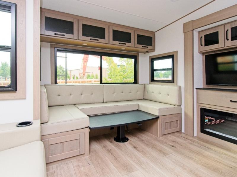 Inside, enjoy a private front bedroom with a walk-around queen bed, ample wardrobe space, and scenic windows. The middle bunkhouse offers a flexible space that can serve as a second bedroom, office, or playroom. The rear living area features panoramic windows, plush seating, and a large dining space—perfect for family meals or game nights.