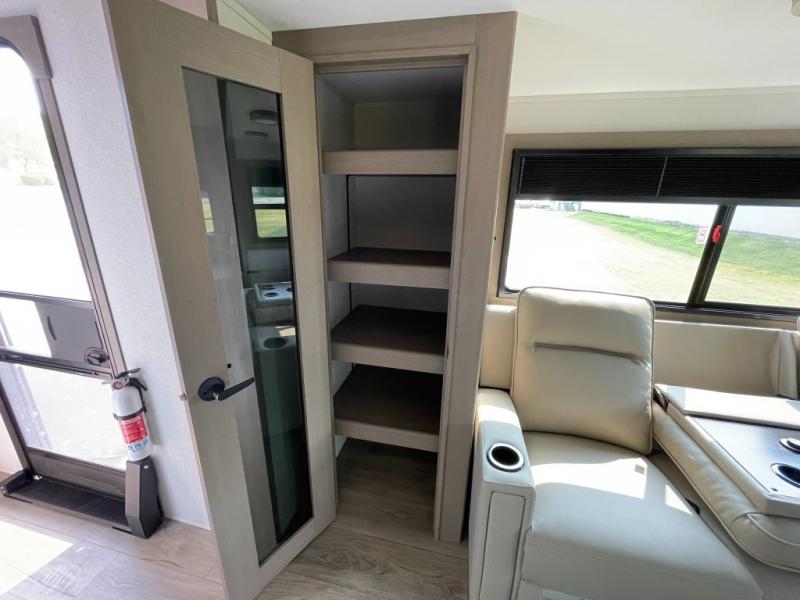 Gourmet Kitchen Setup – Includes a 16 cu. ft. refrigerator, large pantry, kitchen island, and plenty of prep space for cooking at the campsite or full-time living.