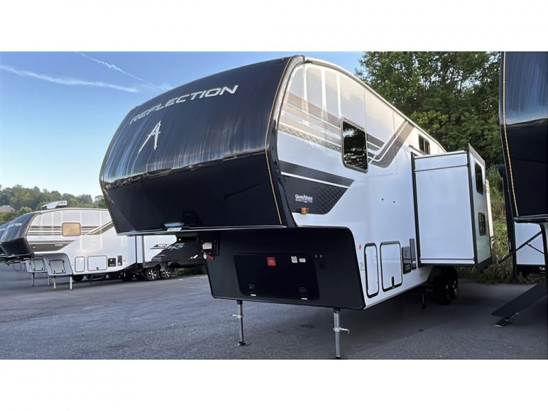 With any Reflection fifth wheel by Grand Design, you will have a solar panel for off-grid camping and a 60 amp charge controller and inverter prep, a Universal All-In-One docking station, unobstructed pass-through storage, and Goodyear Endurance tires. Each is constructed of gel coat exterior sidewalls, residential 5" truss rafters, walk-on roof decking, a fiberglass and radiant foil roof and front cap insulation plus laminated aluminum framed side walls, roof and end walls in slide rooms. Head inside to enjoy residential hardwood cabinet doors, premium Congoleum flooring, a spacious shower with a glass door, and many more comforts!