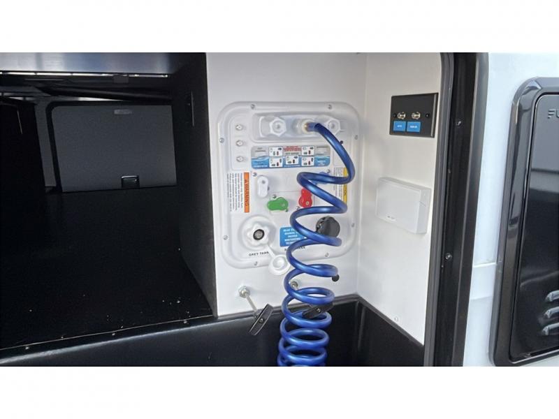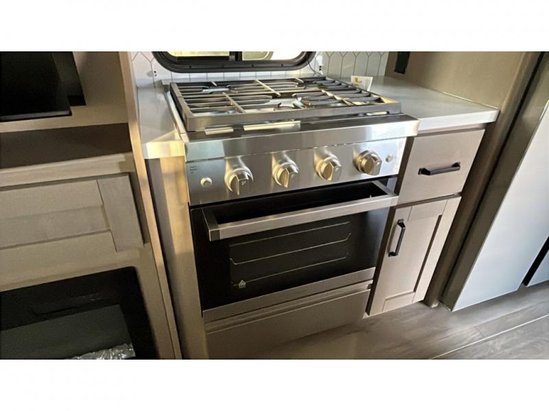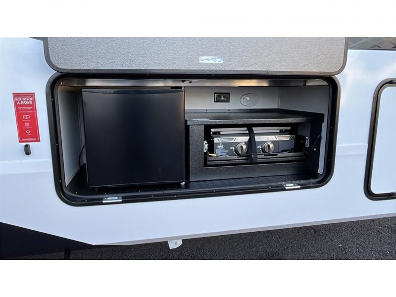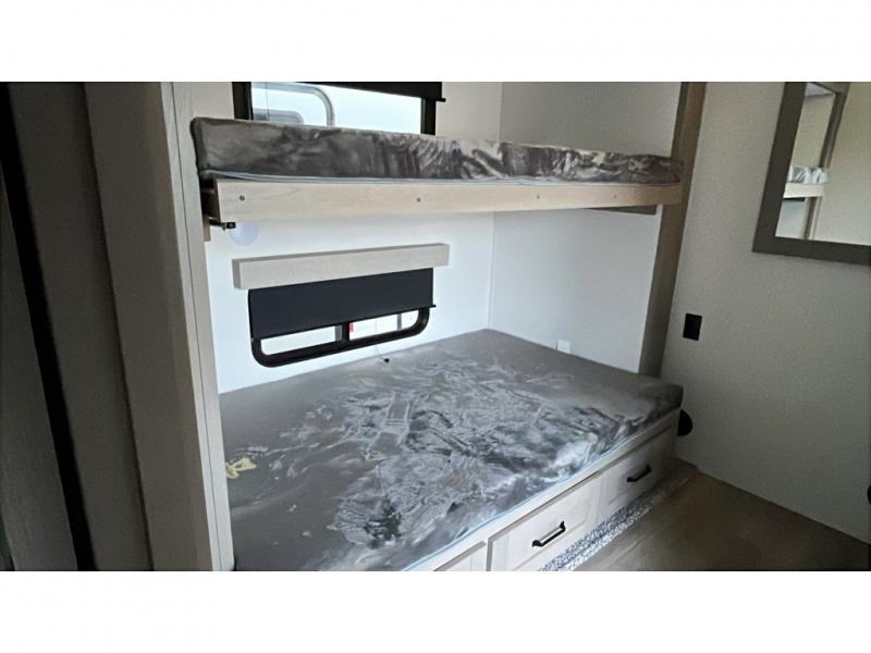 When you are looking for a versatile extra room for either a second bedroom or living area as well as an office, this middle bunkhouse might just work! There is a slide out with two bunks and drawers plus a dresser. You can sleep like a queen on the walk-around bed in the front private bedroom that offers more clothing storage and windows for views. The rear main living and kitchen area provides plenty of seating on the a 78" triple person theater seats, and on the 92" U-shaped lounge with table with windows within the slide for natural lighting and great views. The kitchen island gives the cook more space to make and serve meals, and the gourmet kitchen includes a 16 cu. ft. refrigerator, plus a pantry for dry goods. There is an exterior outside kitchen with a griddle and a 1.6 cu. ft. refrigerator for beverages and such, plus you will find an LP quick connect, Coax TV hookup, and a spray port to wash off your dirty shoes.