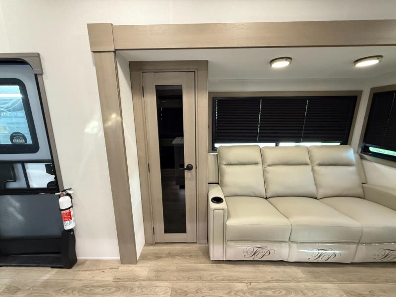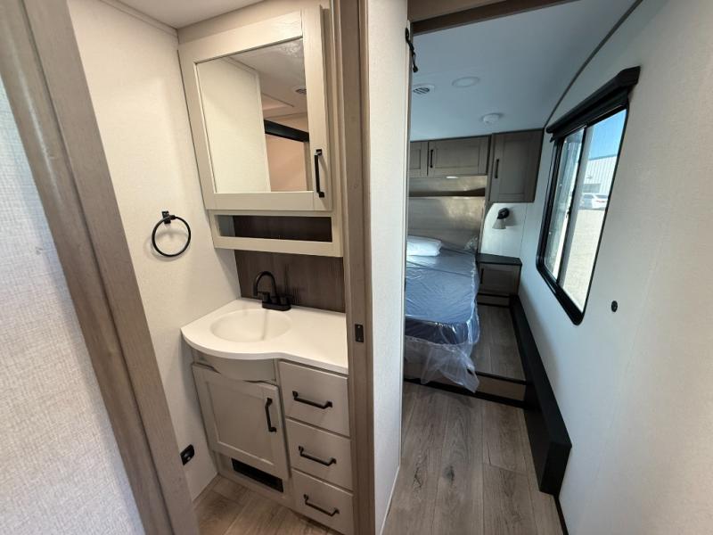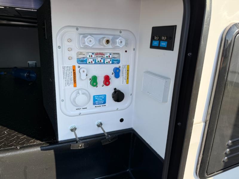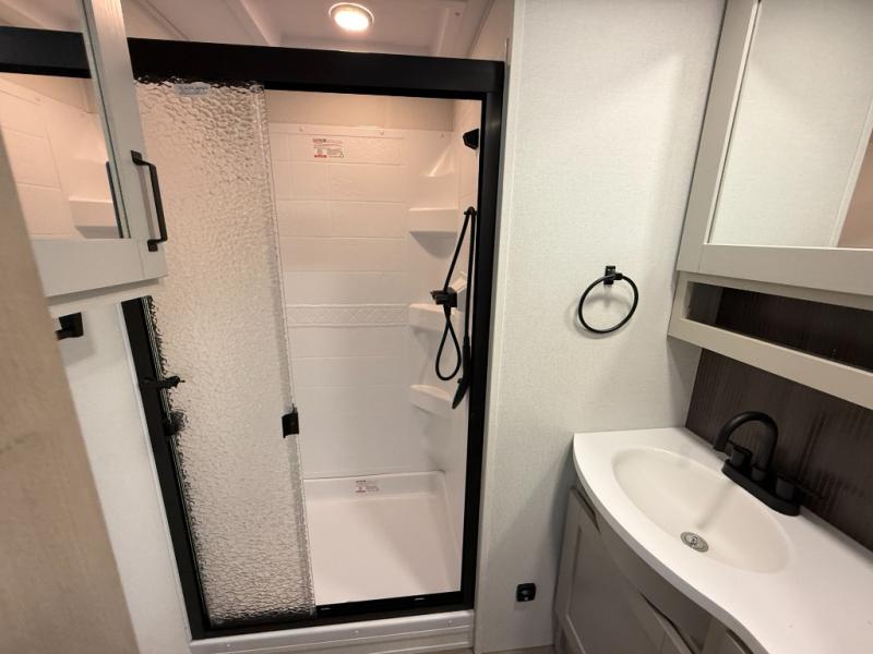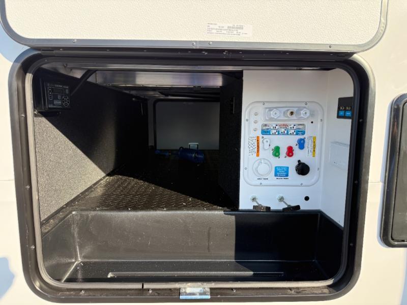 When you are looking for a versatile extra room for either a second bedroom or living area as well as an office, this middle bunkhouse might just work! There is a slide out with two bunks and drawers plus a dresser. You can sleep like a queen on the walk-around bed in the front private bedroom that offers more clothing storage and windows for views. The rear main living and kitchen area provides plenty of seating on the a 78" triple person theater seats, and on the 92" U-shaped lounge with table with windows within the slide for natural lighting and great views. The kitchen island gives the cook more space to make and serve meals, and the gourmet kitchen includes a 16 cu. ft. refrigerator, plus a pantry for dry goods. There is an exterior outside kitchen with a griddle and a 1.6 cu. ft. refrigerator for beverages and such, plus you will find an LP quick connect, Coax TV hookup, and a spray port to wash off your dirty shoes.
