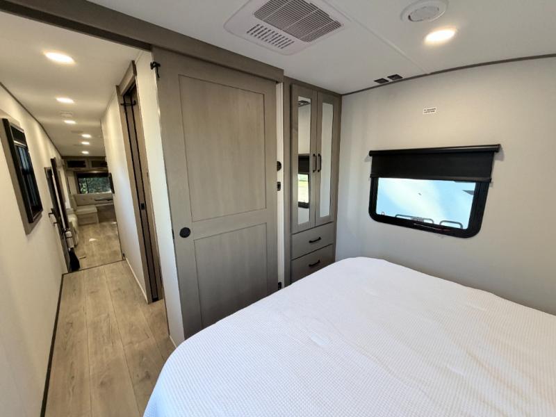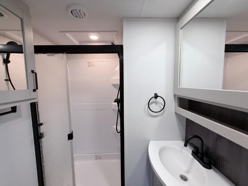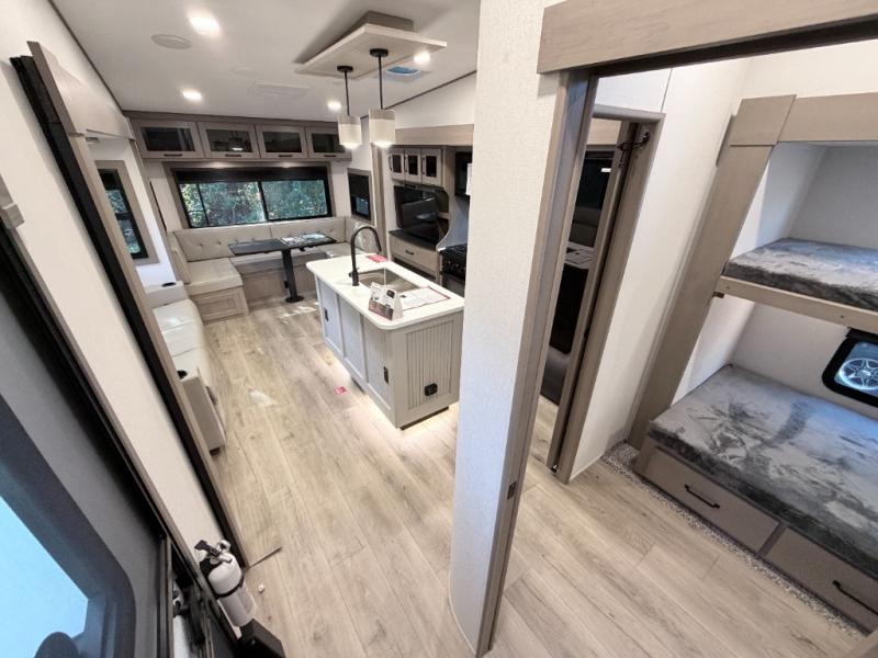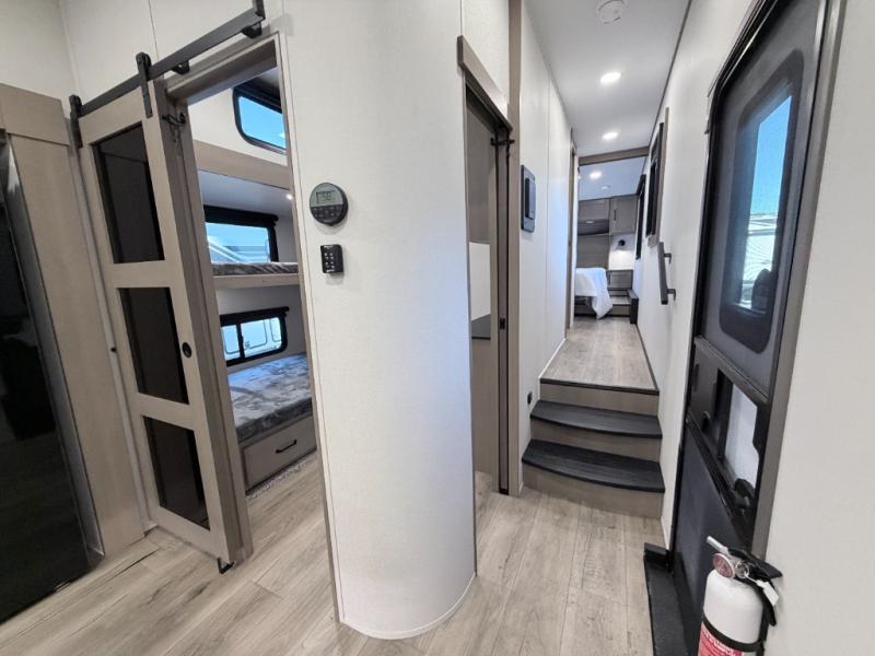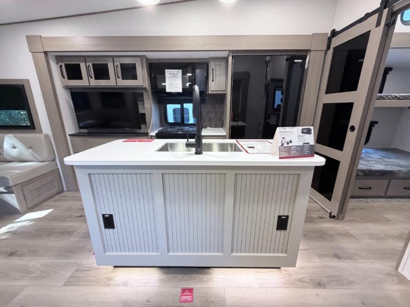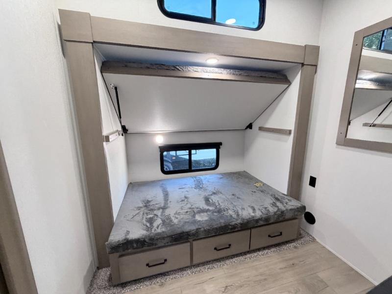 When you need a versatile extra room, this middle bunkhouse delivers with a slide-out featuring dual bunks and drawers, plus a full-size dresser. Whether used as a second bedroom, private lounge, or dedicated office, this space adapts to your needs with ease.