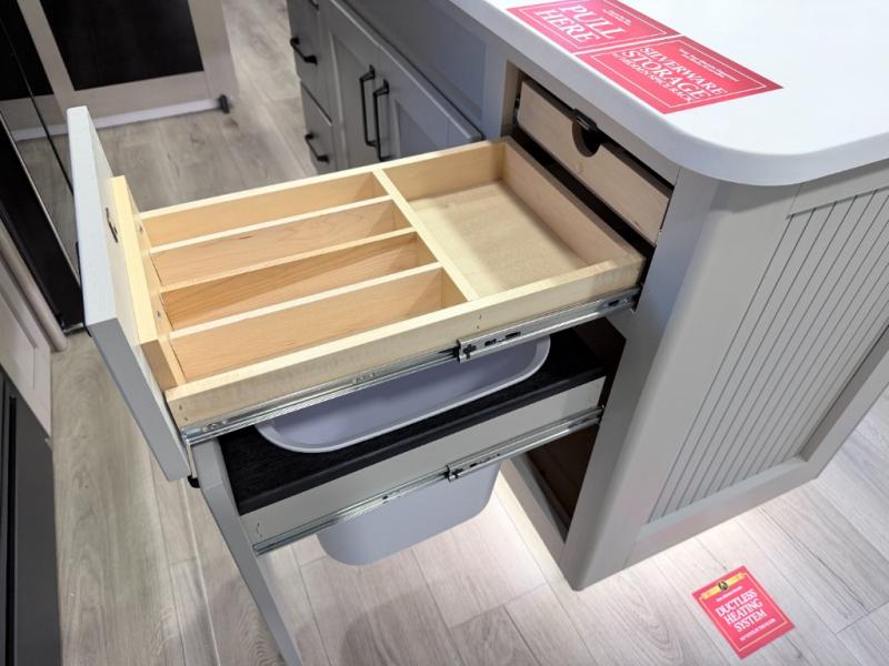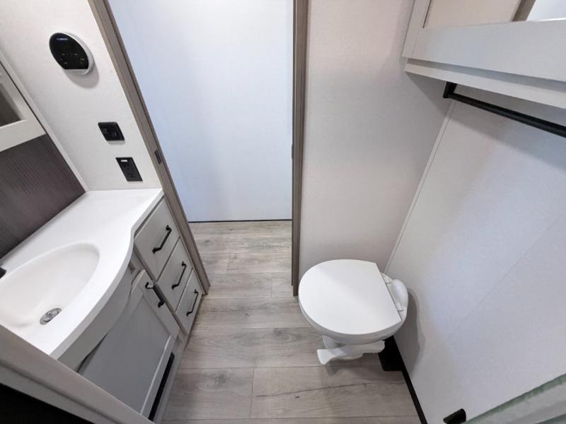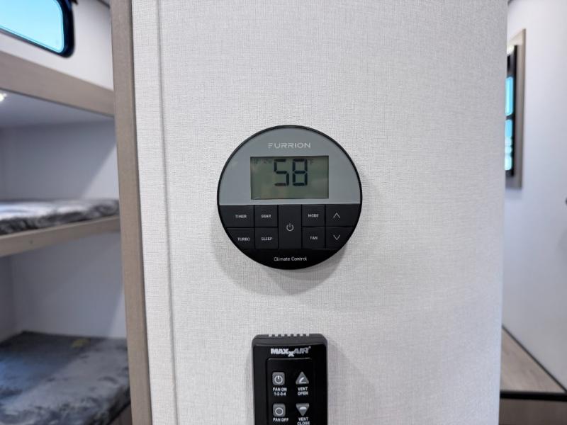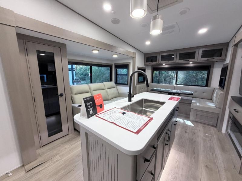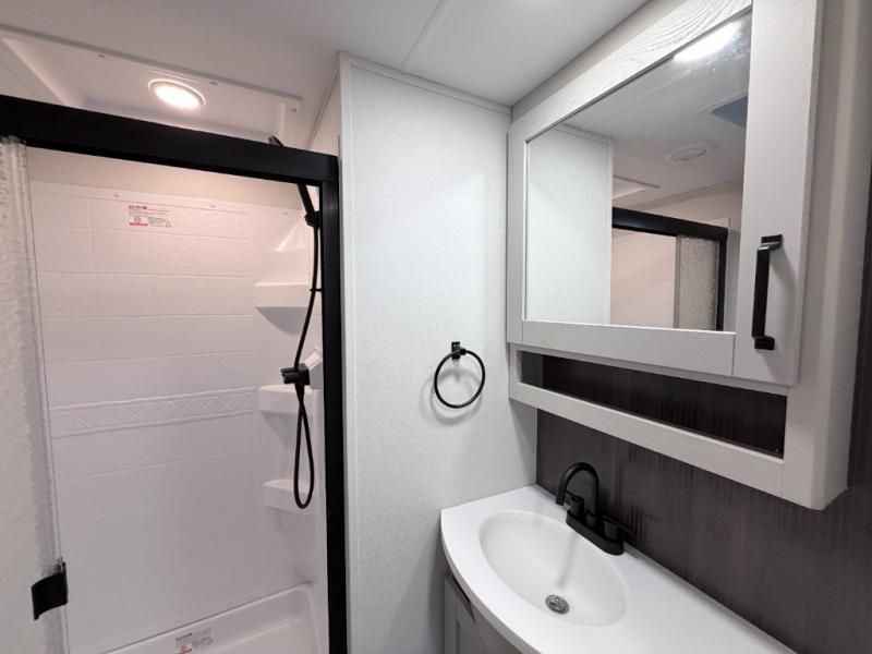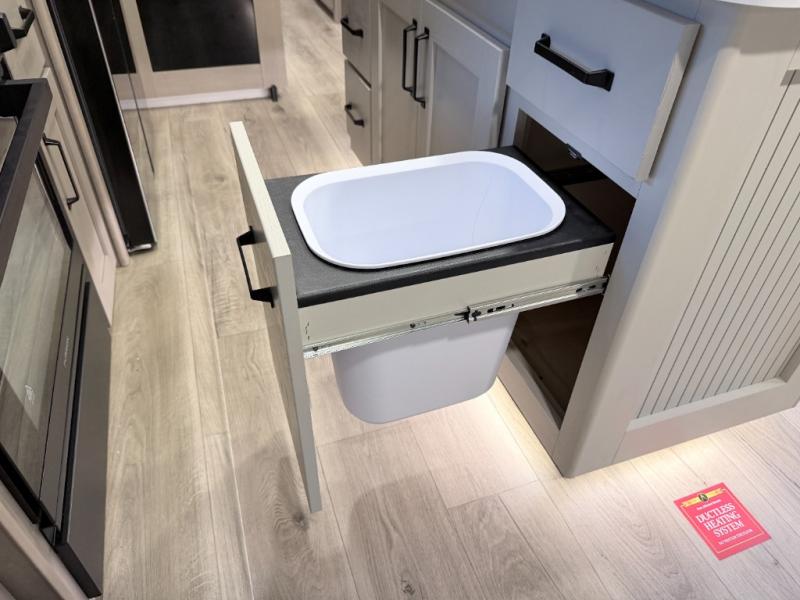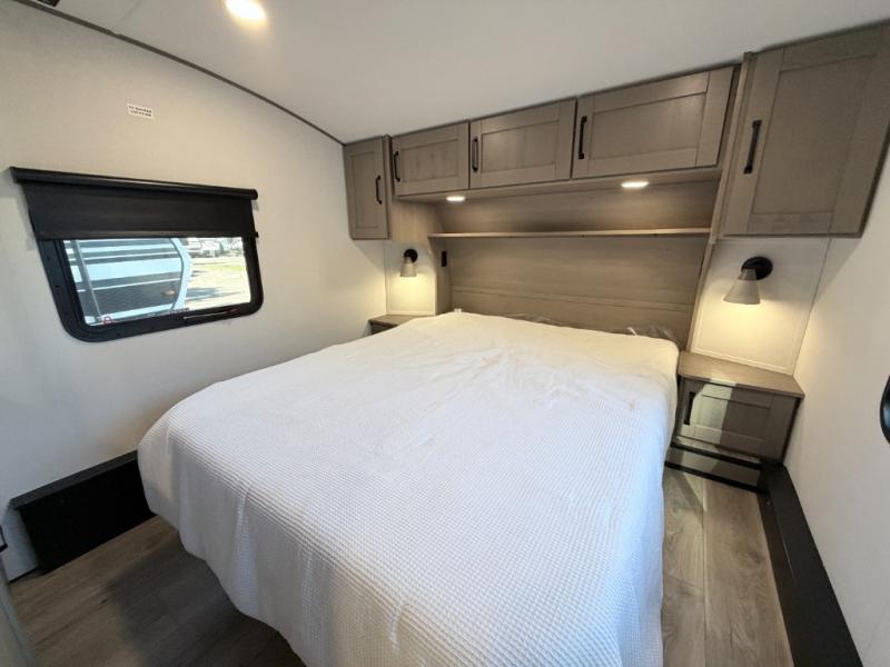 When you need a versatile extra room, this middle bunkhouse delivers with a slide-out featuring dual bunks and drawers, plus a full-size dresser. Whether used as a second bedroom, private lounge, or dedicated office, this space adapts to your needs with ease.