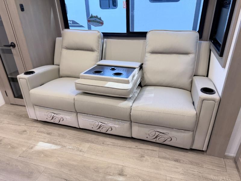 Relax and unwind in the expansive rear living space featuring 78" triple theater seats and a massive 92" U-shaped lounge with a table. Large windows within the slide-out provide beautiful campsite views and plenty of natural lighting. Enjoy cozy evenings by the 40" TV and fireplace combo.