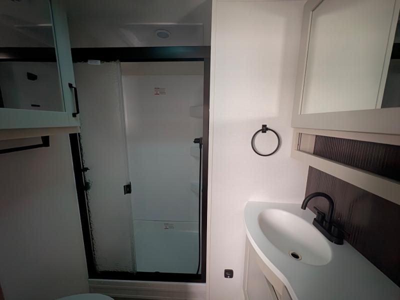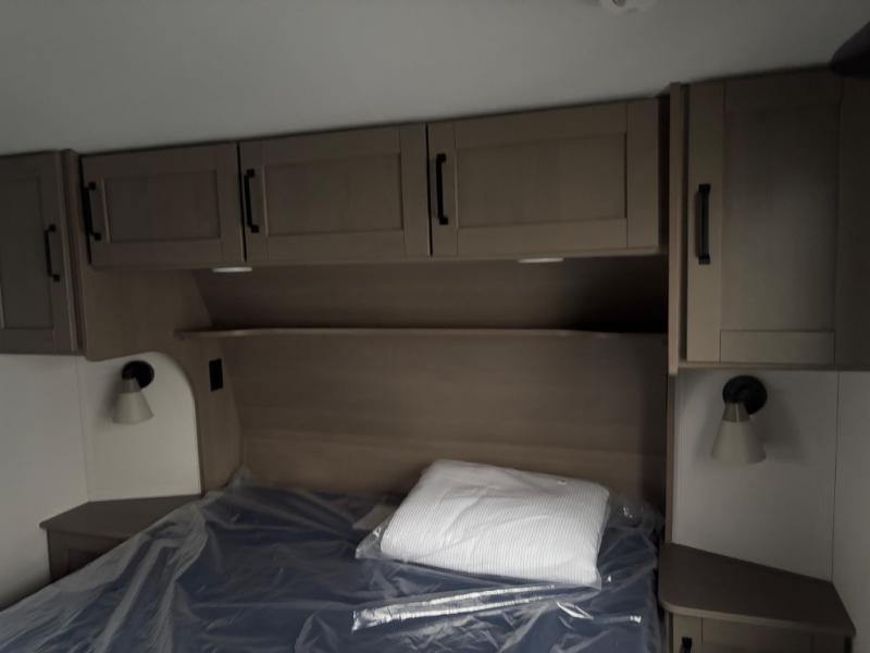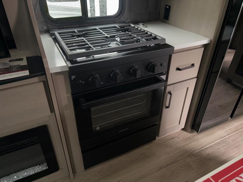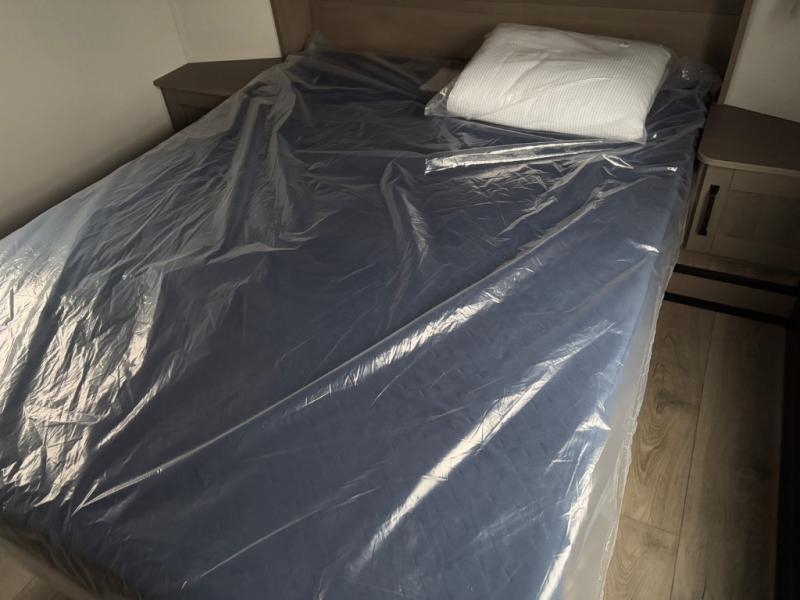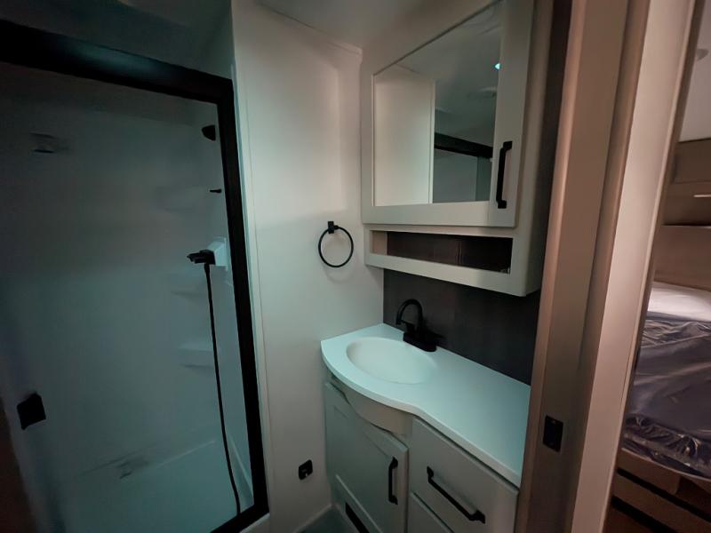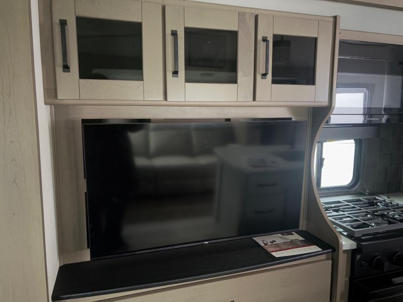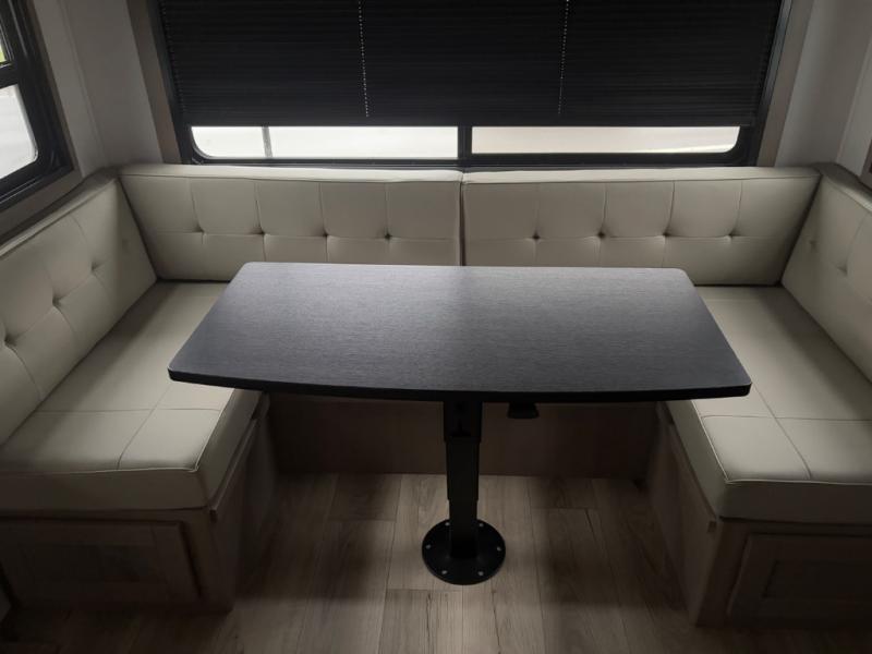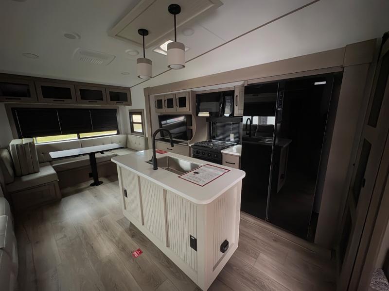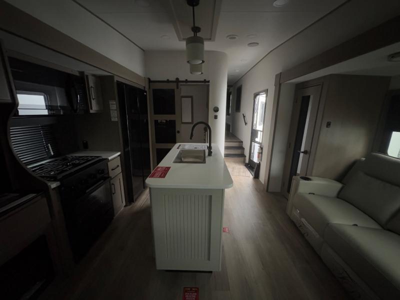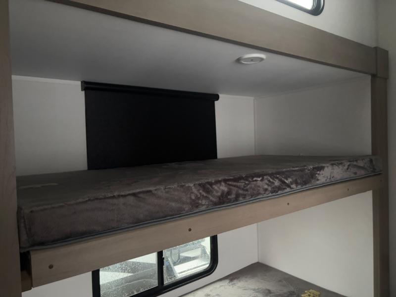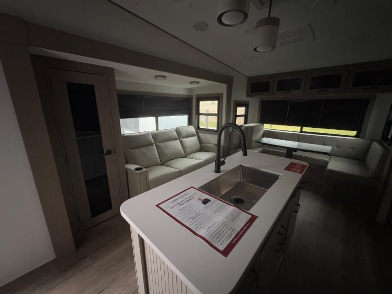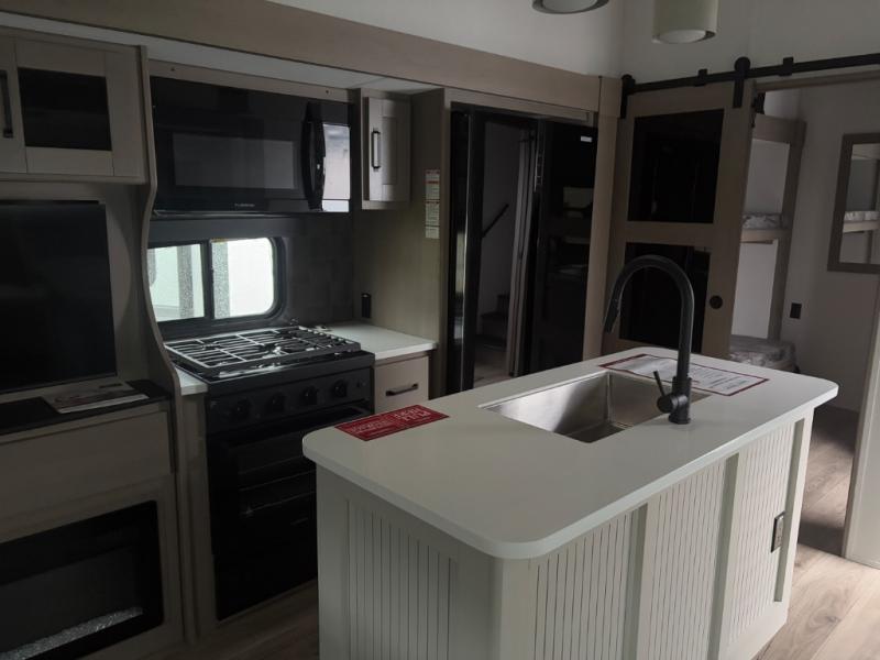 When you are looking for a versatile extra room for either a second bedroom or living area as well as an office, this middle bunkhouse might just work! There is a slide out with two bunks and drawers plus a dresser. You can sleep like a queen on the walk-around bed in the front private bedroom that offers more clothing storage and windows for views. The rear main living and kitchen area provides plenty of seating on the a 78" triple person theater seats, and on the 92" U-shaped lounge with table with windows within the slide for natural lighting and great views. The kitchen island gives the cook more space to make and serve meals, and the gourmet kitchen includes a 16 cu. ft. refrigerator, plus a pantry for dry goods. There is an exterior outside kitchen with a griddle and a 1.6 cu. ft. refrigerator for beverages and such, plus you will find an LP quick connect, Coax TV hookup, and a spray port to wash off your dirty shoes.