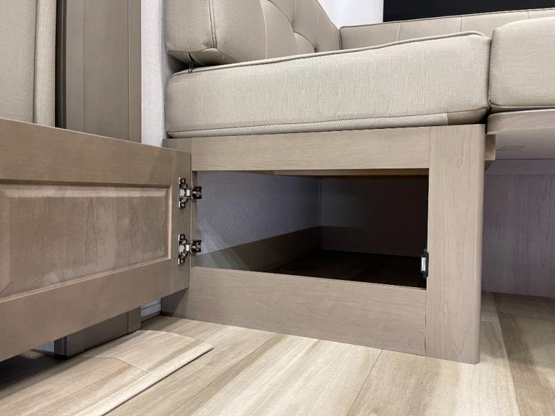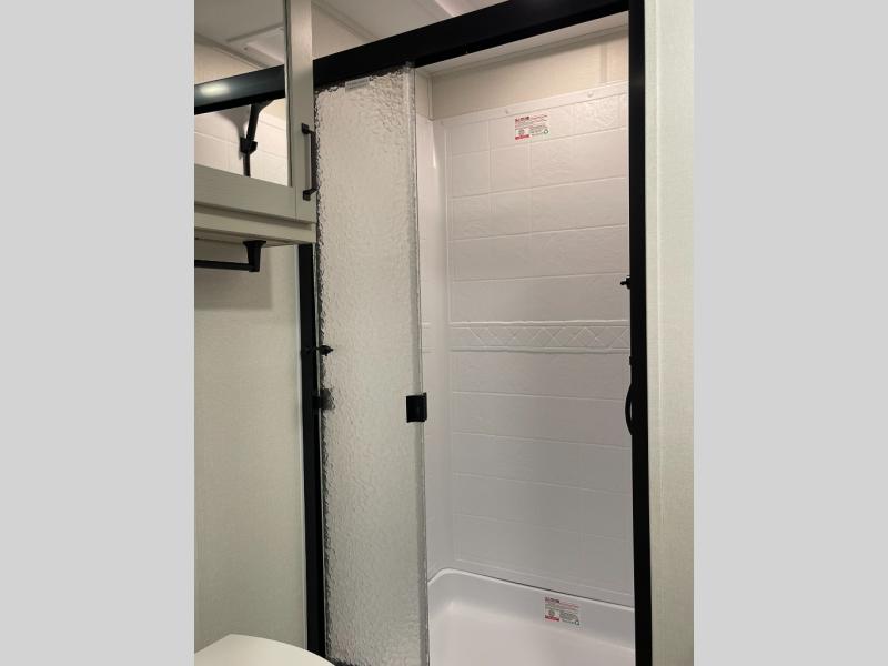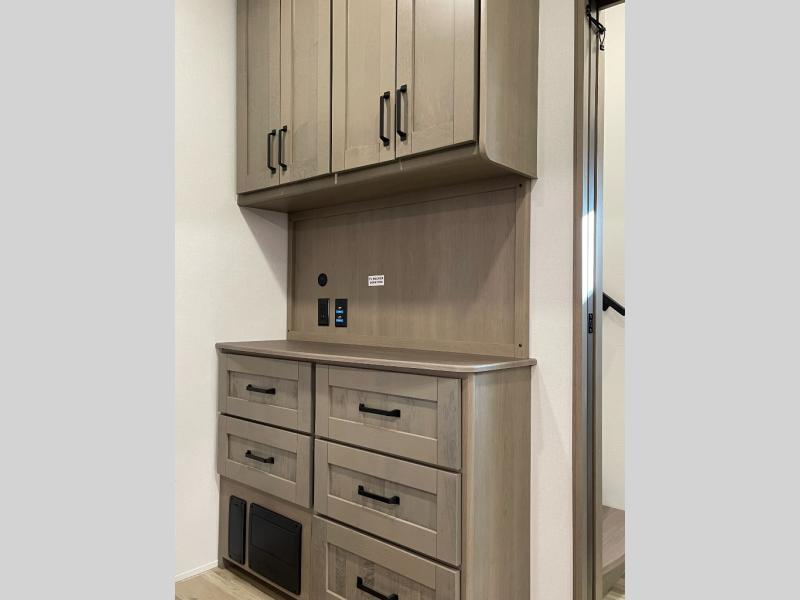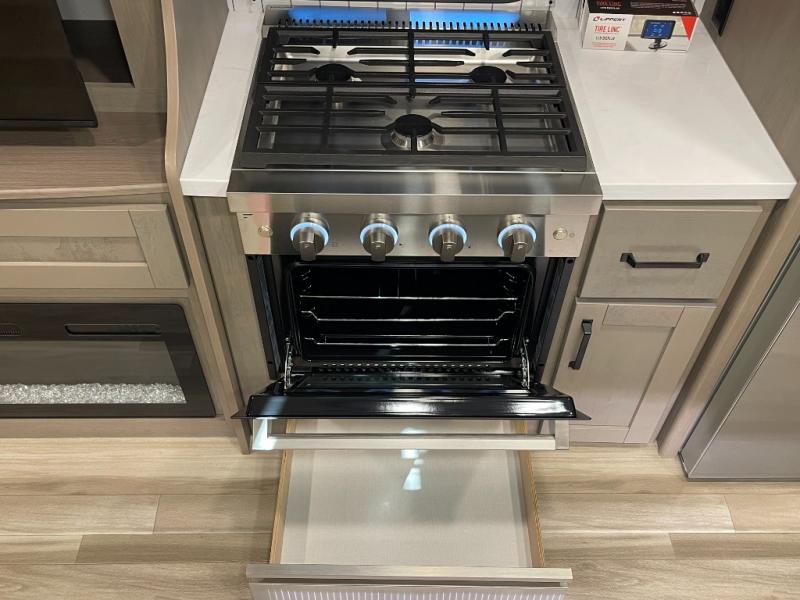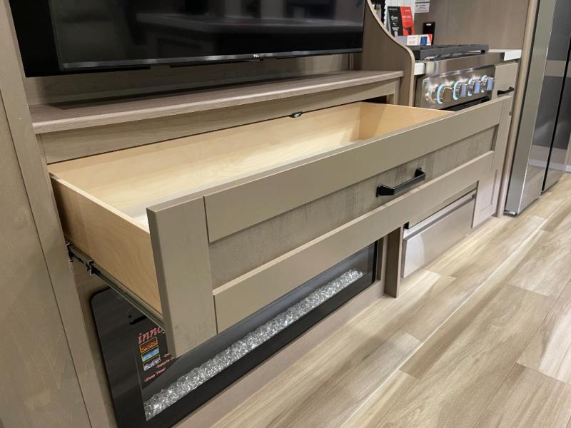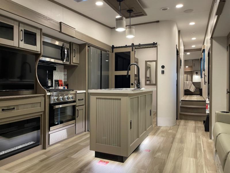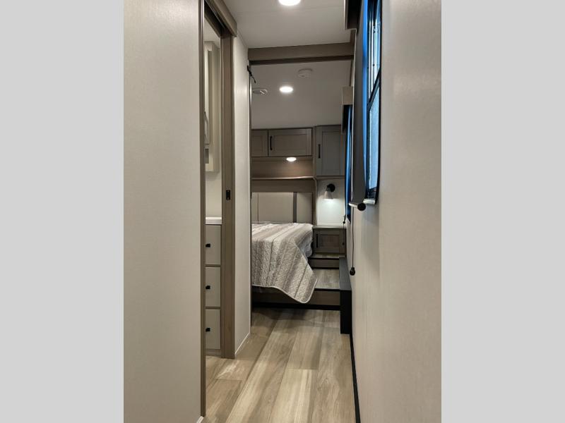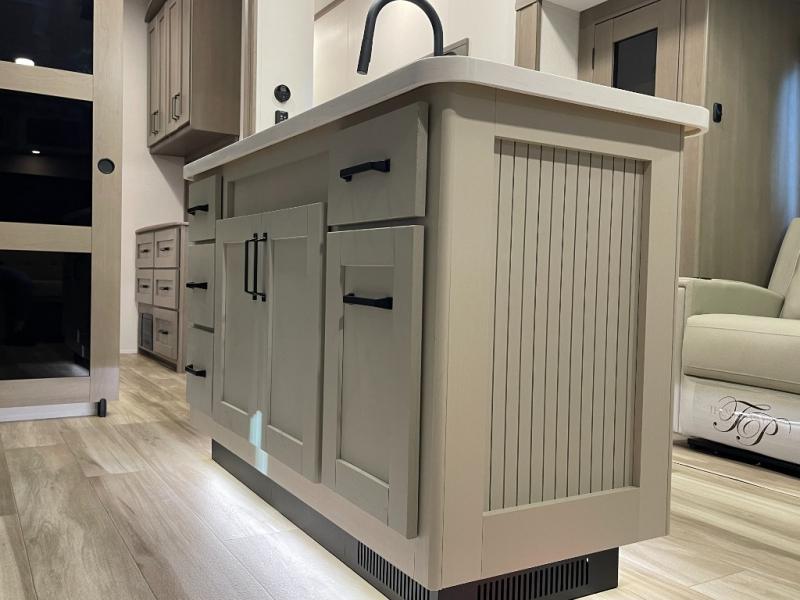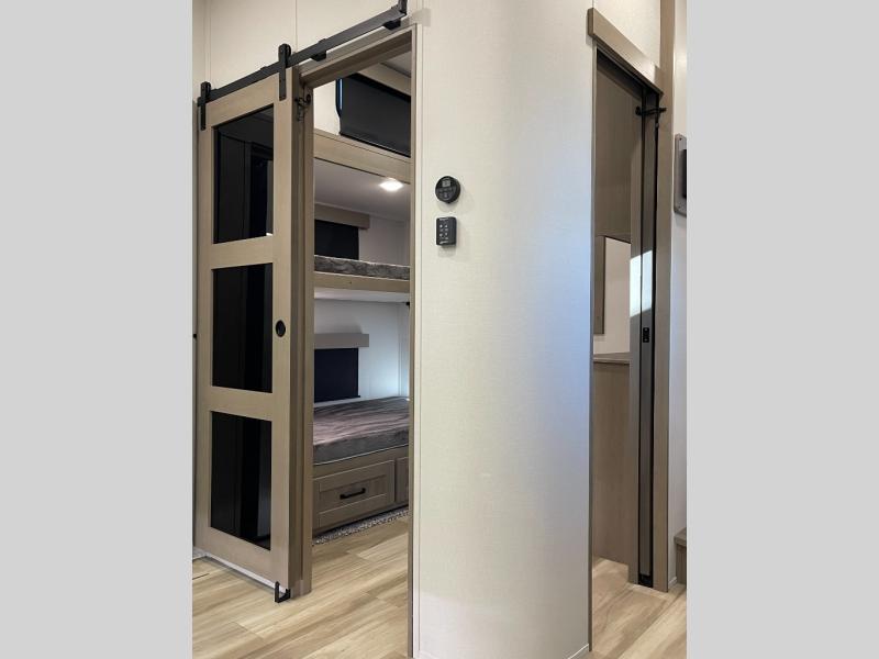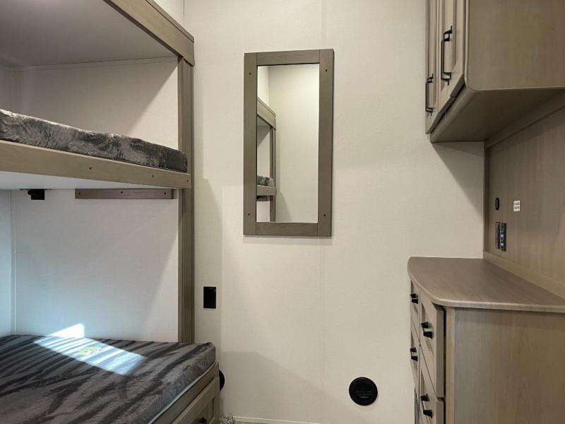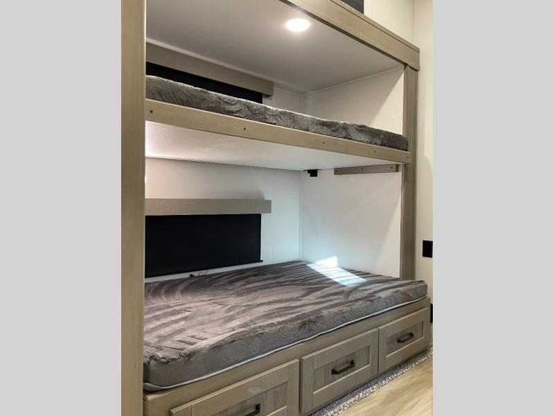 When you are looking for a versatile extra room for either a second bedroom or living area as well as an office, this middle bunkhouse might just work! There is a slide out with two bunks and drawers plus a dresser. You can sleep like a queen on the walk-around bed in the front private bedroom that offers more clothing storage and windows for views. The rear main living and kitchen area provides plenty of seating on the a 78" triple person theater seats, and on the 92" U-shaped lounge with table with windows within the slide for natural lighting and great views. The kitchen island gives the cook more space to make and serve meals, and the gourmet kitchen includes a 16 cu. ft. refrigerator, plus a pantry for dry goods. There is an exterior outside kitchen with a griddle and a 1.6 cu. ft. refrigerator for beverages and such, plus you will find an LP quick connect, Coax TV hookup, and a spray port to wash off your dirty shoes.