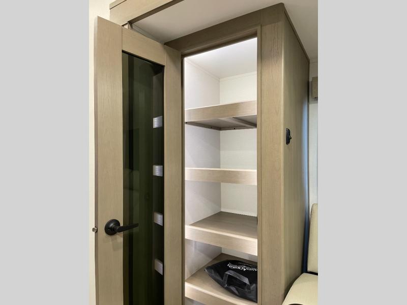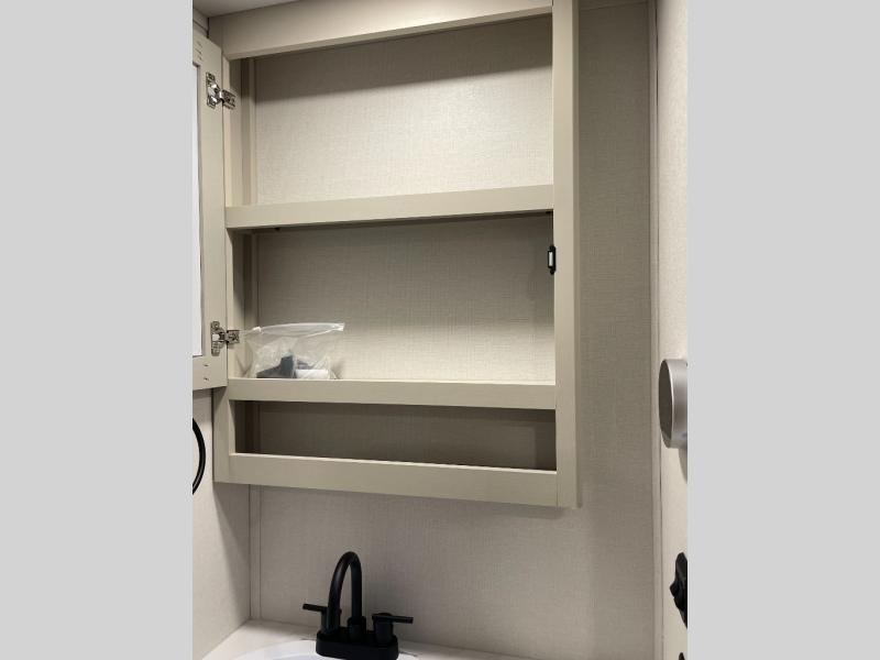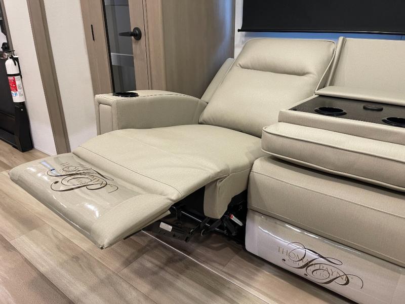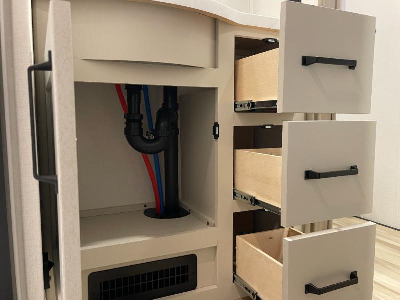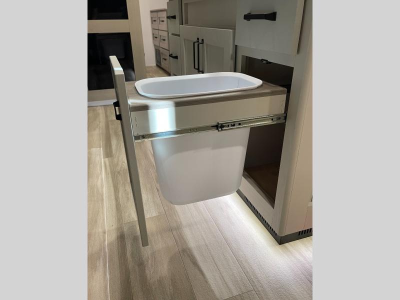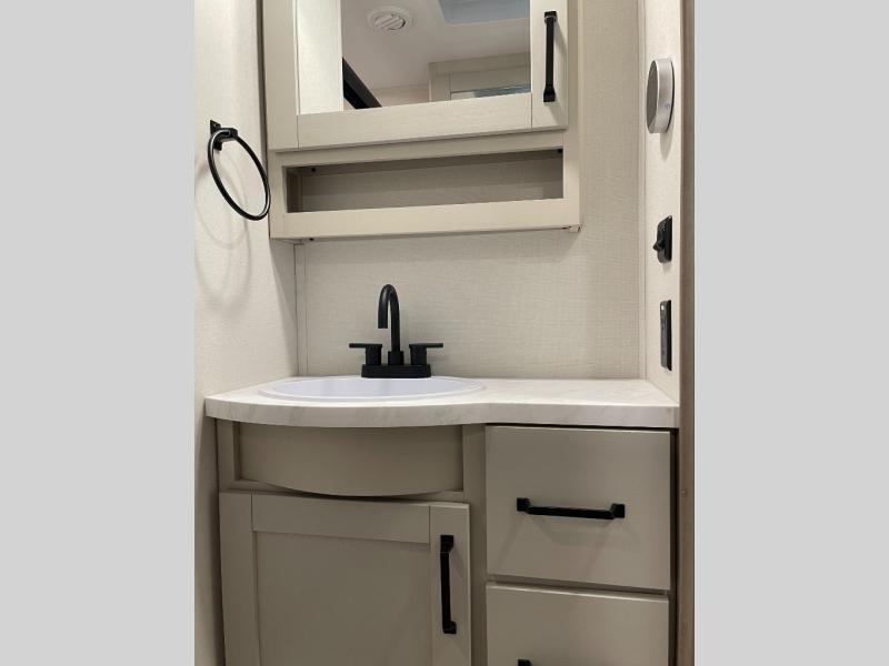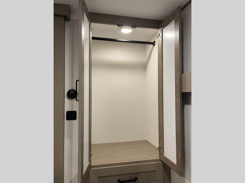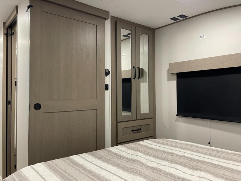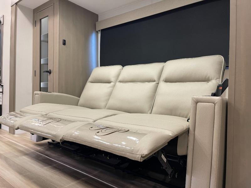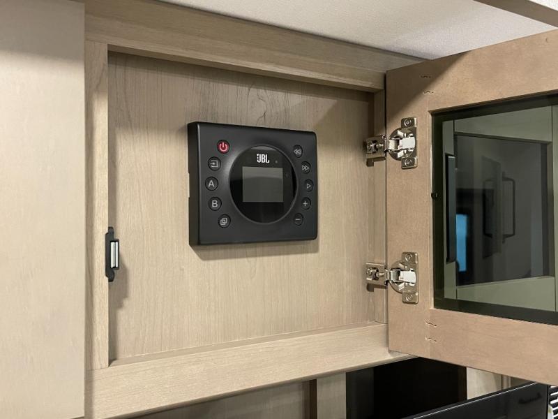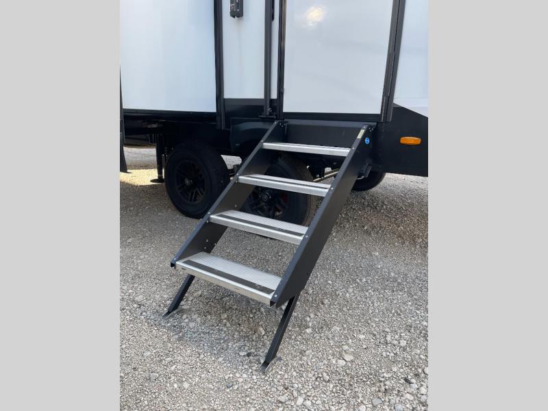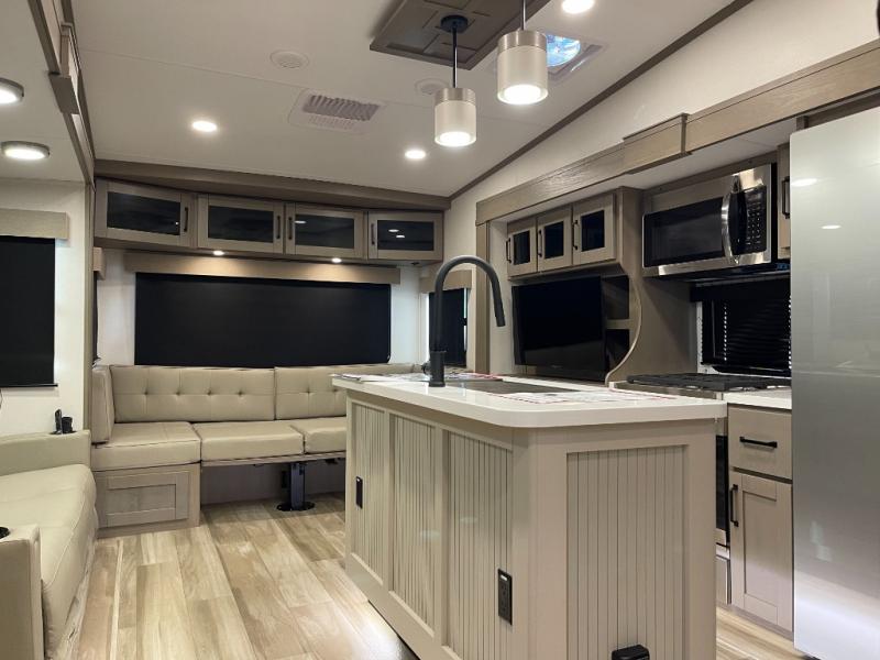 When you are looking for a versatile extra room for either a second bedroom or living area as well as an office, this middle bunkhouse might just work! There is a slide out with two bunks and drawers plus a dresser. You can sleep like a queen on the walk-around bed in the front private bedroom that offers more clothing storage and windows for views. The rear main living and kitchen area provides plenty of seating on the a 78" triple person theater seats, and on the 92" U-shaped lounge with table with windows within the slide for natural lighting and great views. The kitchen island gives the cook more space to make and serve meals, and the gourmet kitchen includes a 16 cu. ft. refrigerator, plus a pantry for dry goods. There is an exterior outside kitchen with a griddle and a 1.6 cu. ft. refrigerator for beverages and such, plus you will find an LP quick connect, Coax TV hookup, and a spray port to wash off your dirty shoes.