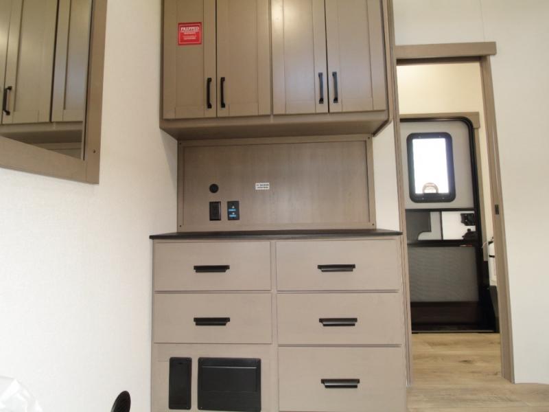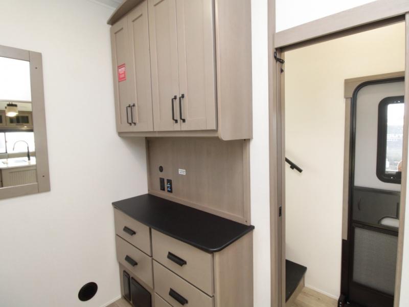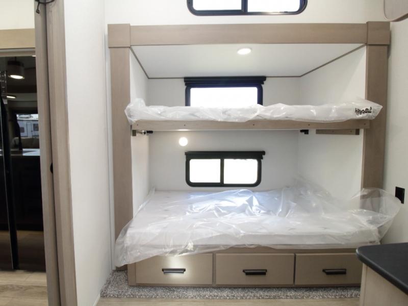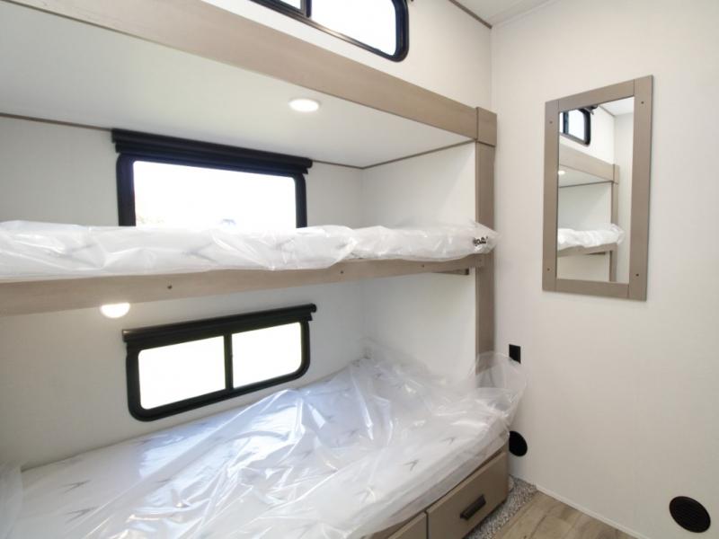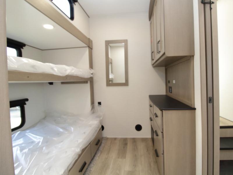 Middle Bunkhouse/Office Flex Room – A multi-purpose space featuring a slide-out with two bunks, storage drawers, and a dresser, ideal for guests, kids, or as a quiet office area.