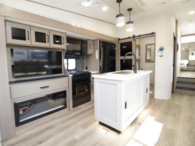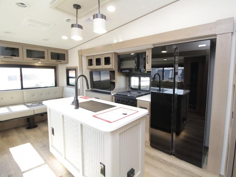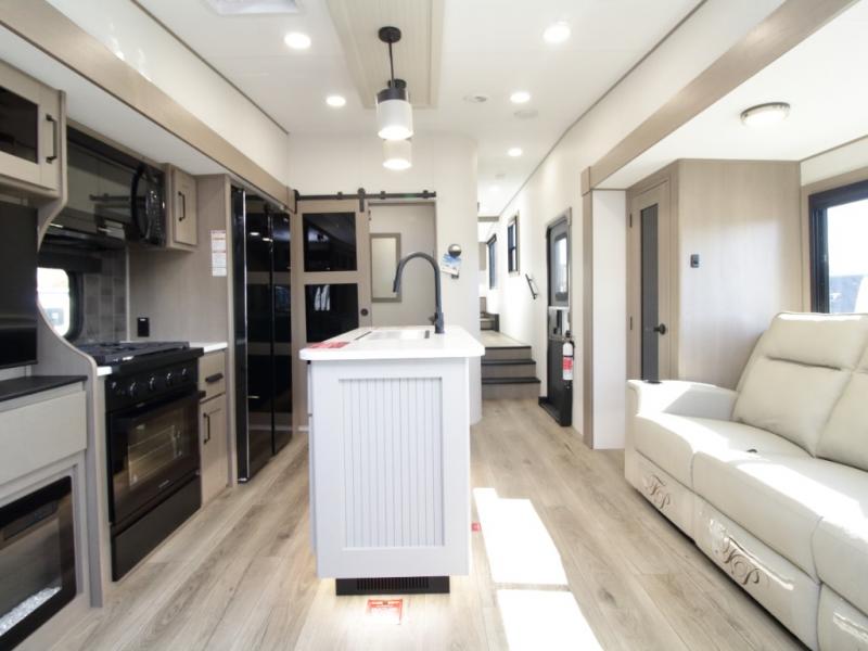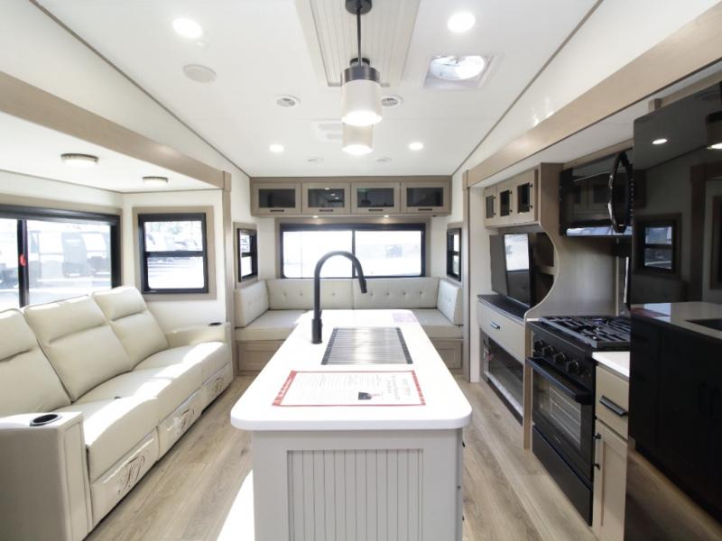 Beautiful fifth wheel with a middle bunkhouse, a spacious kitchen with island, and front private bedroom with a queen sized bed.