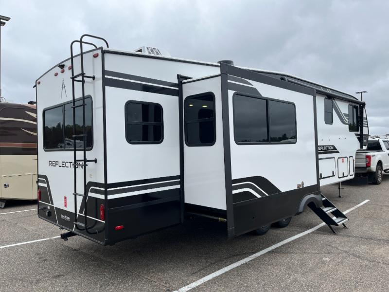 With any Reflection fifth wheel by Grand Design, you will have a solar panel for off-grid camping and a 60 amp charge controller and inverter prep, a Universal All-In-One docking station, unobstructed pass-through storage, and Goodyear Endurance tires. Each is constructed of gel coat exterior sidewalls, residential 5" truss rafters, walk-on roof decking, a fiberglass and radiant foil roof and front cap insulation plus laminated aluminum framed side walls, roof and end walls in slide rooms. Head inside to enjoy residential hardwood cabinet doors, premium Congoleum flooring, a spacious shower with a glass door, and many more comforts!