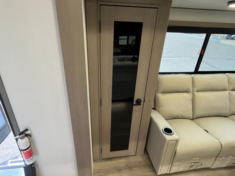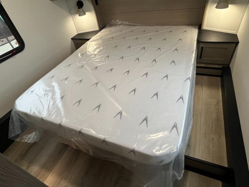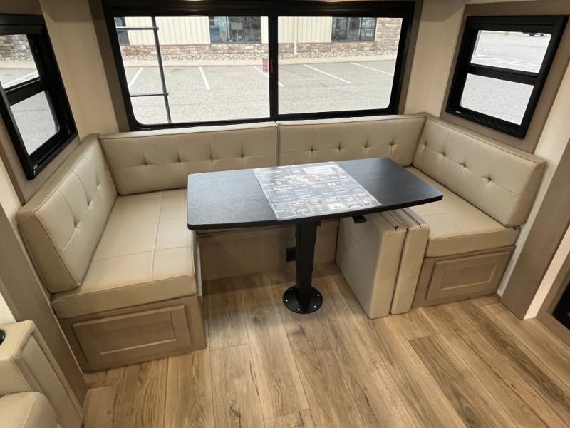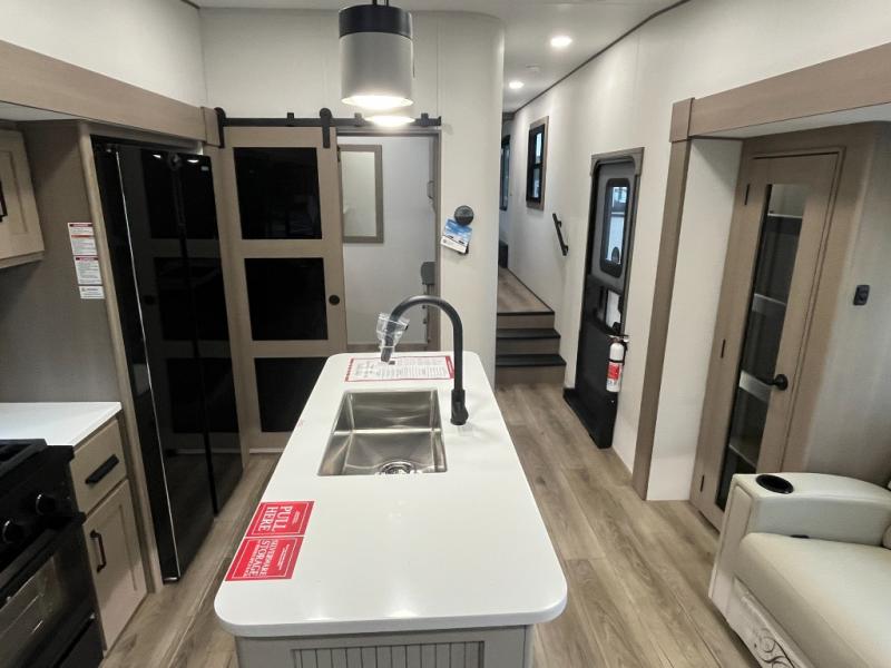 When you are looking for a versatile extra room for either a second bedroom or living area as well as an office, this middle bunkhouse might just work! There is a slide out with two bunks and drawers plus a dresser. You can sleep like a queen on the walk-around bed in the front private bedroom that offers more clothing storage and windows for views. The rear main living and kitchen area provides plenty of seating on the a 78" triple person theater seats, and on the 92" U-shaped lounge with table with windows within the slide for natural lighting and great views. The kitchen island gives the cook more space to make and serve meals, and the gourmet kitchen includes a 16 cu. ft. refrigerator, plus a pantry for dry goods. There is an exterior outside kitchen with a griddle and a 1.6 cu. ft. refrigerator for beverages and such, plus you will find an LP quick connect, Coax TV hookup, and a spray port to wash off your dirty shoes.