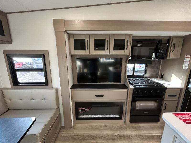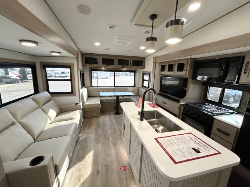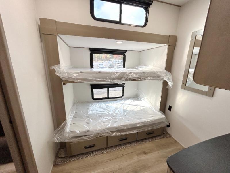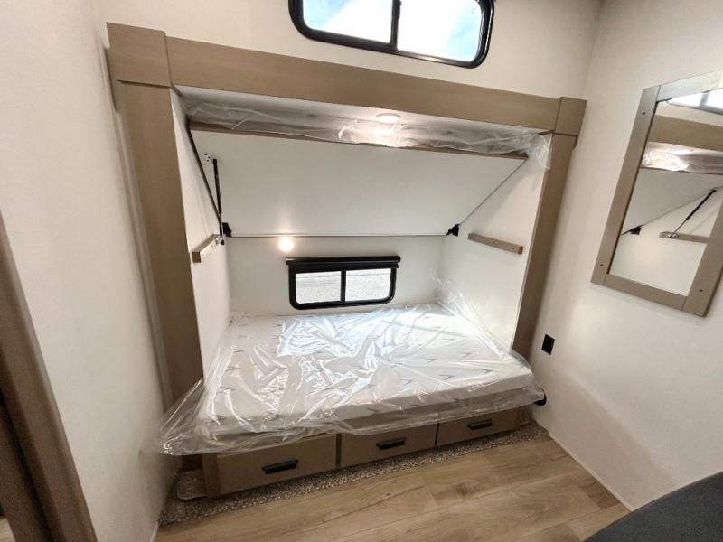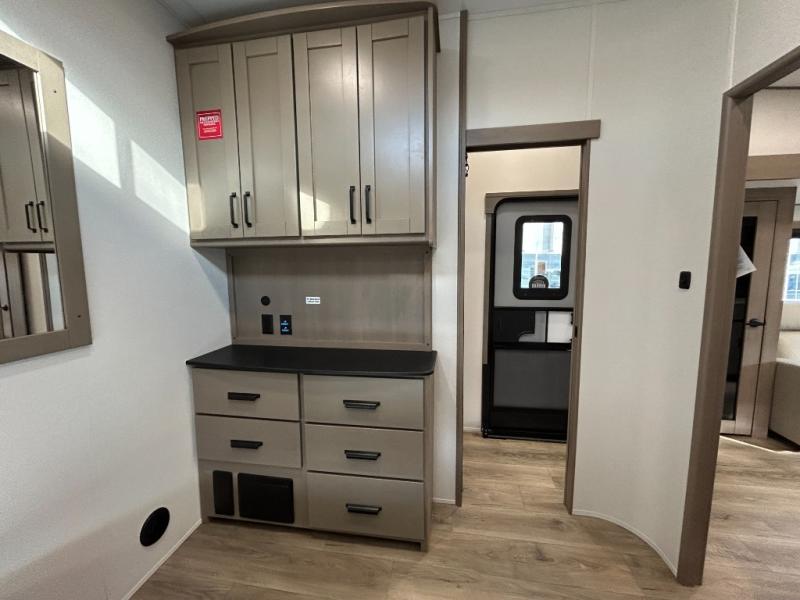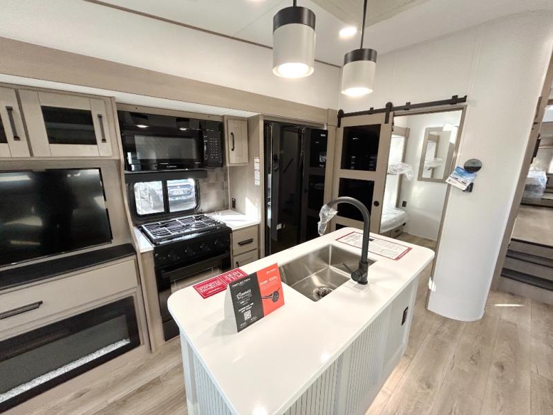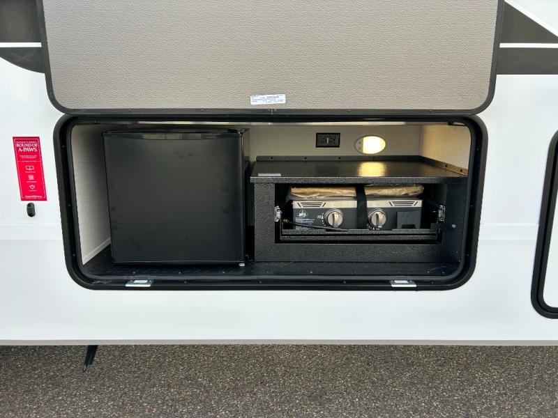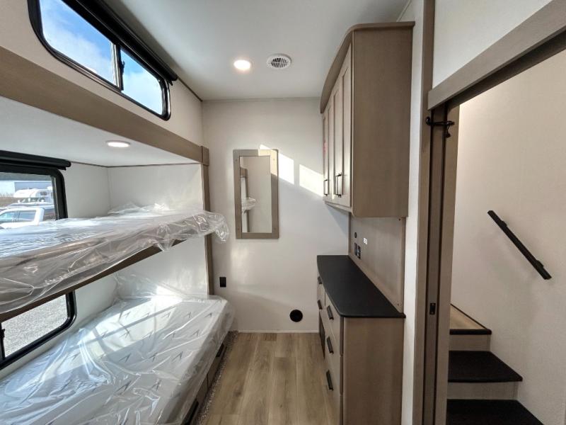 When you are looking for a versatile extra room for either a second bedroom or living area as well as an office, this middle bunkhouse might just work! There is a slide out with two bunks and drawers plus a dresser. You can sleep like a queen on the walk-around bed in the front private bedroom that offers more clothing storage and windows for views. The rear main living and kitchen area provides plenty of seating on the a 78" triple person theater seats, and on the 92" U-shaped lounge with table with windows within the slide for natural lighting and great views. The kitchen island gives the cook more space to make and serve meals, and the gourmet kitchen includes a 16 cu. ft. refrigerator, plus a pantry for dry goods. There is an exterior outside kitchen with a griddle and a 1.6 cu. ft. refrigerator for beverages and such, plus you will find an LP quick connect, Coax TV hookup, and a spray port to wash off your dirty shoes.
