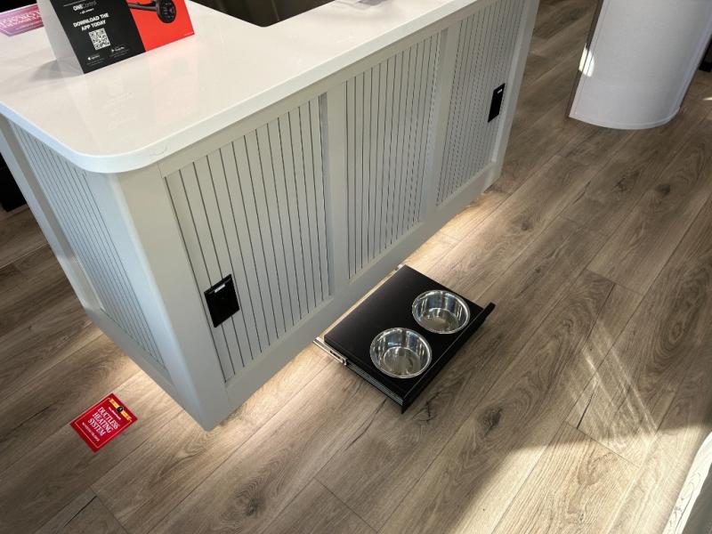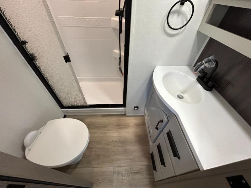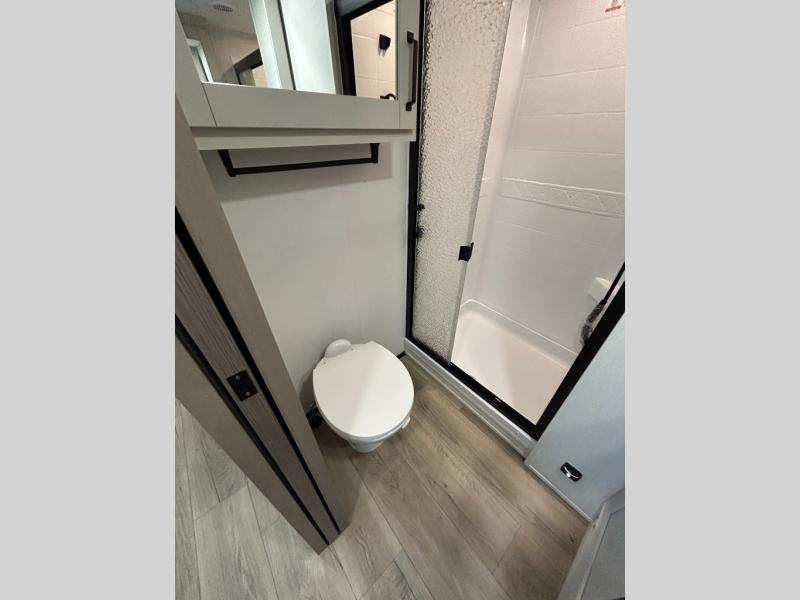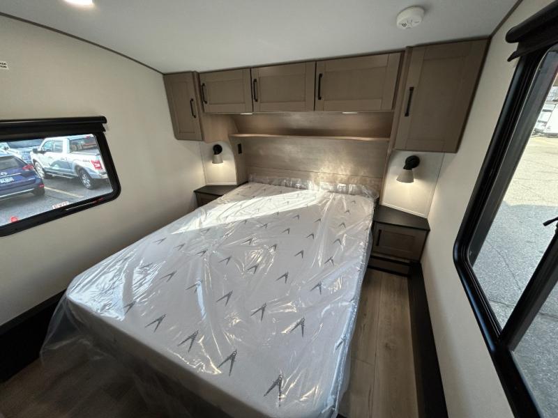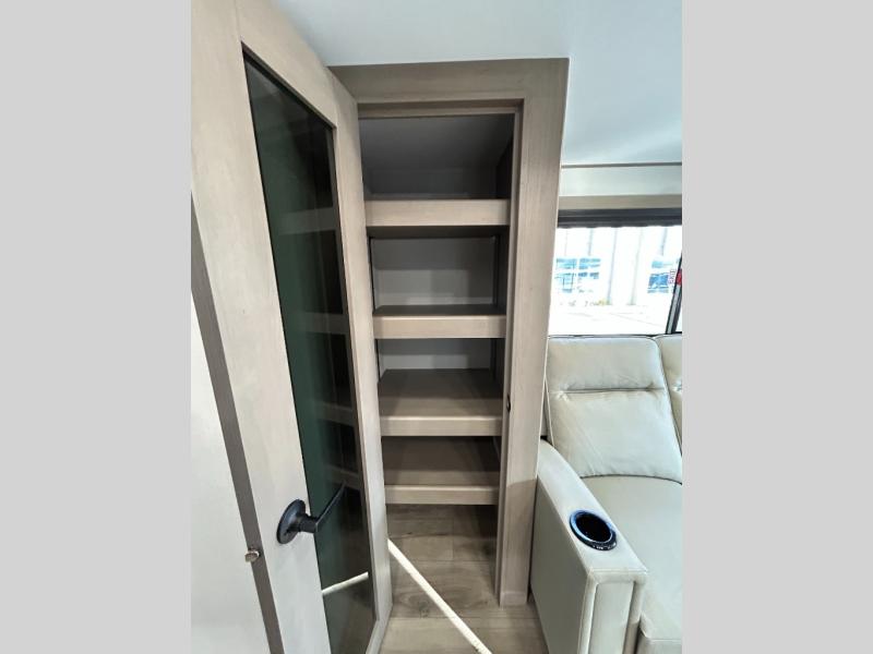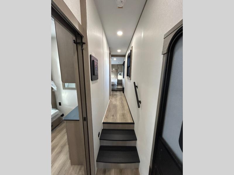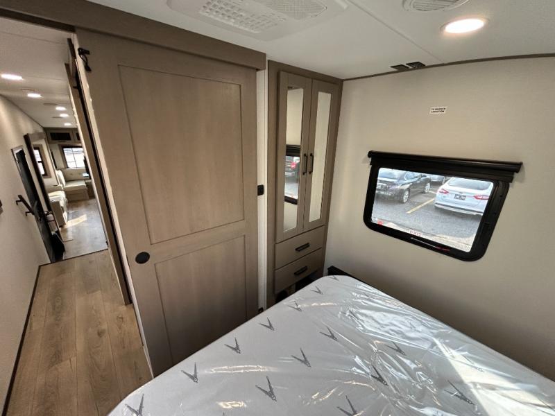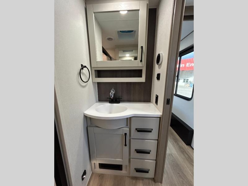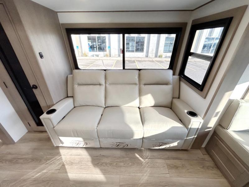 When you are looking for a versatile extra room for either a second bedroom or living area as well as an office, this middle bunkhouse might just work! There is a slide out with two bunks and drawers plus a dresser. You can sleep like a queen on the walk-around bed in the front private bedroom that offers more clothing storage and windows for views. The rear main living and kitchen area provides plenty of seating on the a 78" triple person theater seats, and on the 92" U-shaped lounge with table with windows within the slide for natural lighting and great views. The kitchen island gives the cook more space to make and serve meals, and the gourmet kitchen includes a 16 cu. ft. refrigerator, plus a pantry for dry goods. There is an exterior outside kitchen with a griddle and a 1.6 cu. ft. refrigerator for beverages and such, plus you will find an LP quick connect, Coax TV hookup, and a spray port to wash off your dirty shoes.