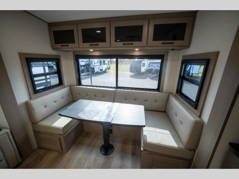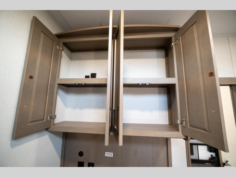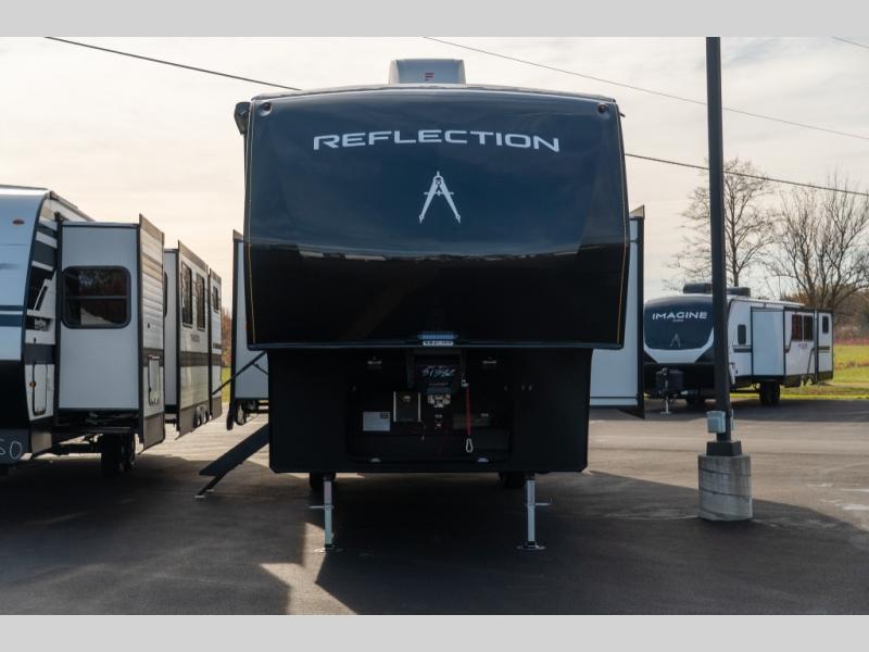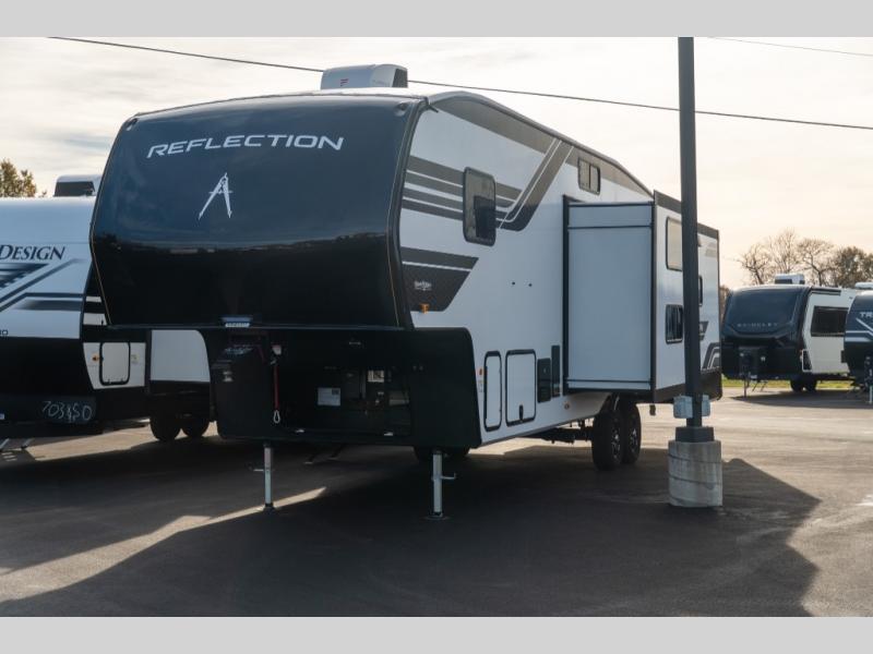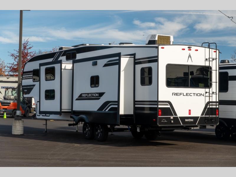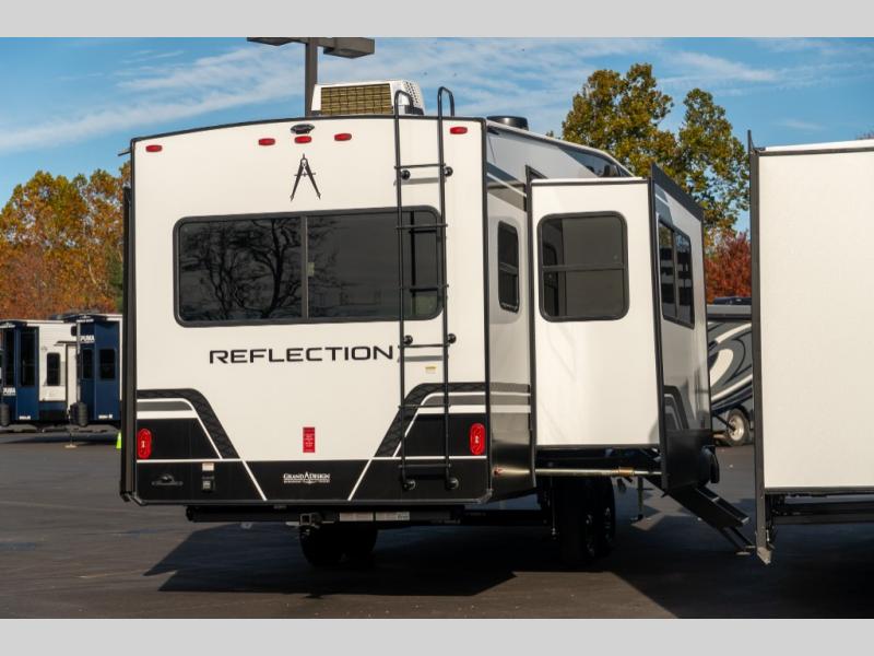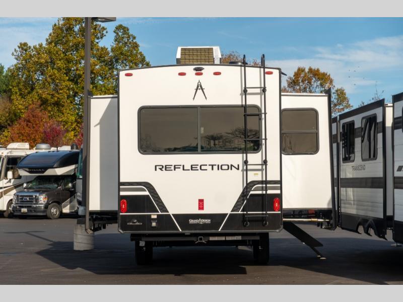 With any Reflection fifth wheel by Grand Design, you will have a solar panel for off-grid camping and a 60 amp charge controller and inverter prep, a Universal All-In-One docking station, unobstructed pass-through storage, and Goodyear Endurance tires. Each is constructed of gel coat exterior sidewalls, residential 5" truss rafters, walk-on roof decking, a fiberglass and radiant foil roof and front cap insulation plus laminated aluminum framed side walls, roof and end walls in slide rooms. Head inside to enjoy residential hardwood cabinet doors, premium Congoleum flooring, a spacious shower with a glass door, and many more comforts!