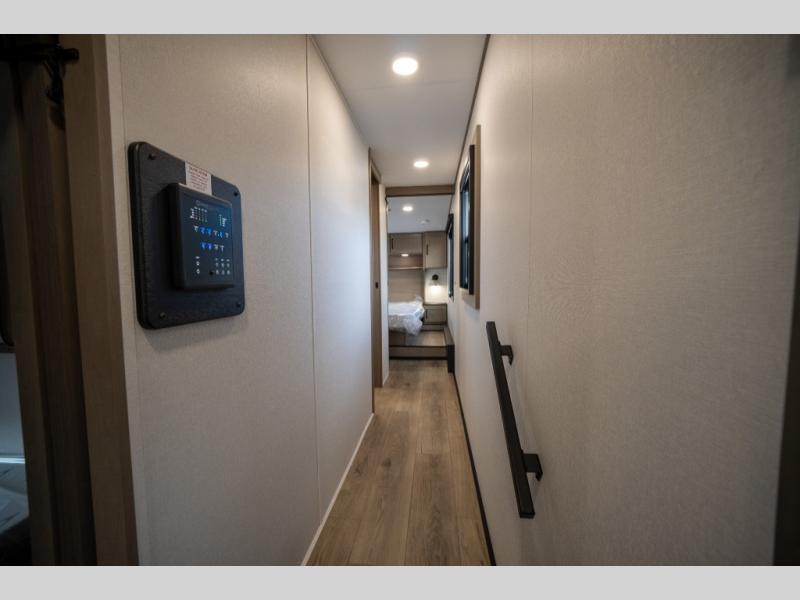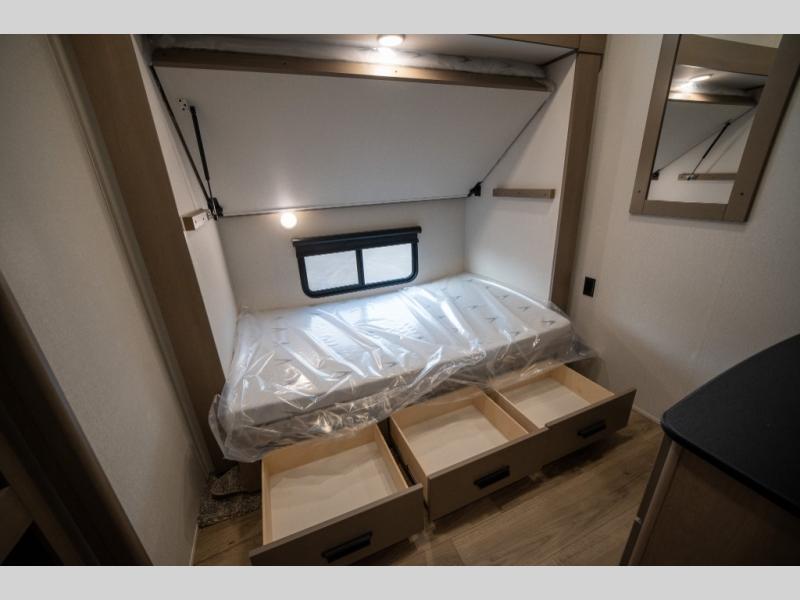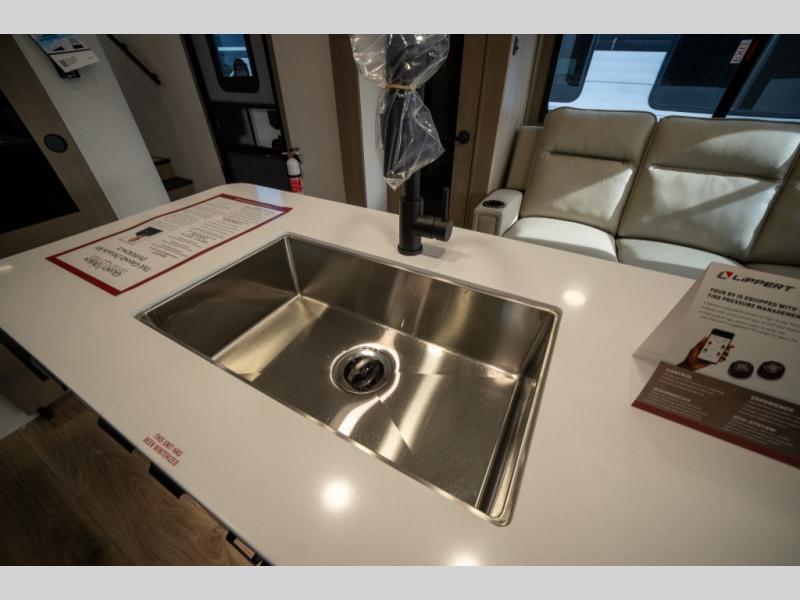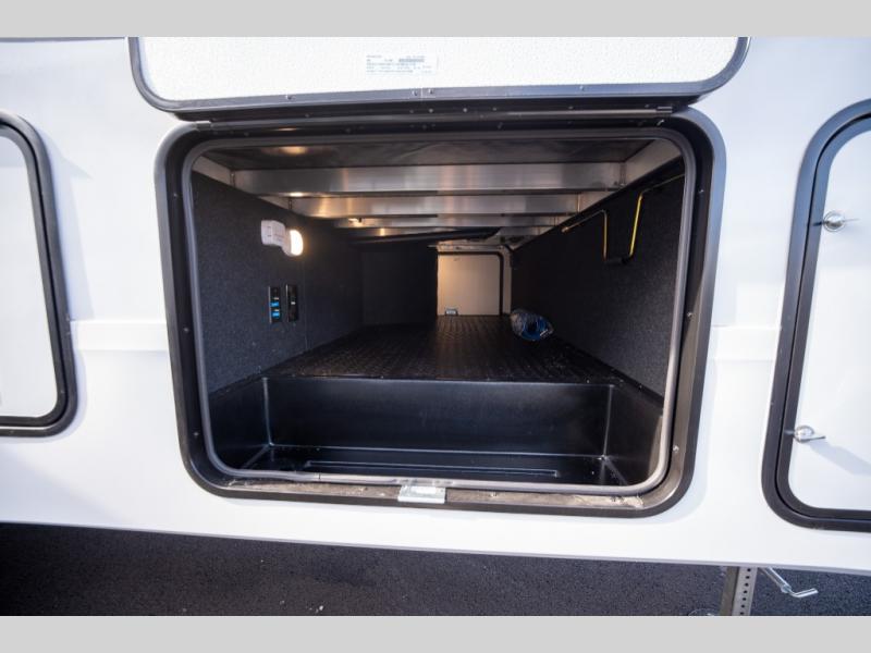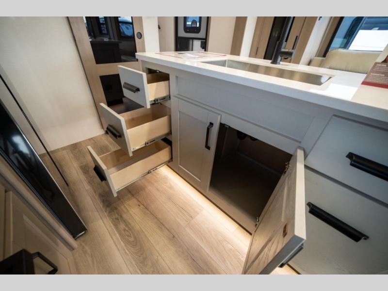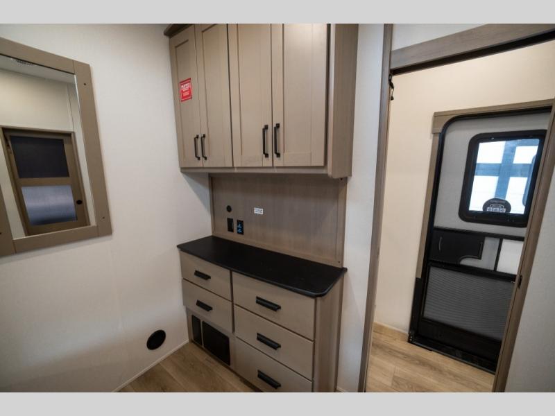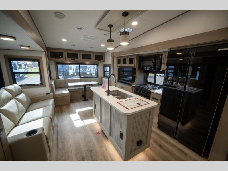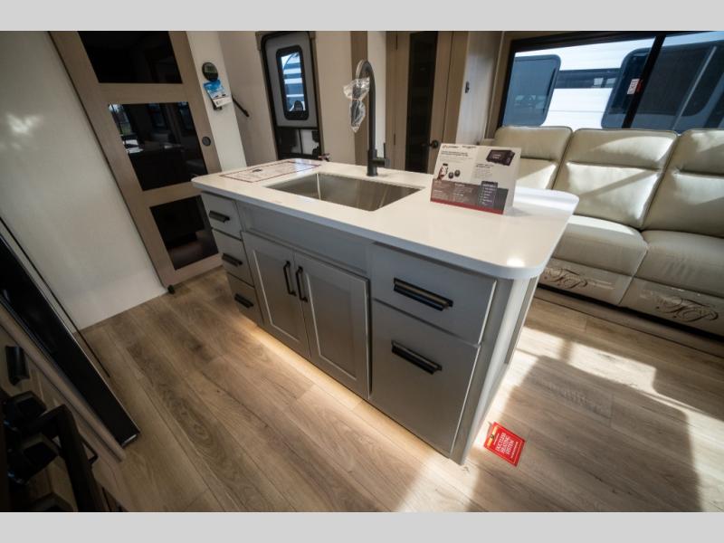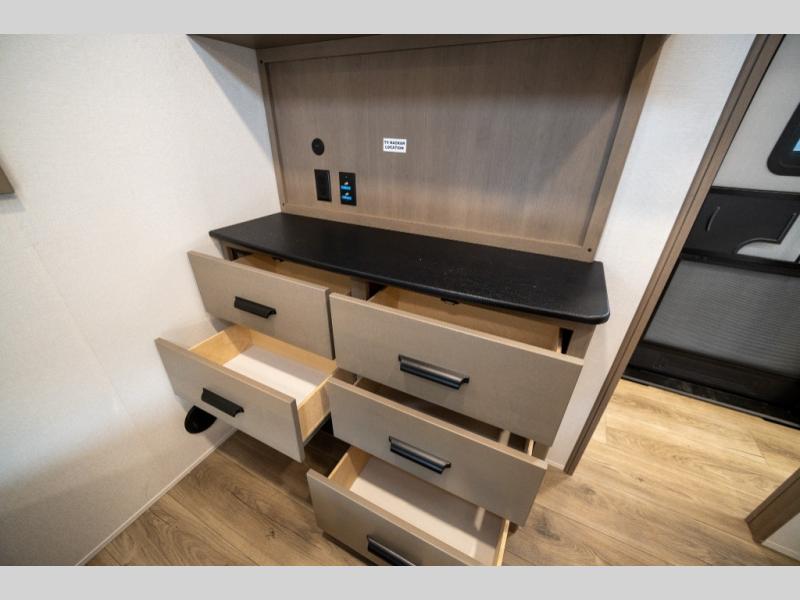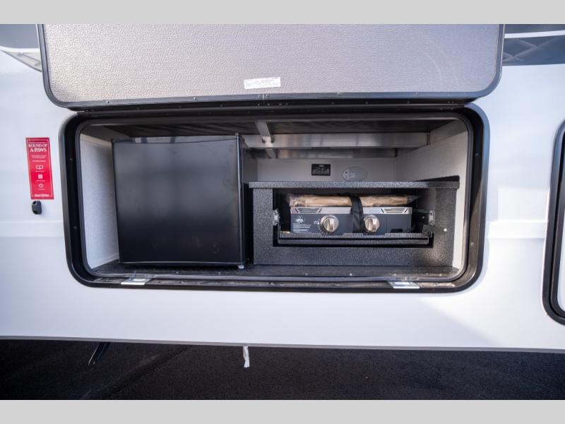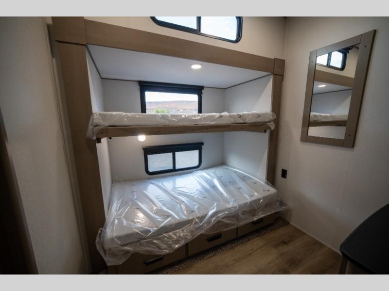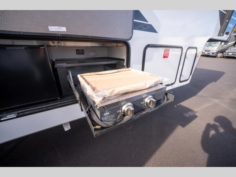When you are looking for a versatile extra room for either a second bedroom or living area as well as an office, this middle bunkhouse might just work! There is a slide out with two bunks and drawers plus a dresser. You can sleep like a queen on the walk-around bed in the front private bedroom that offers more clothing storage and windows for views. The rear main living and kitchen area provides plenty of seating on the a 78" triple person theater seats, and on the 92" U-shaped lounge with table with windows within the slide for natural lighting and great views. The kitchen island gives the cook more space to make and serve meals, and the gourmet kitchen includes a 16 cu. ft. refrigerator, plus a pantry for dry goods. There is an exterior outside kitchen with a griddle and a 1.6 cu. ft. refrigerator for beverages and such, plus you will find an LP quick connect, Coax TV hookup, and a spray port to wash off your dirty shoes.