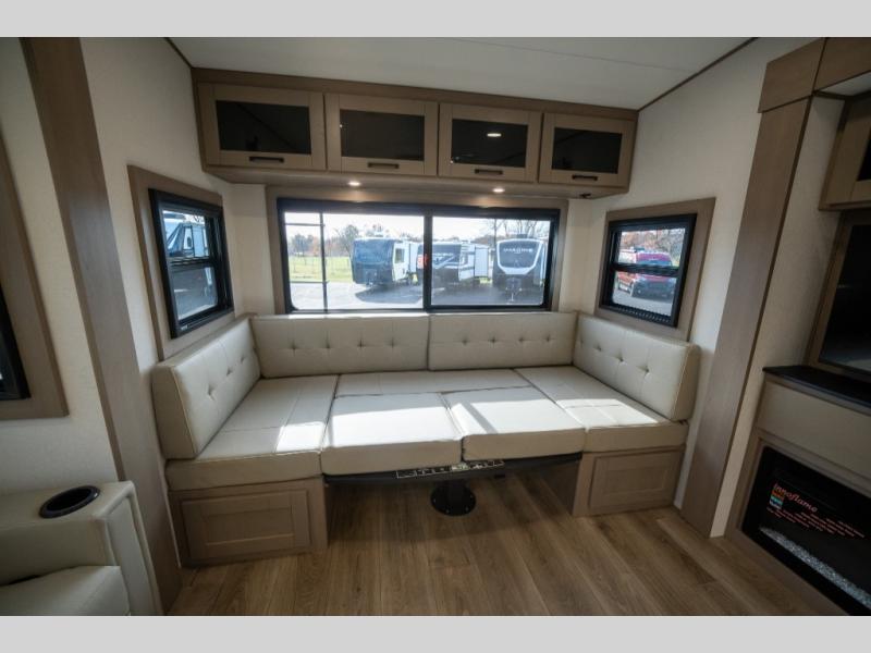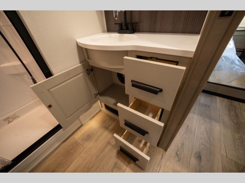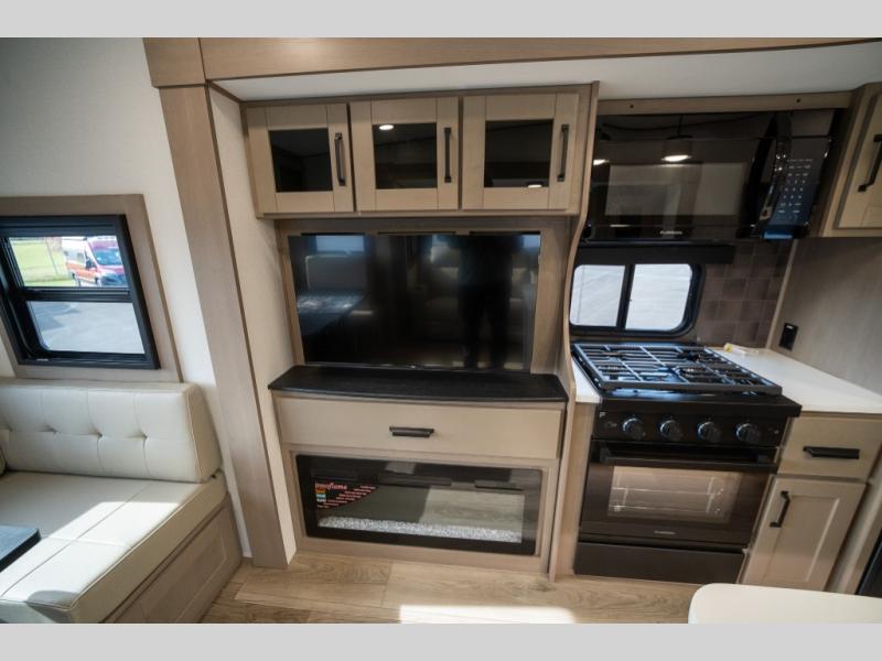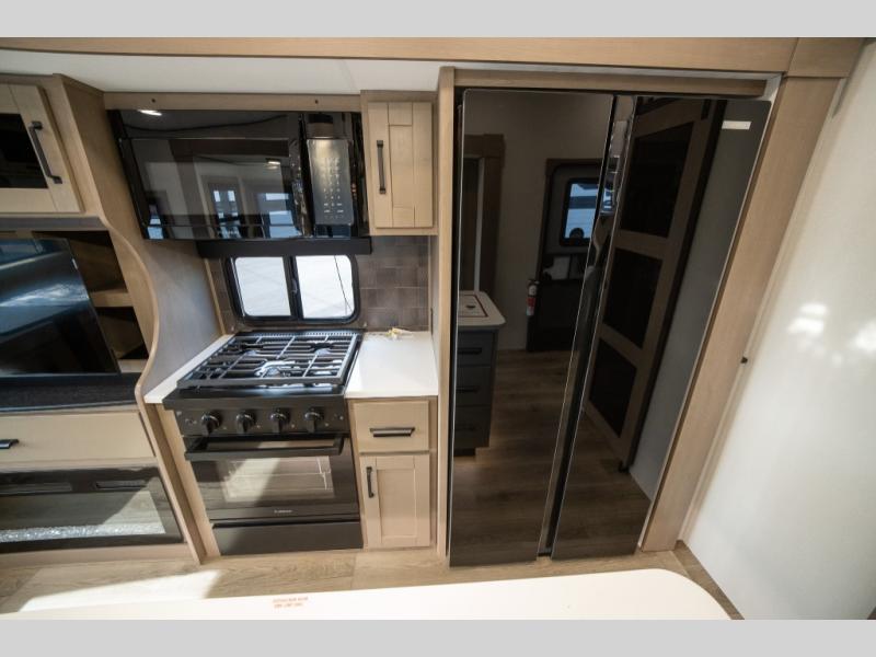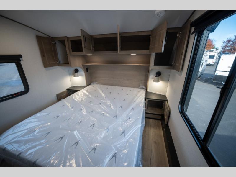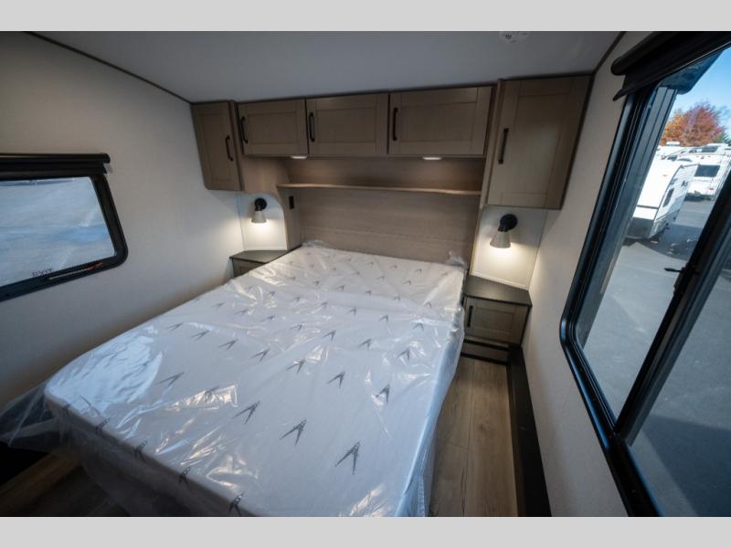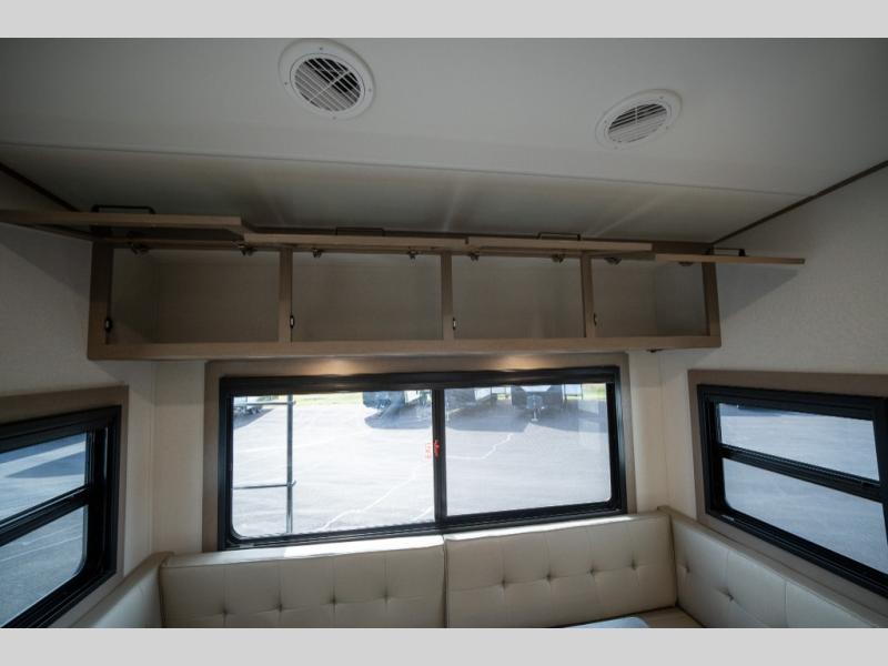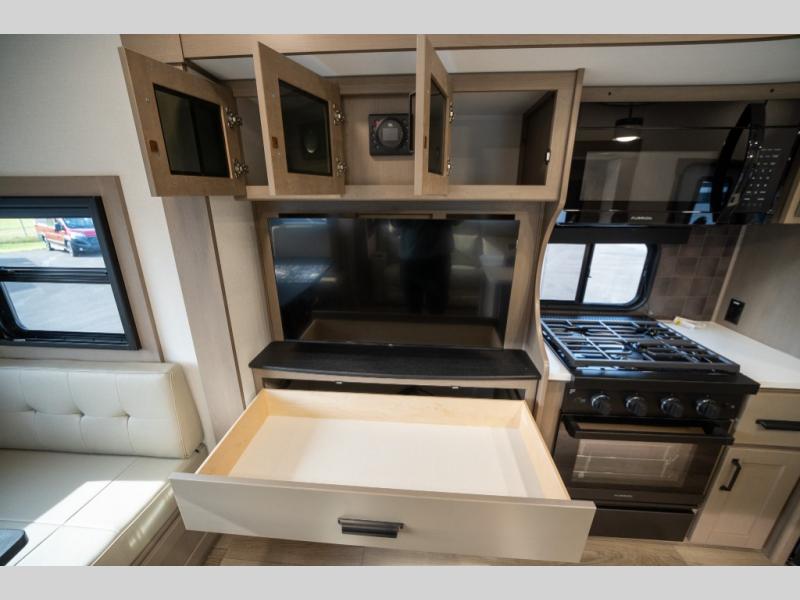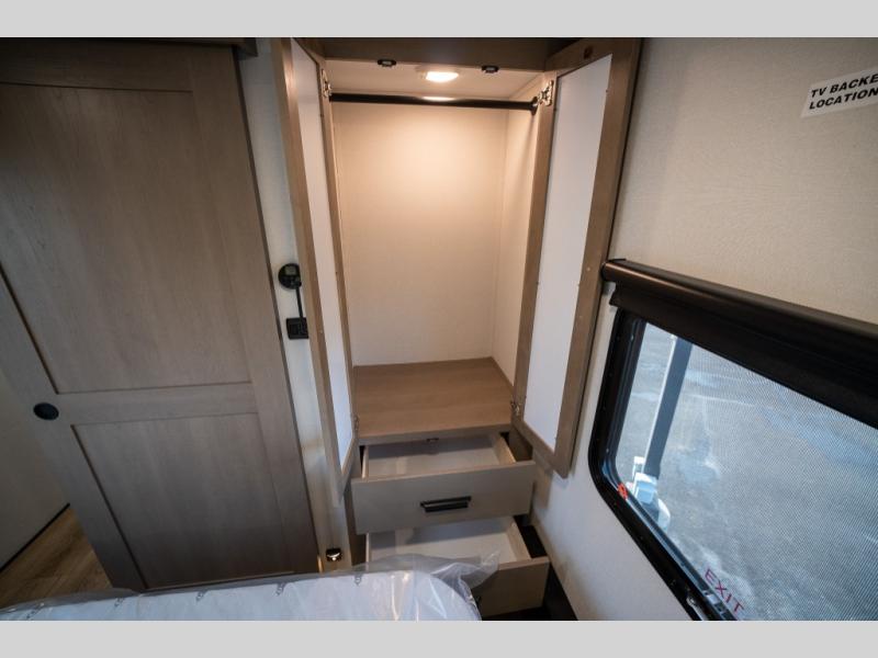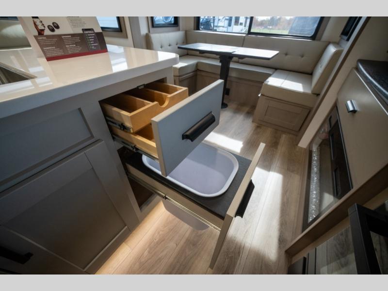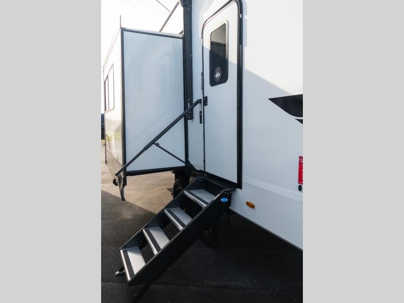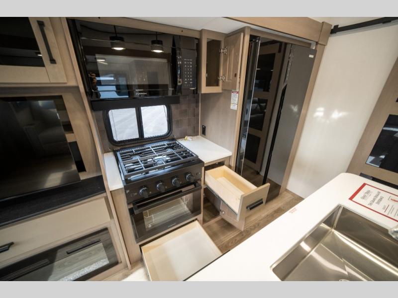 When you are looking for a versatile extra room for either a second bedroom or living area as well as an office, this middle bunkhouse might just work! There is a slide out with two bunks and drawers plus a dresser. You can sleep like a queen on the walk-around bed in the front private bedroom that offers more clothing storage and windows for views. The rear main living and kitchen area provides plenty of seating on the a 78" triple person theater seats, and on the 92" U-shaped lounge with table with windows within the slide for natural lighting and great views. The kitchen island gives the cook more space to make and serve meals, and the gourmet kitchen includes a 16 cu. ft. refrigerator, plus a pantry for dry goods. There is an exterior outside kitchen with a griddle and a 1.6 cu. ft. refrigerator for beverages and such, plus you will find an LP quick connect, Coax TV hookup, and a spray port to wash off your dirty shoes.