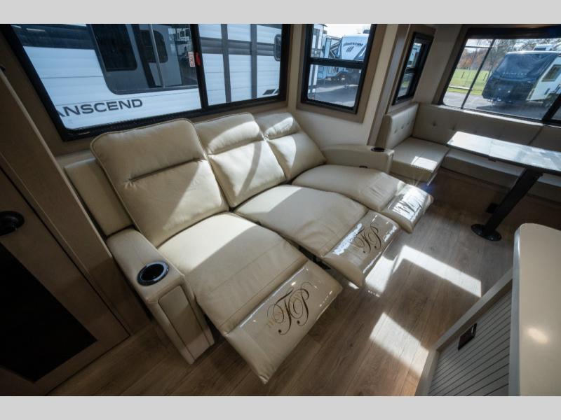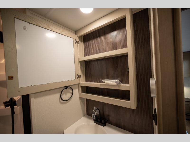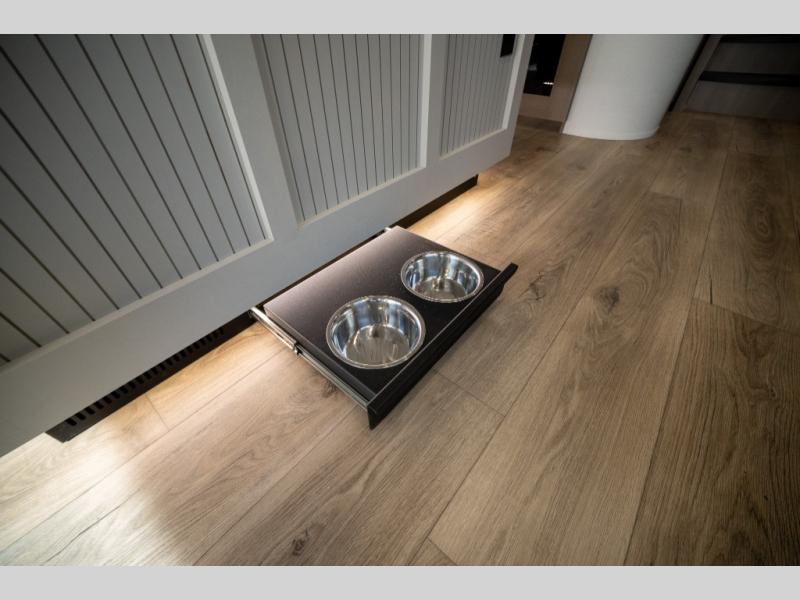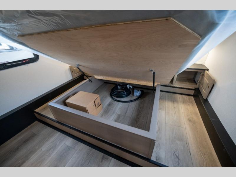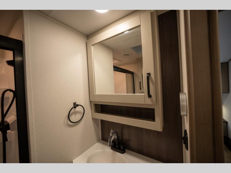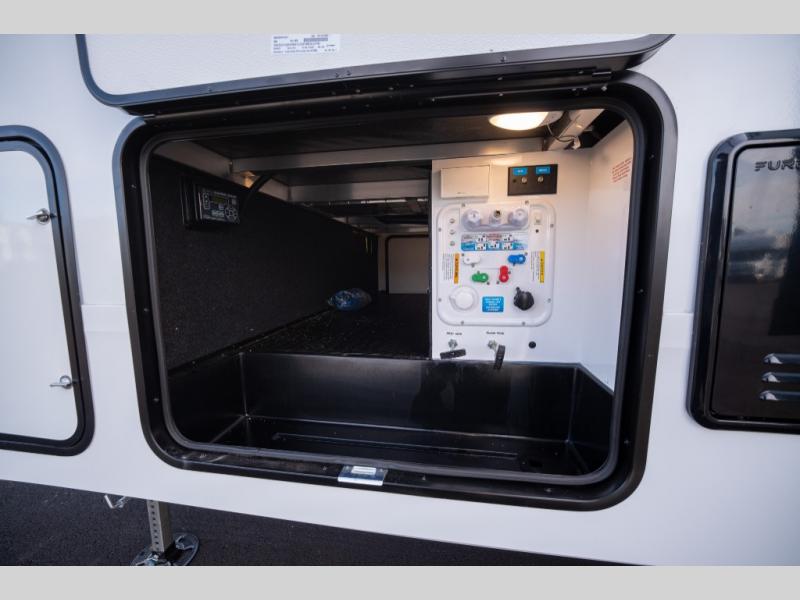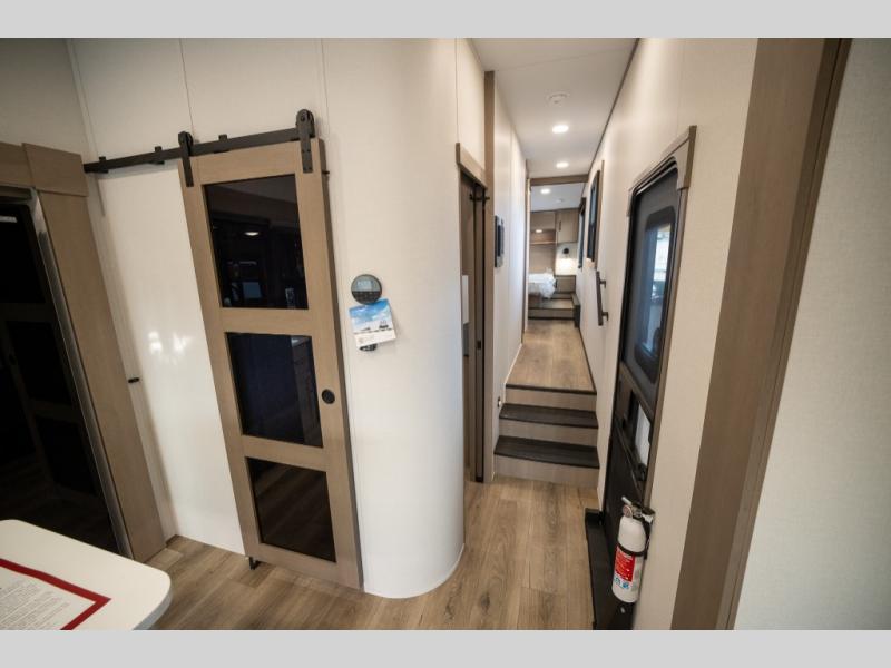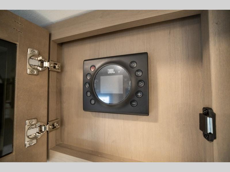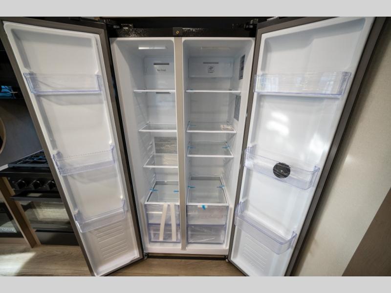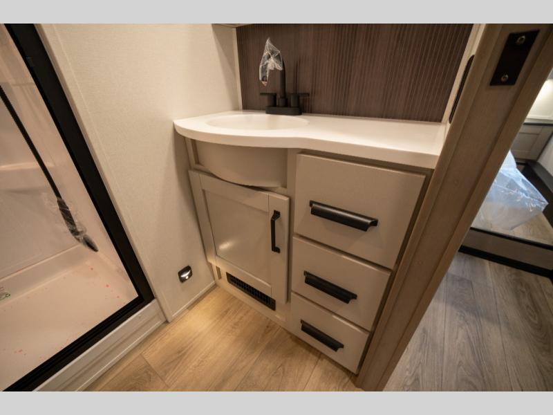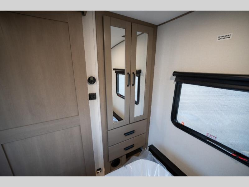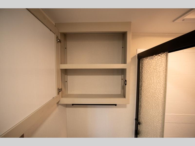 When you are looking for a versatile extra room for either a second bedroom or living area as well as an office, this middle bunkhouse might just work! There is a slide out with two bunks and drawers plus a dresser. You can sleep like a queen on the walk-around bed in the front private bedroom that offers more clothing storage and windows for views. The rear main living and kitchen area provides plenty of seating on the a 78" triple person theater seats, and on the 92" U-shaped lounge with table with windows within the slide for natural lighting and great views. The kitchen island gives the cook more space to make and serve meals, and the gourmet kitchen includes a 16 cu. ft. refrigerator, plus a pantry for dry goods. There is an exterior outside kitchen with a griddle and a 1.6 cu. ft. refrigerator for beverages and such, plus you will find an LP quick connect, Coax TV hookup, and a spray port to wash off your dirty shoes.