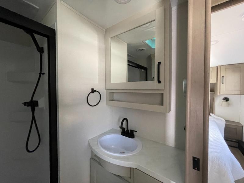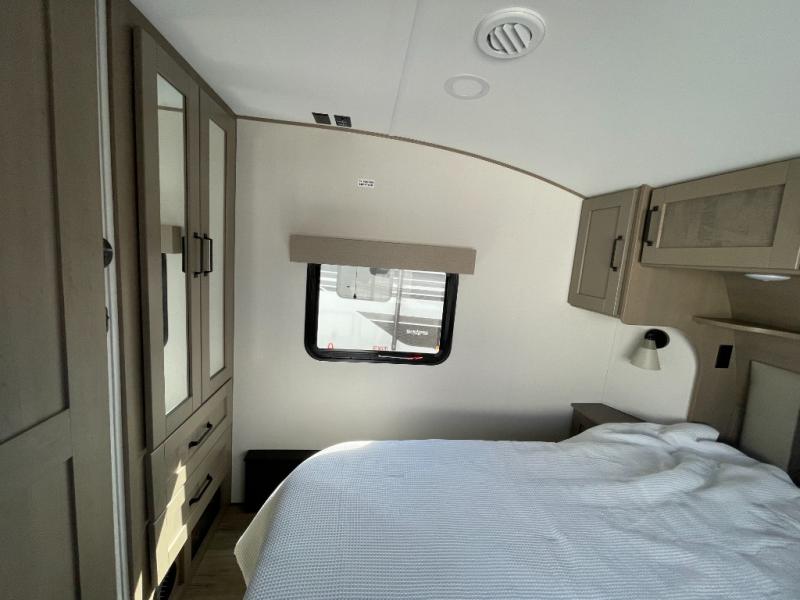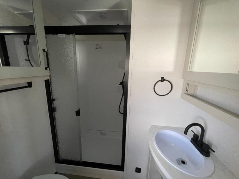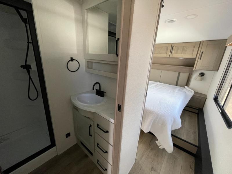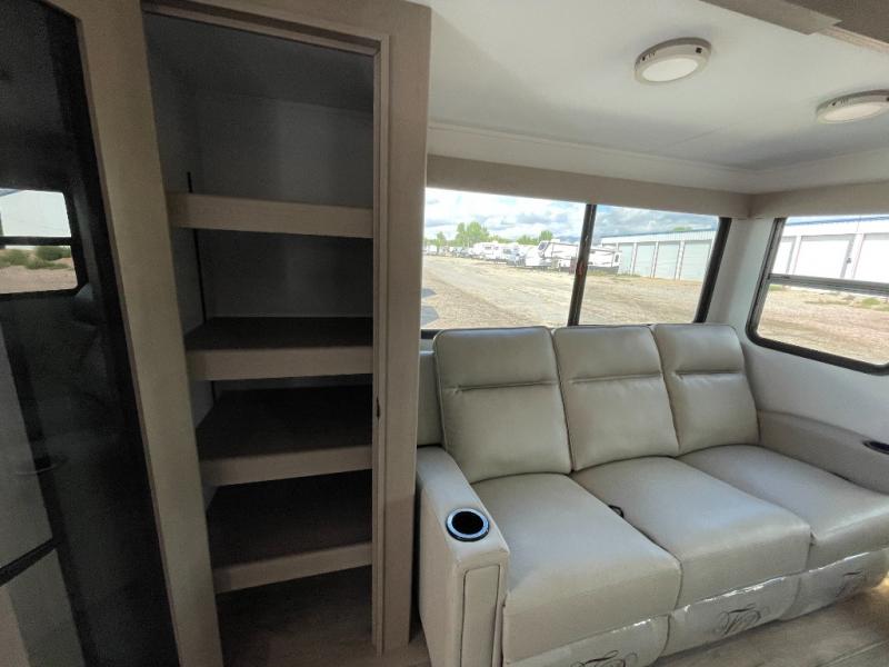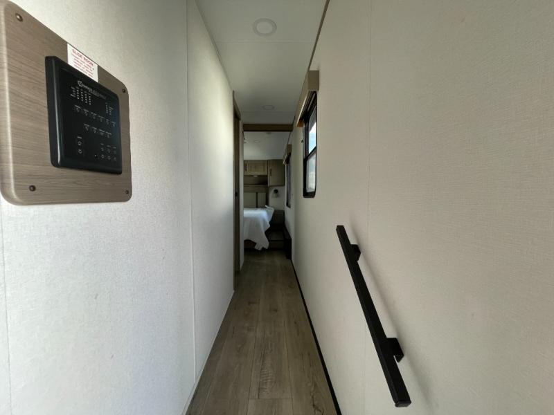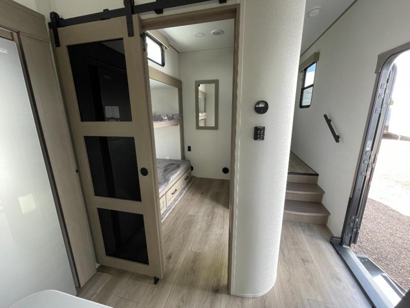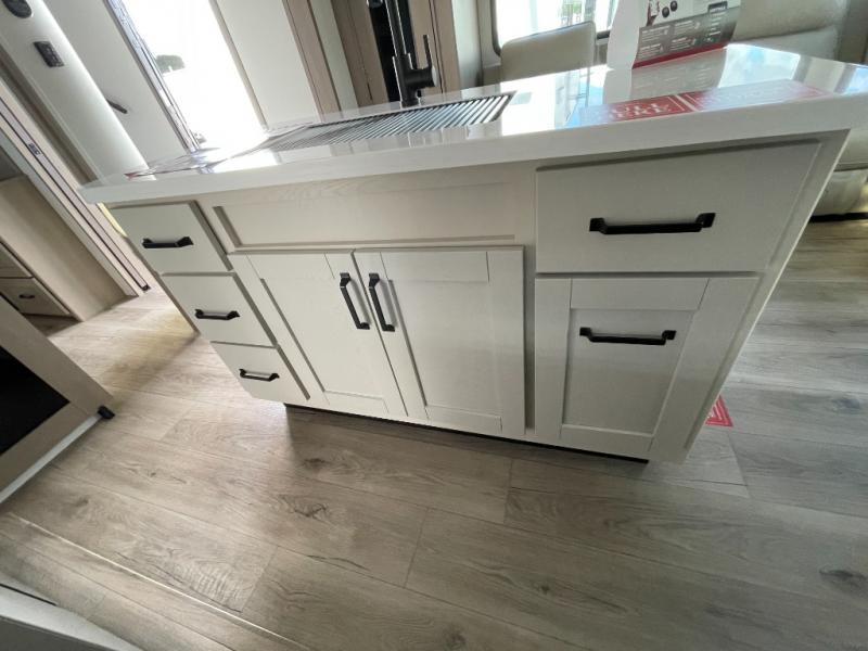 When you are looking for a versatile extra room for either a second bedroom or living area as well as an office, this middle bunkhouse might just work! There is a slide out with two bunks and drawers plus a dresser. You can sleep like a queen on the walk-around bed in the front private bedroom that offers more clothing storage and windows for views. The rear main living and kitchen area provides plenty of seating on the a 78" triple person theater seats, and on the 92" U-shaped lounge with table with windows within the slide for natural lighting and great views. The kitchen island gives the cook more space to make and serve meals, and the gourmet kitchen includes a 16 cu. ft. refrigerator, plus a pantry for dry goods. There is an exterior outside kitchen with a griddle and a 1.6 cu. ft. refrigerator for beverages and such, plus you will find an LP quick connect, Coax TV hookup, and a spray port to wash off your dirty shoes.