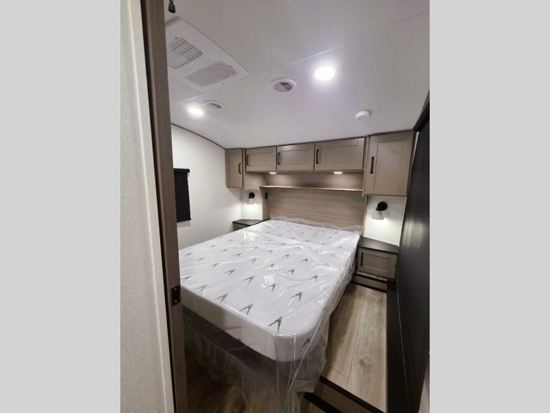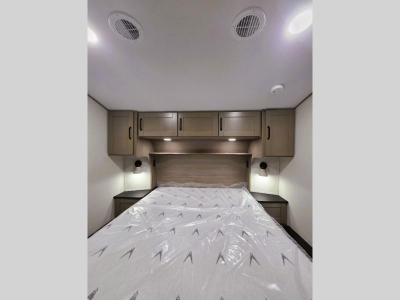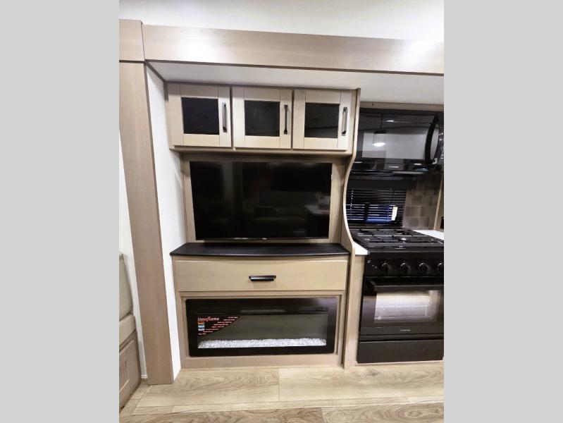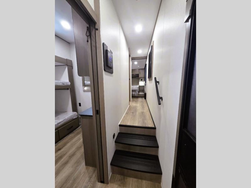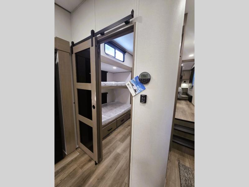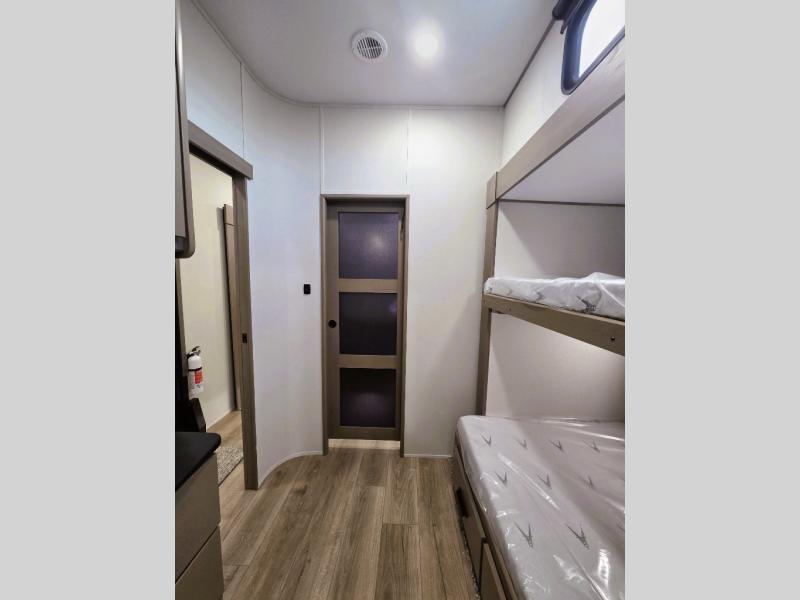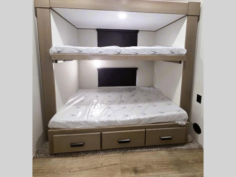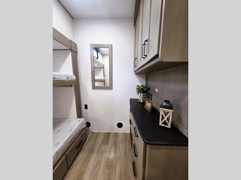 When you are looking for a versatile extra room for either a second bedroom or living area as well as an office, this middle bunkhouse might just work! There is a slide out with two bunks and drawers plus a dresser. You can sleep like a queen on the walk-around bed in the front private bedroom that offers more clothing storage and windows for views. The rear main living and kitchen area provides plenty of seating on the a 78" triple person theater seats, and on the 92" U-shaped lounge with table with windows within the slide for natural lighting and great views. The kitchen island gives the cook more space to make and serve meals, and the gourmet kitchen includes a 16 cu. ft. refrigerator, plus a pantry for dry goods. There is an exterior outside kitchen with a griddle and a 1.6 cu. ft. refrigerator for beverages and such, plus you will find an LP quick connect, Coax TV hookup, and a spray port to wash off your dirty shoes.