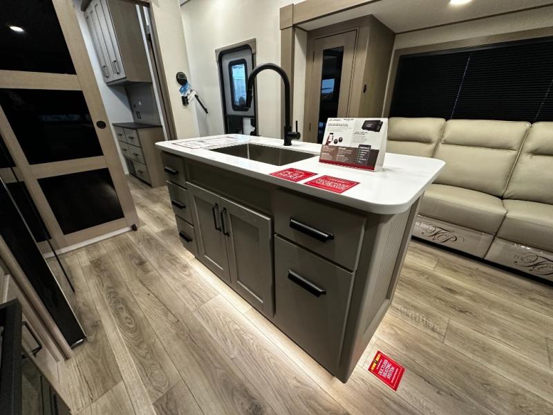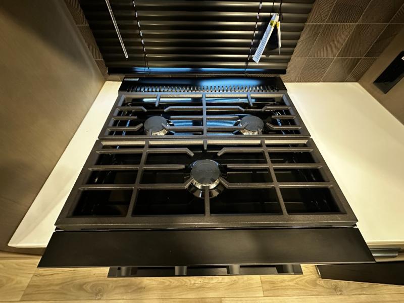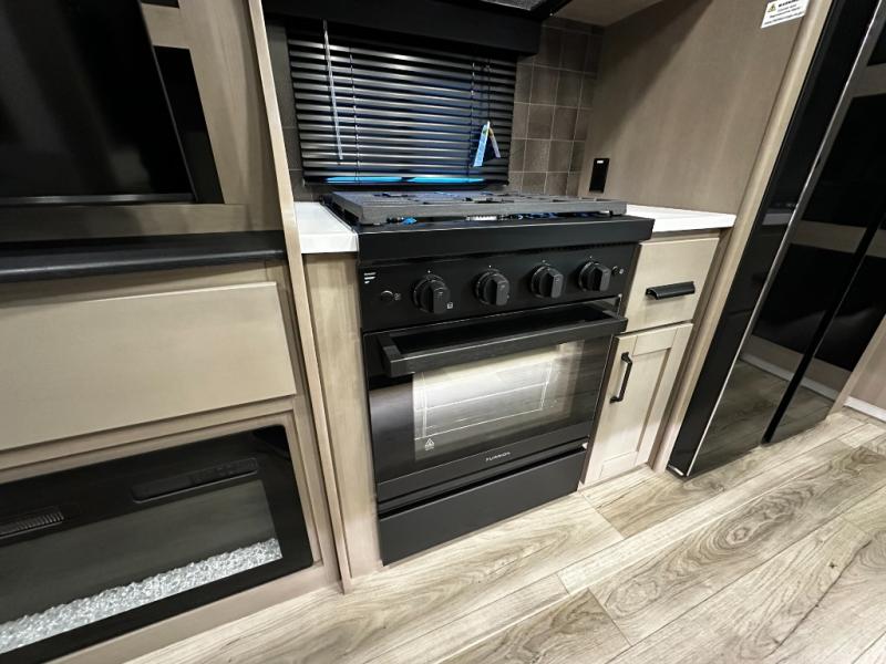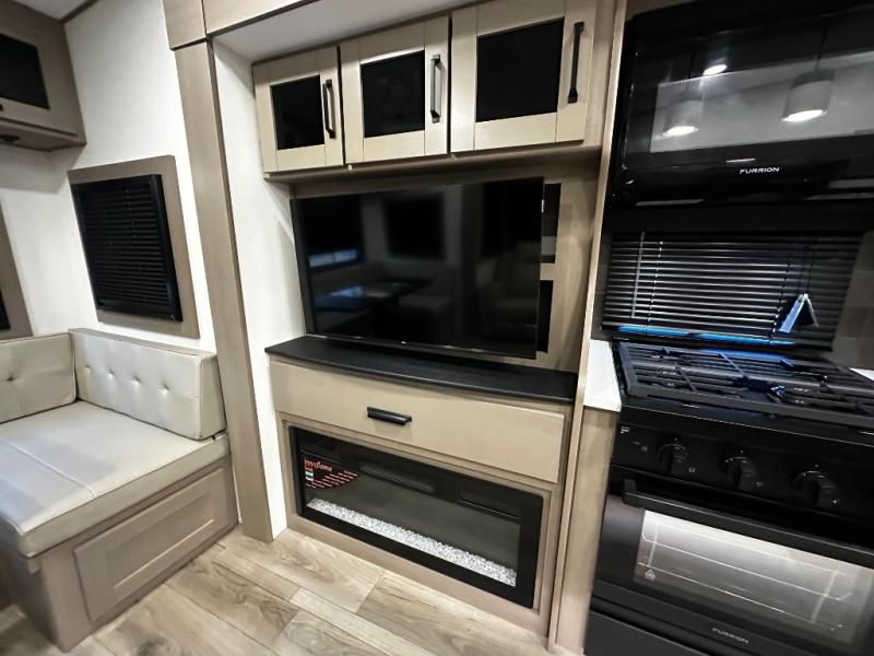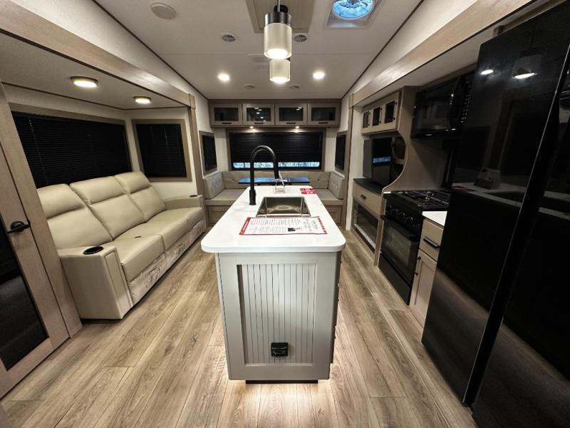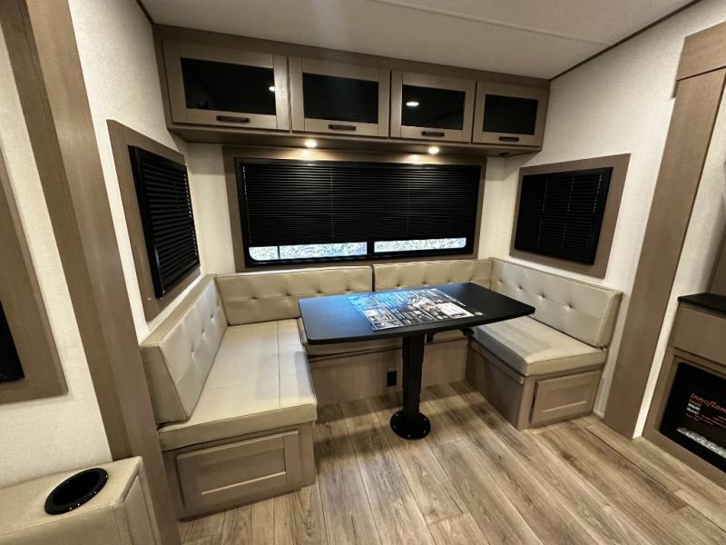 The kitchen is designed for real-life cooking, featuring solid-surface countertops, a residential-style refrigerator, three-burner cooktop, oven, and a large kitchen island for prep and storage. A free-standing dinette offers a comfortable place to enjoy meals or work on the go. The thoughtful layout flows seamlessly into the living space, making this fifth wheel feel spacious and inviting.
