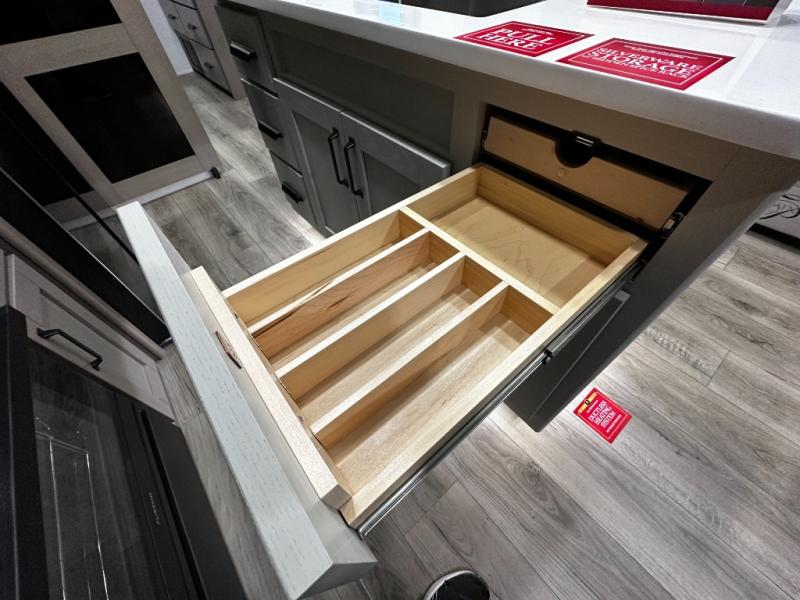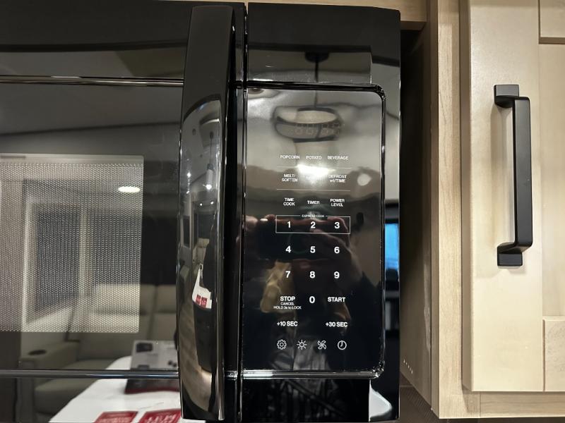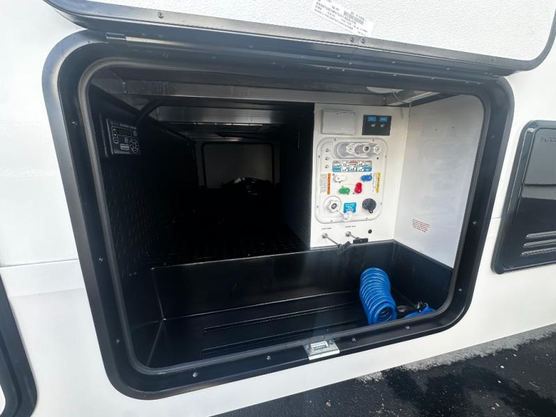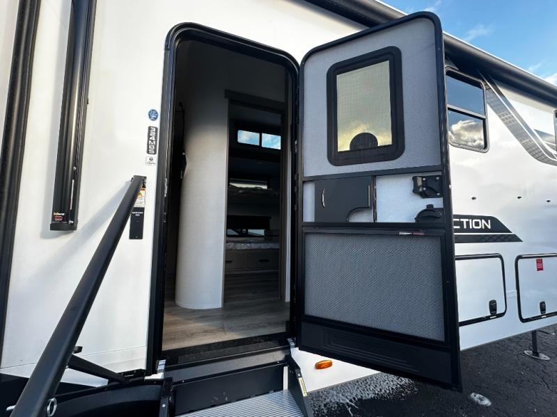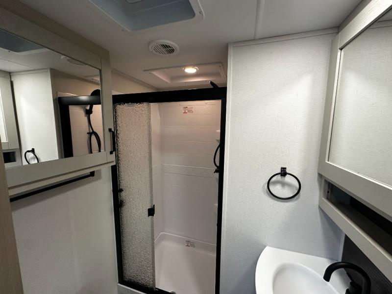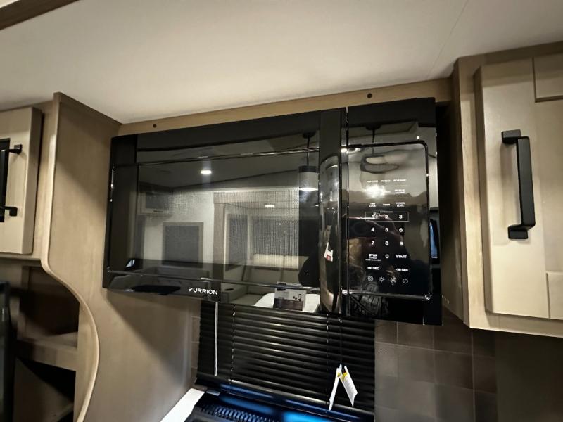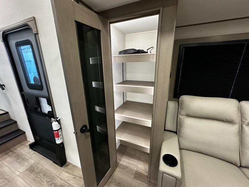 Step inside and you’re welcomed by a bright, open living area with large panoramic windows, theater seating, and a tri-fold sleeper sofa, creating a comfortable space for relaxing or entertaining. The heart of the Reflection 324MBS is its versatile mid-bunk room, which can function as a second bedroom, office, or hobby space. With a fold-down bunk, desk area, and overhead storage, this room adapts effortlessly to your lifestyle—perfect for kids, guests, or remote work while traveling.
