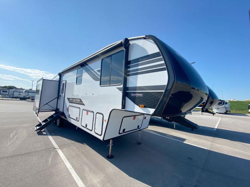 With any Reflection fifth wheel by Grand Design, you will have a solar panel for off-grid camping and a 60 amp charge controller and inverter prep, a Universal All-In-One docking station, unobstructed pass-through storage, and Goodyear Endurance tires. Each is constructed of gel coat exterior sidewalls, residential 5" truss rafters, walk-on roof decking, a fiberglass and radiant foil roof and front cap insulation plus laminated aluminum framed side walls, roof and end walls in slide rooms. Head inside to enjoy residential hardwood cabinet doors, premium Congoleum flooring, a spacious shower with a glass door, and many more comforts!